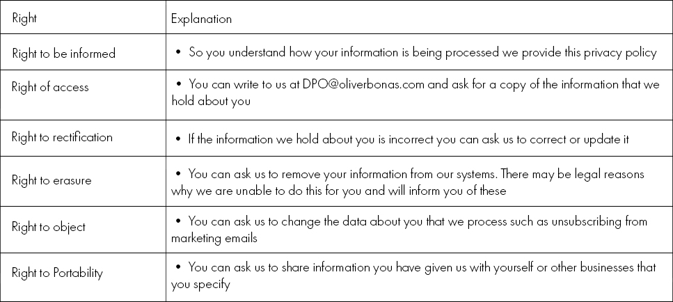 In order to comply with other legislations we may not be able to carry out some requests and we will inform you if this is the case for your request. For example, we may not be able to anonymise or delete your data fully if you have made a purchase with Oliver Bonas in the last 7 years or if you have an order with us that has not yet been completed under our contract with you.
