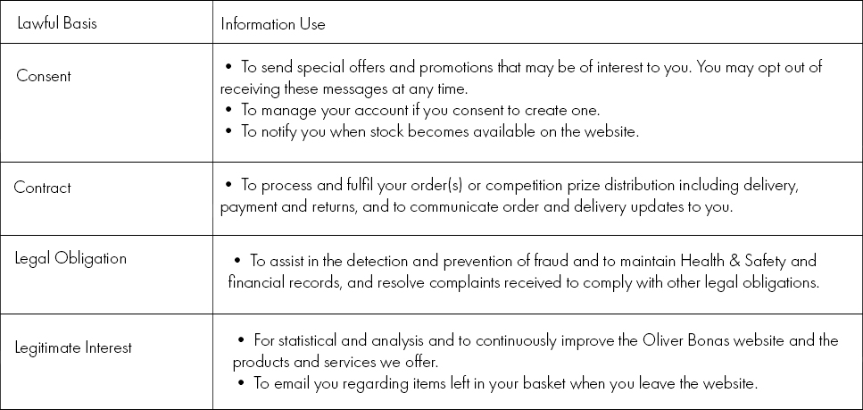 We ask you for this information so that we can make your shopping experience as easy and enjoyable as possible and to offer you benefits of having an account with us or receiving marketing communications if you choose to. This information is processed under lawful basis in the following ways. This is not an exhaustive list: