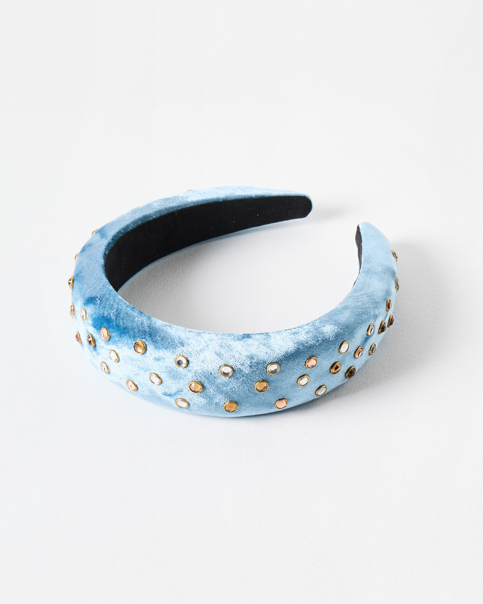 Puffy fabric headband made from light blue velvet embellished with colourful gems.