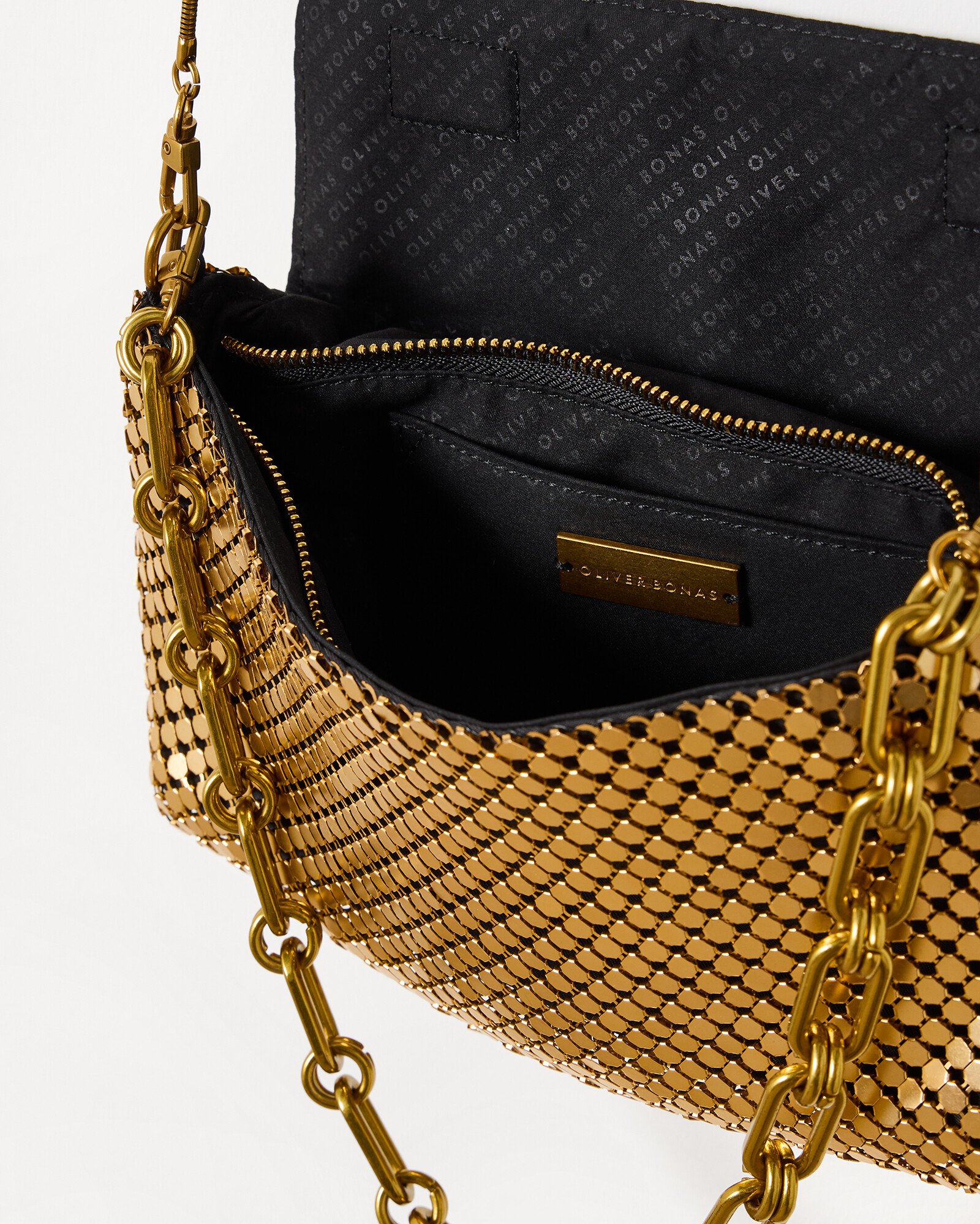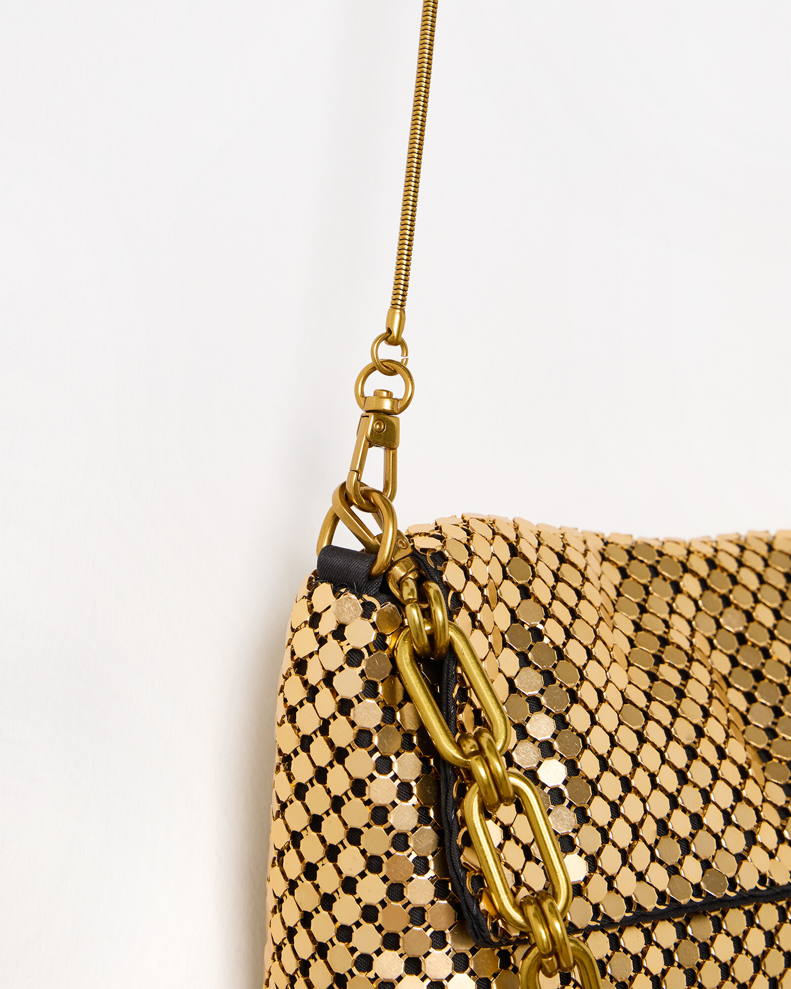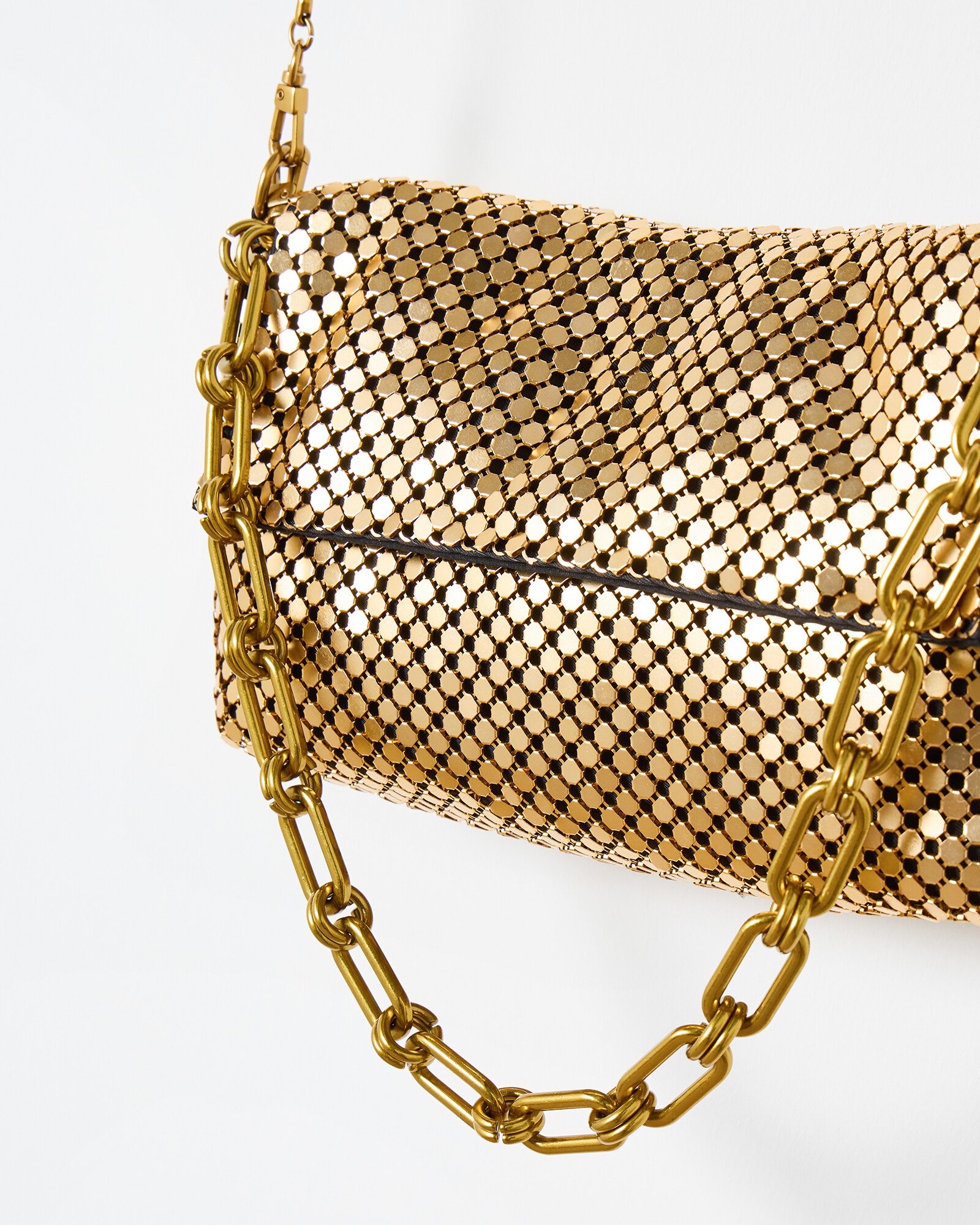 Gold crossbody bag with a metallic chainmail-inspired design and black fabric lining. Wear as a clutch or use the slim crossbody strap.
