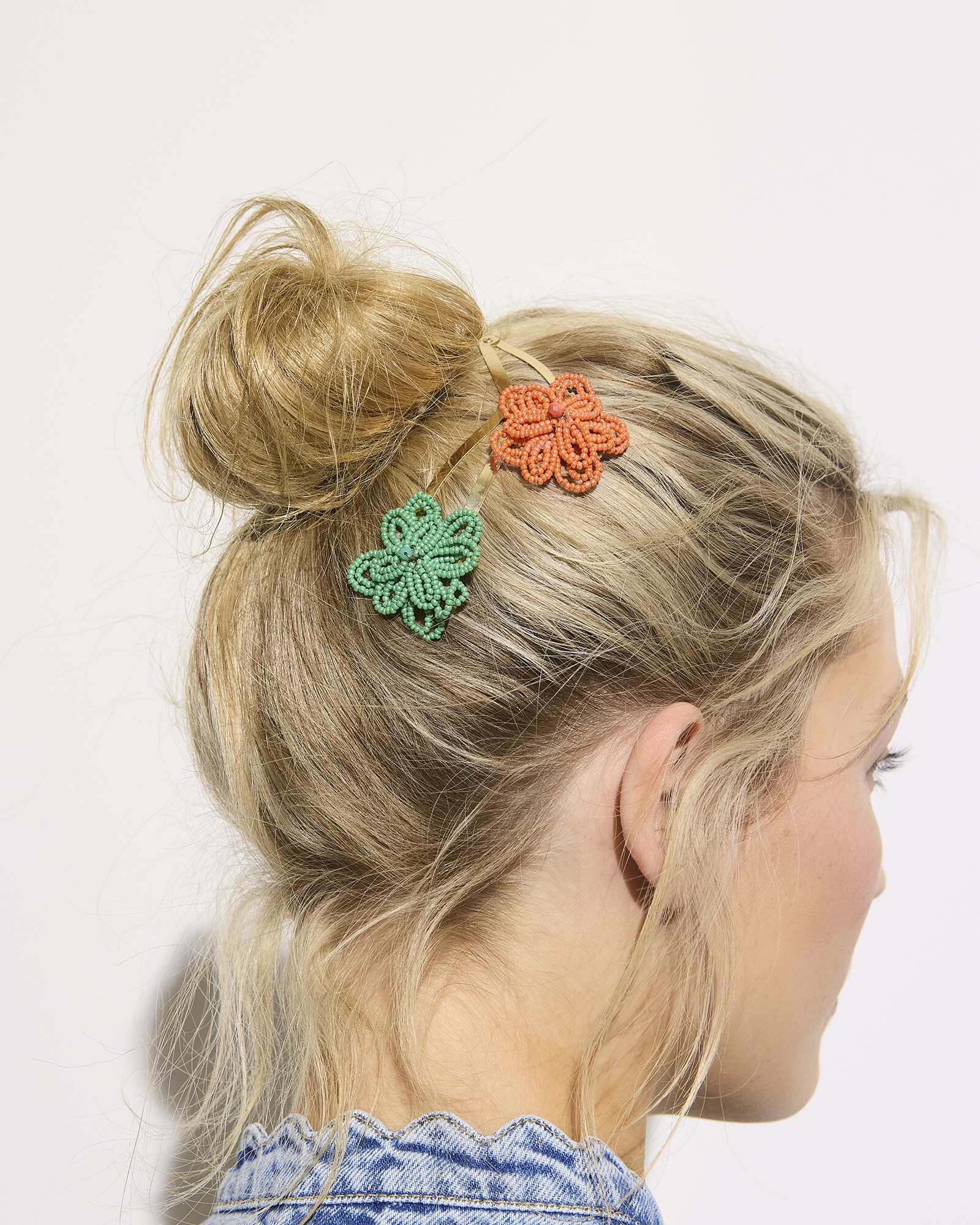 Set of two gold hair clips with a coral and green multi-layered beaded flower on the tip.