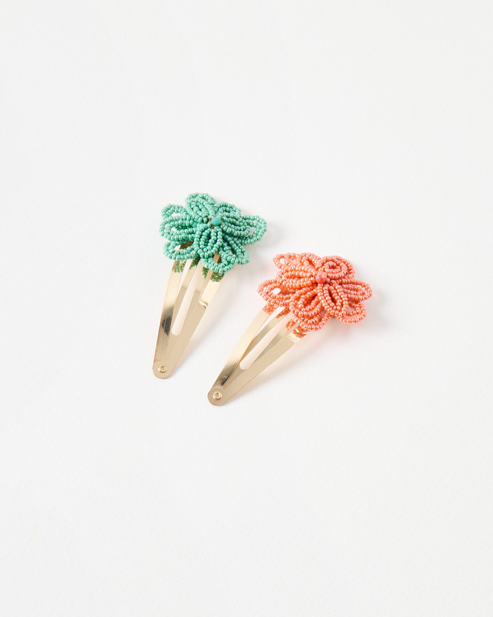 Home | Accessories | Hair Accessories | Hair Clips | Alicia Green & Coral Beaded Flower Hair Clips Set of Two