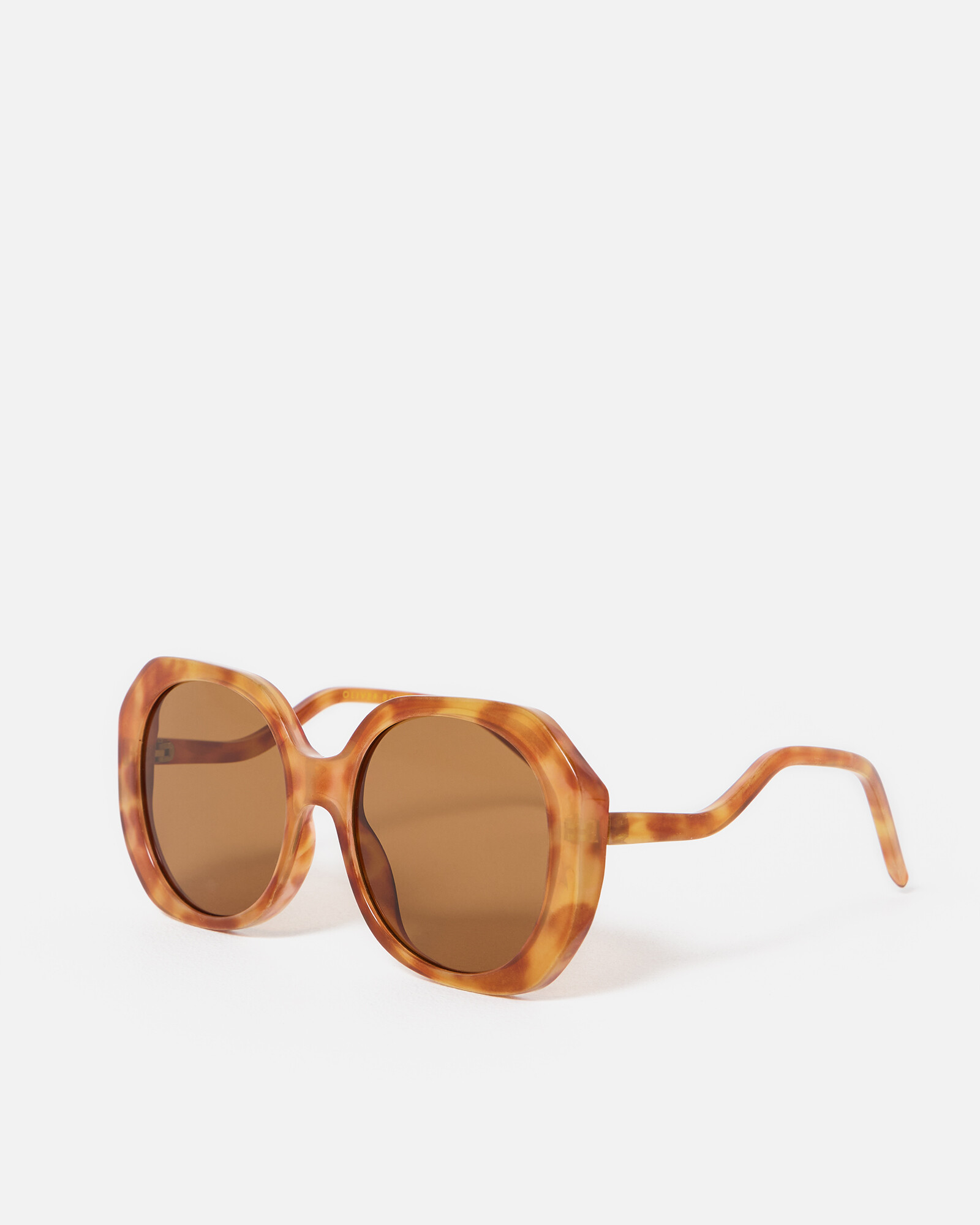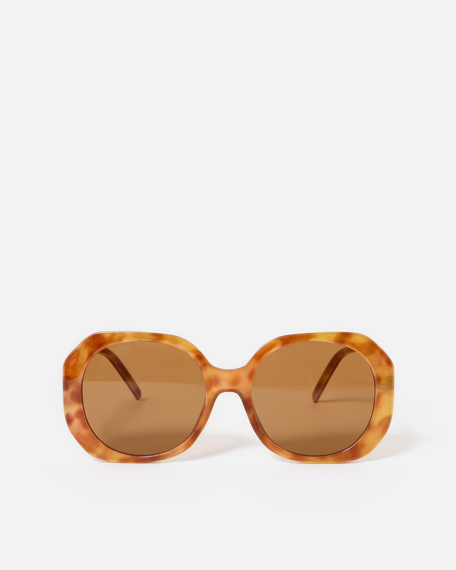 Oversized sunglasses with round brown tinted lenses, an amber faux tortoiseshell frame and matching slim arms in an arched design.