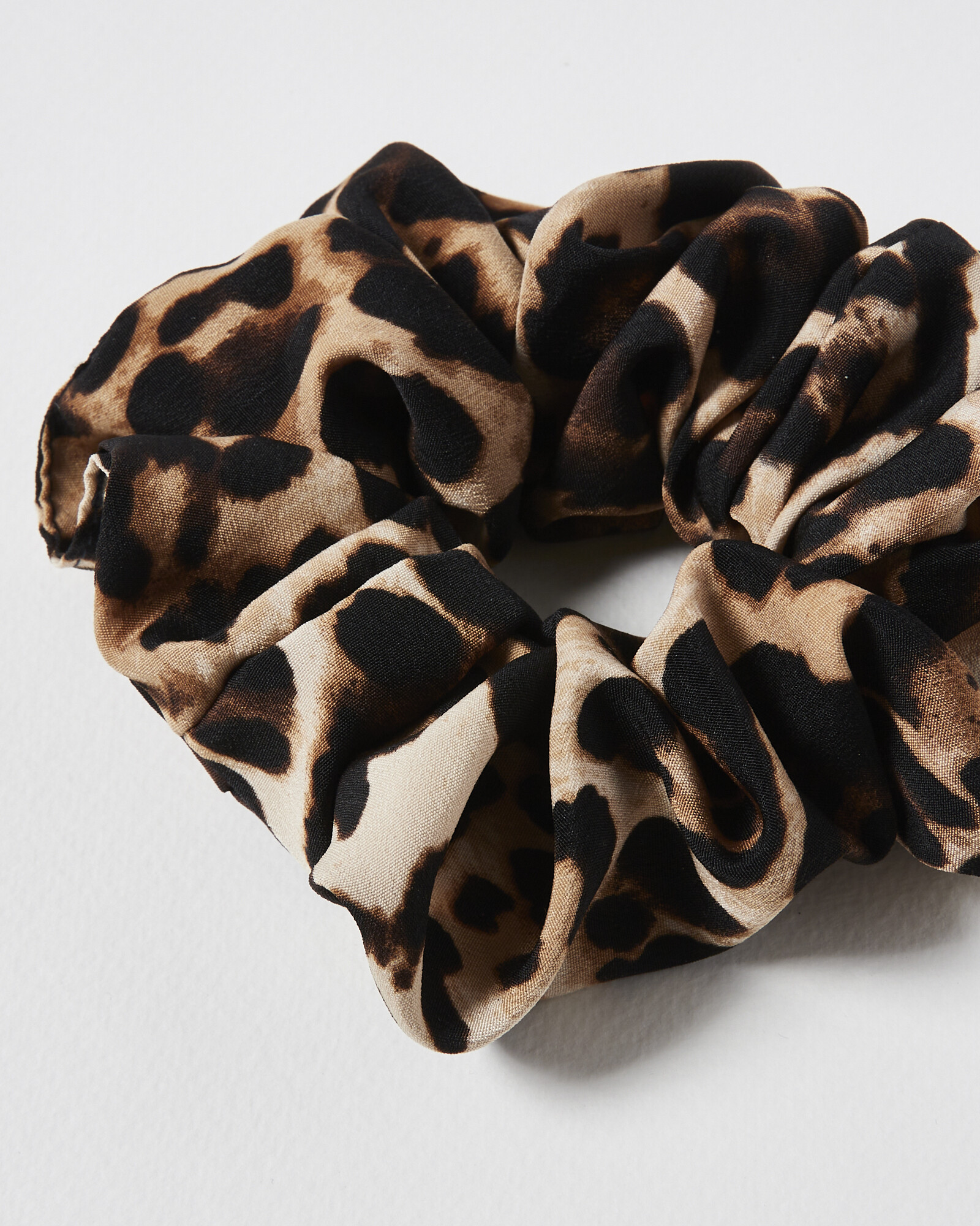This fabric hair scrunchie is printed with a brown animal print pattern.