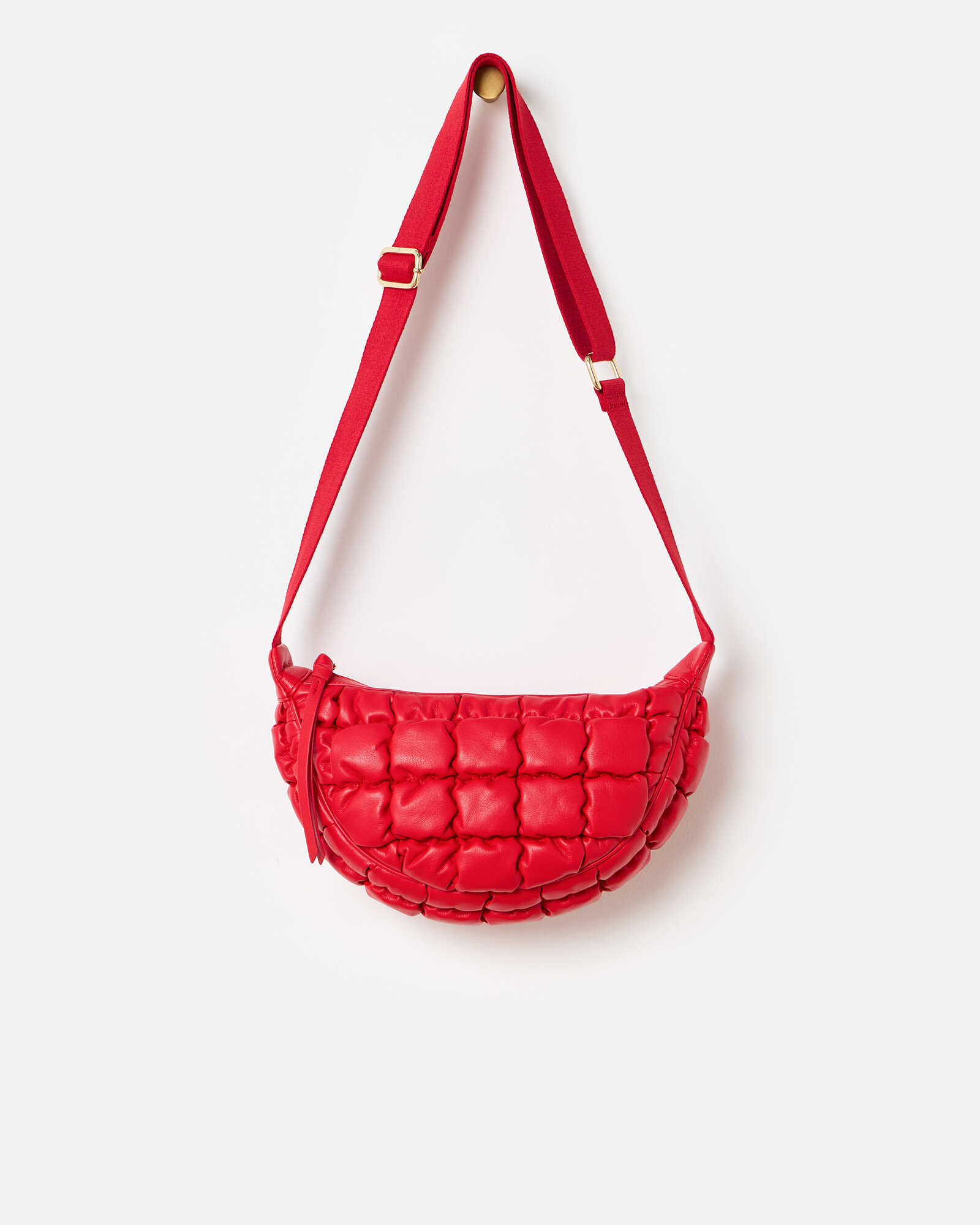 Red belt bag with a quilted, ruched design and curved sling shape. Adjust the strap to wear across your body or on the shoulder.