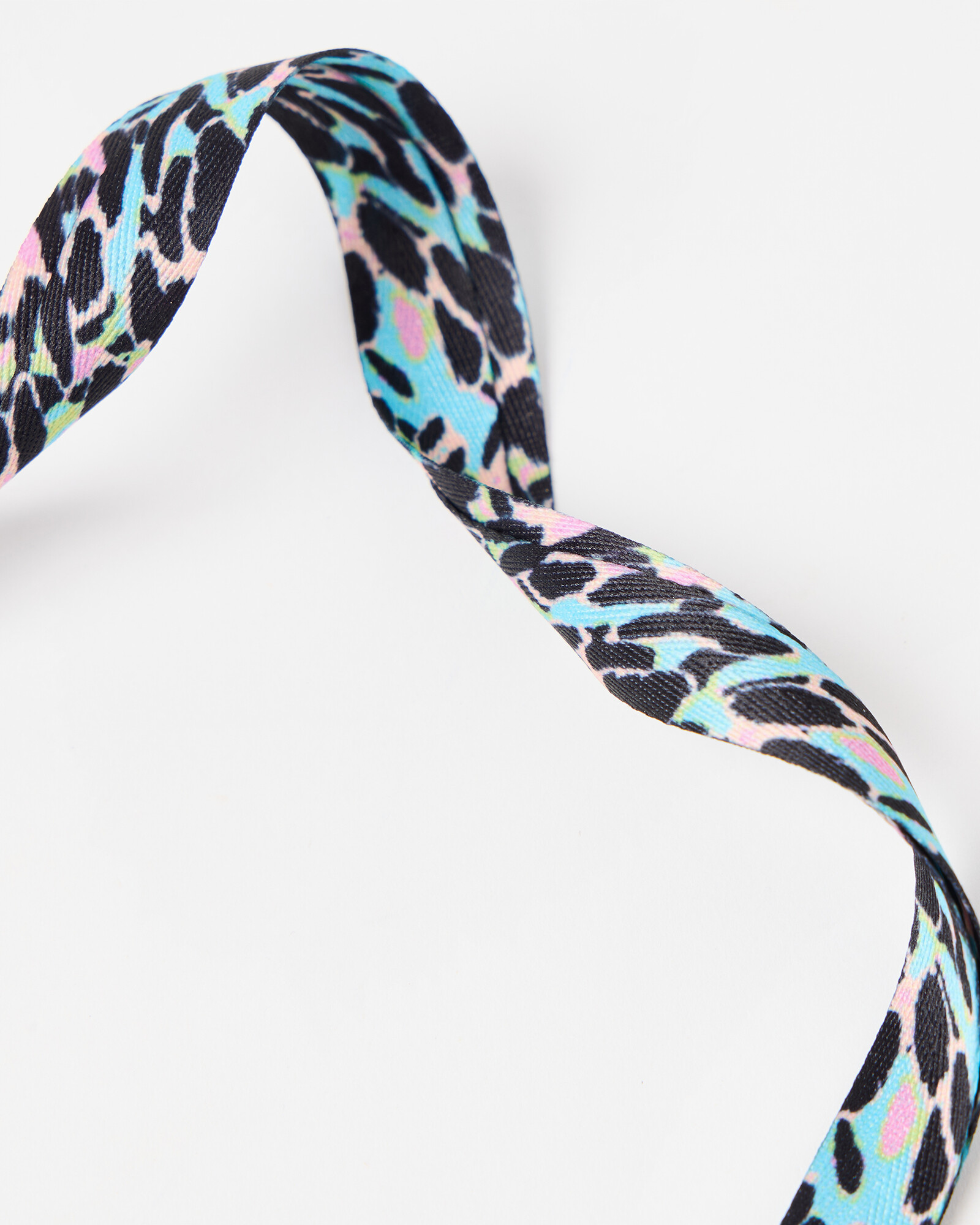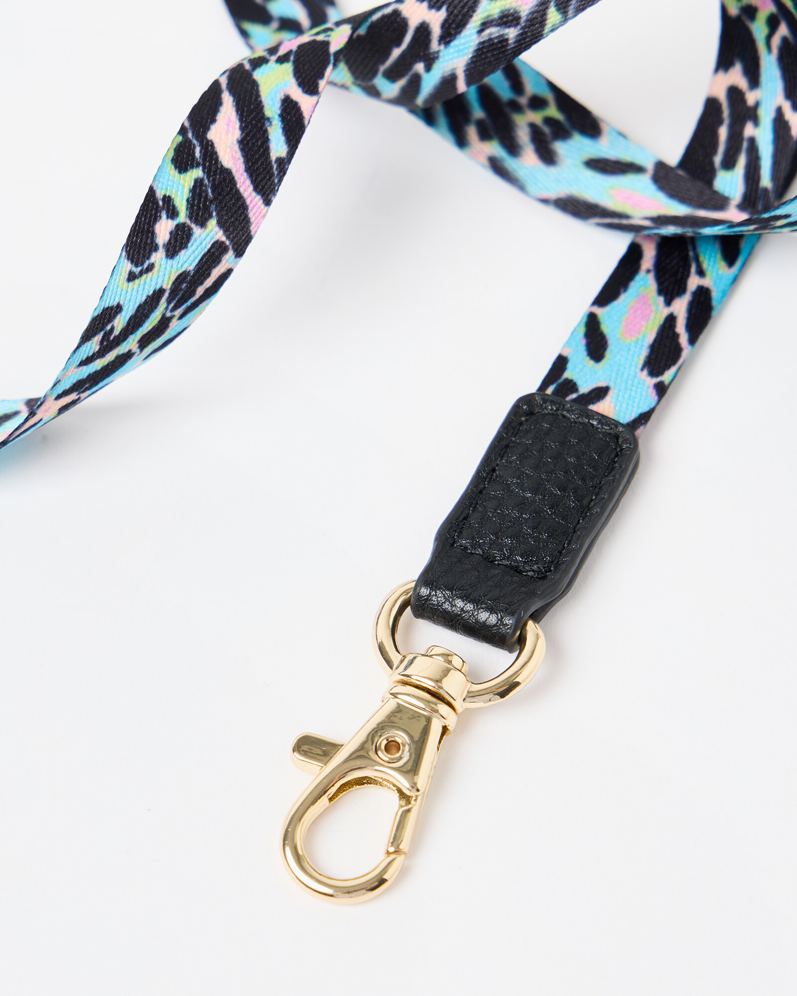 Black lanyard with a colourful leopard pattern and gold clasp.