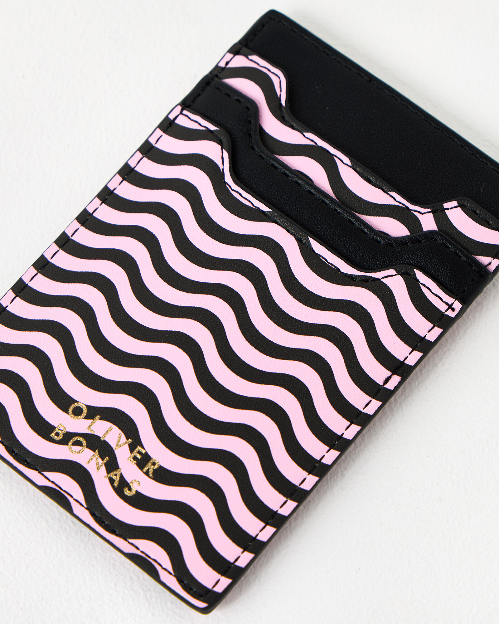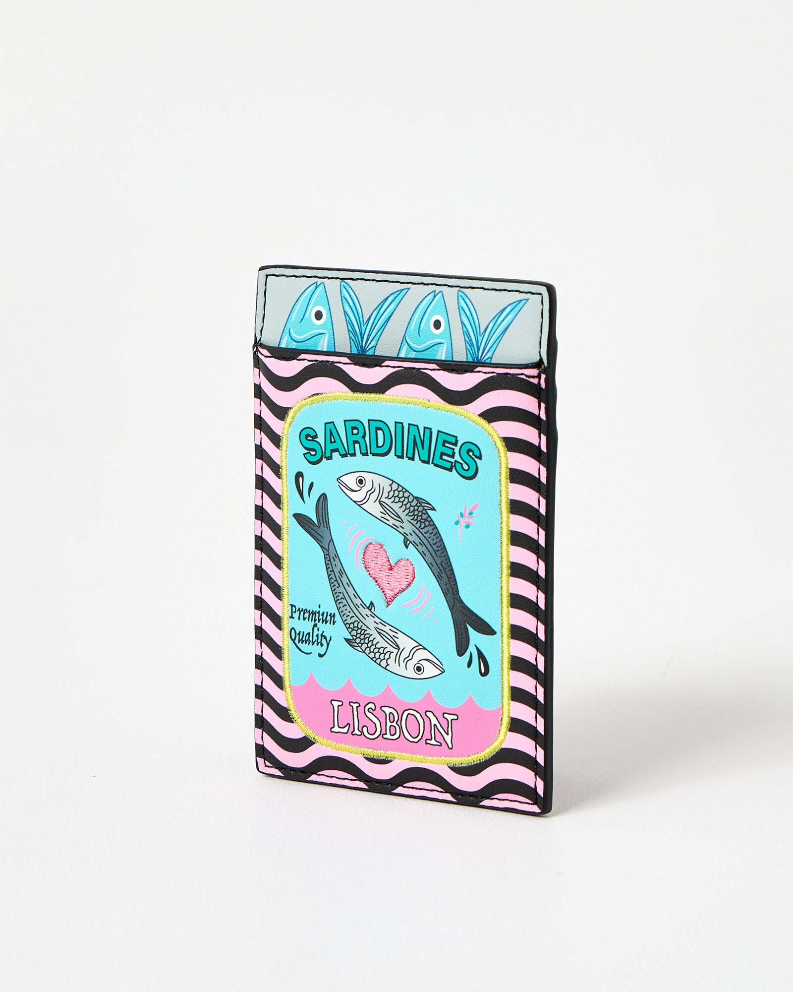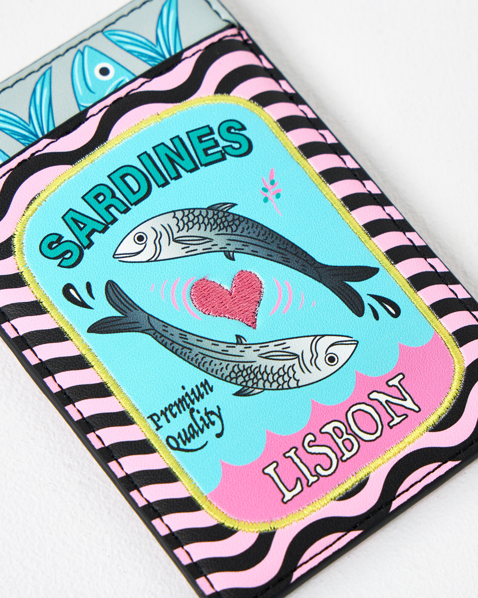 Black and pink wavy striped card holder printed with a Portuguese sardines tin fish graphic, featuring embroidered detailing and alternating card slots on the back.