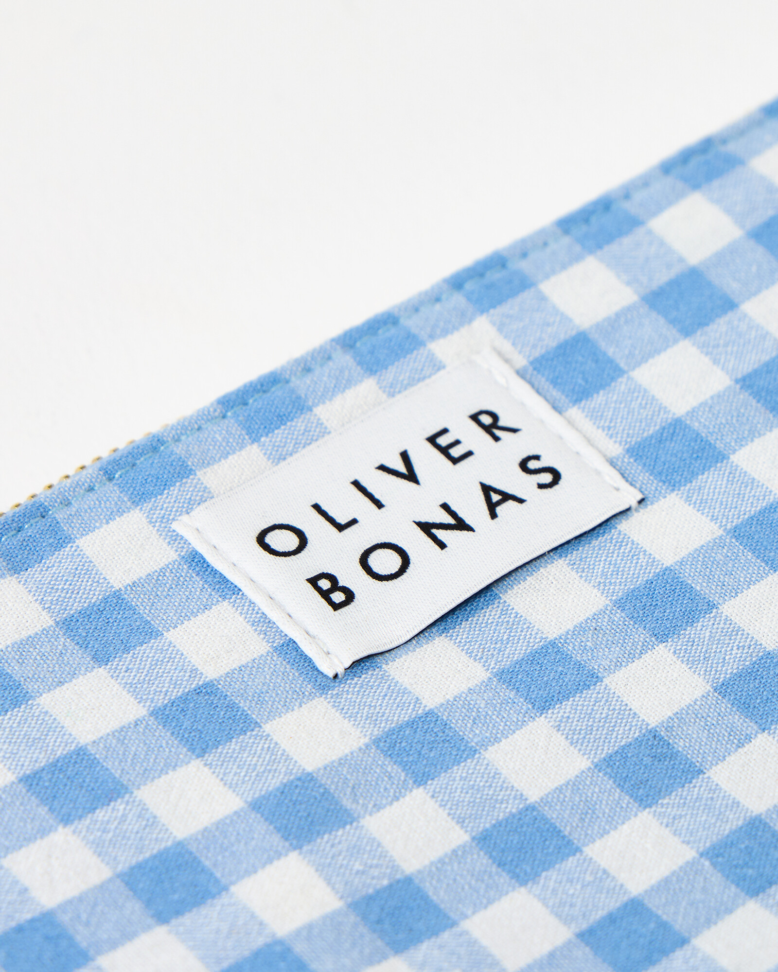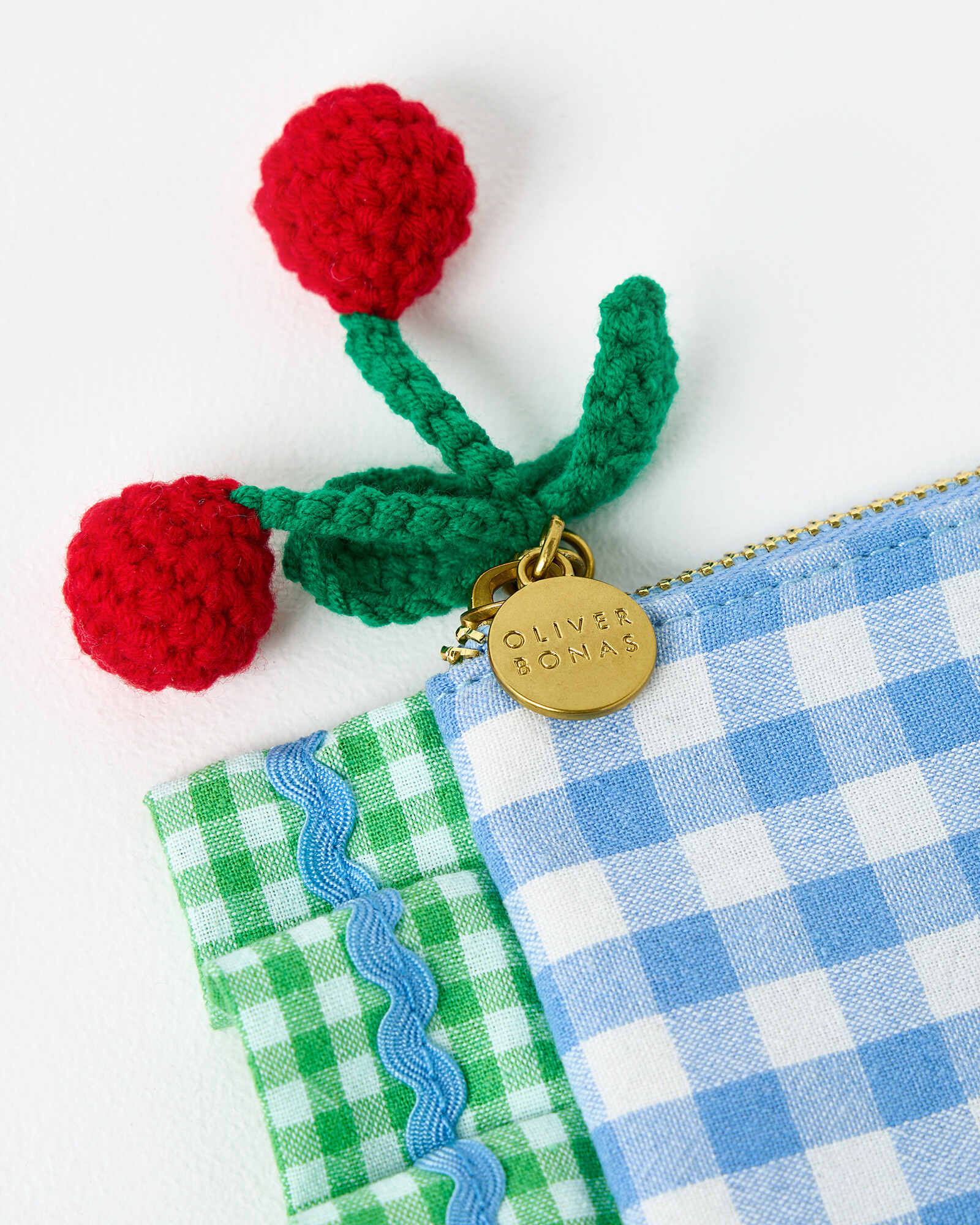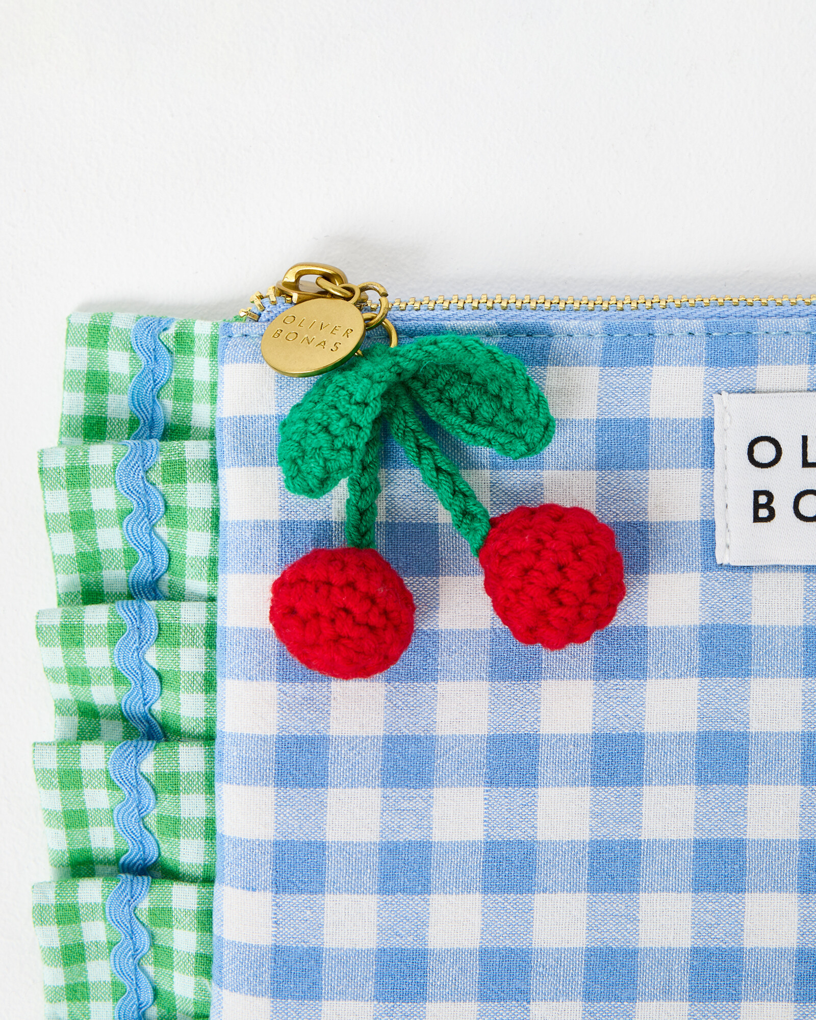 Zipped pouch in a blue and white gingham pattern with a ruffle edge detail in a green and white gingham. Designed with a woven Oliver Bonas patch, gold zip and cherry crochet charm.