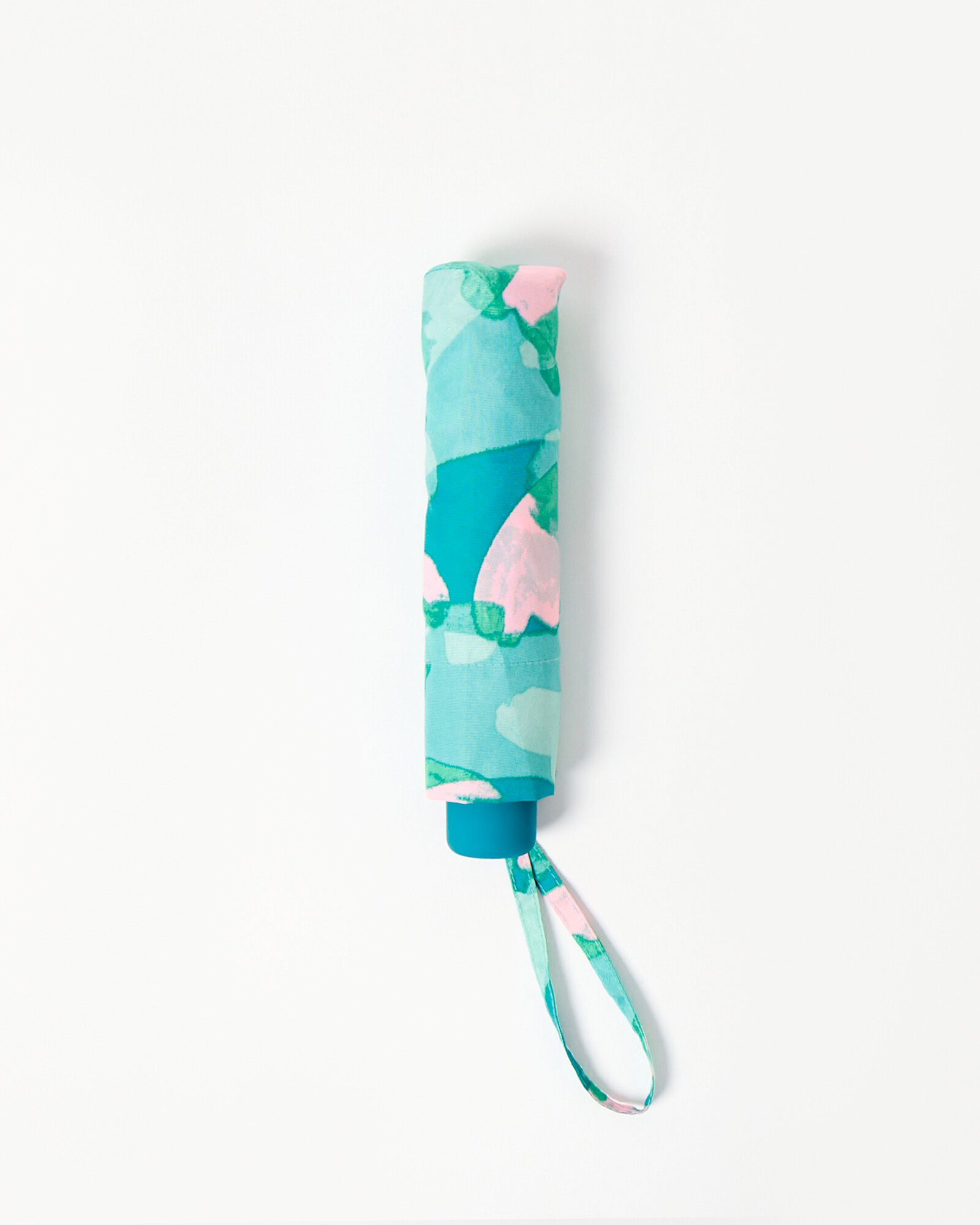 Blue and pink umbrella printed with an abstract brushstroke print, popper closure and carry handle.