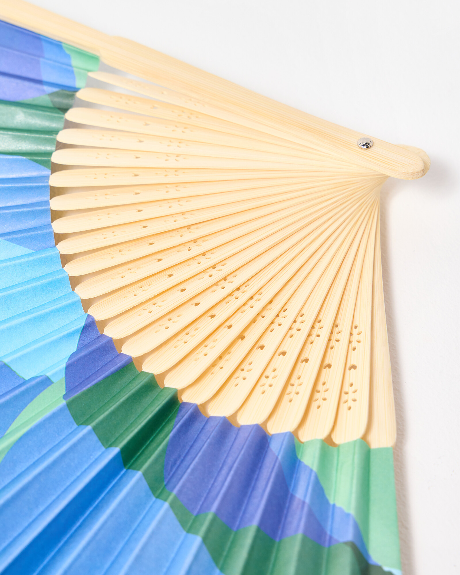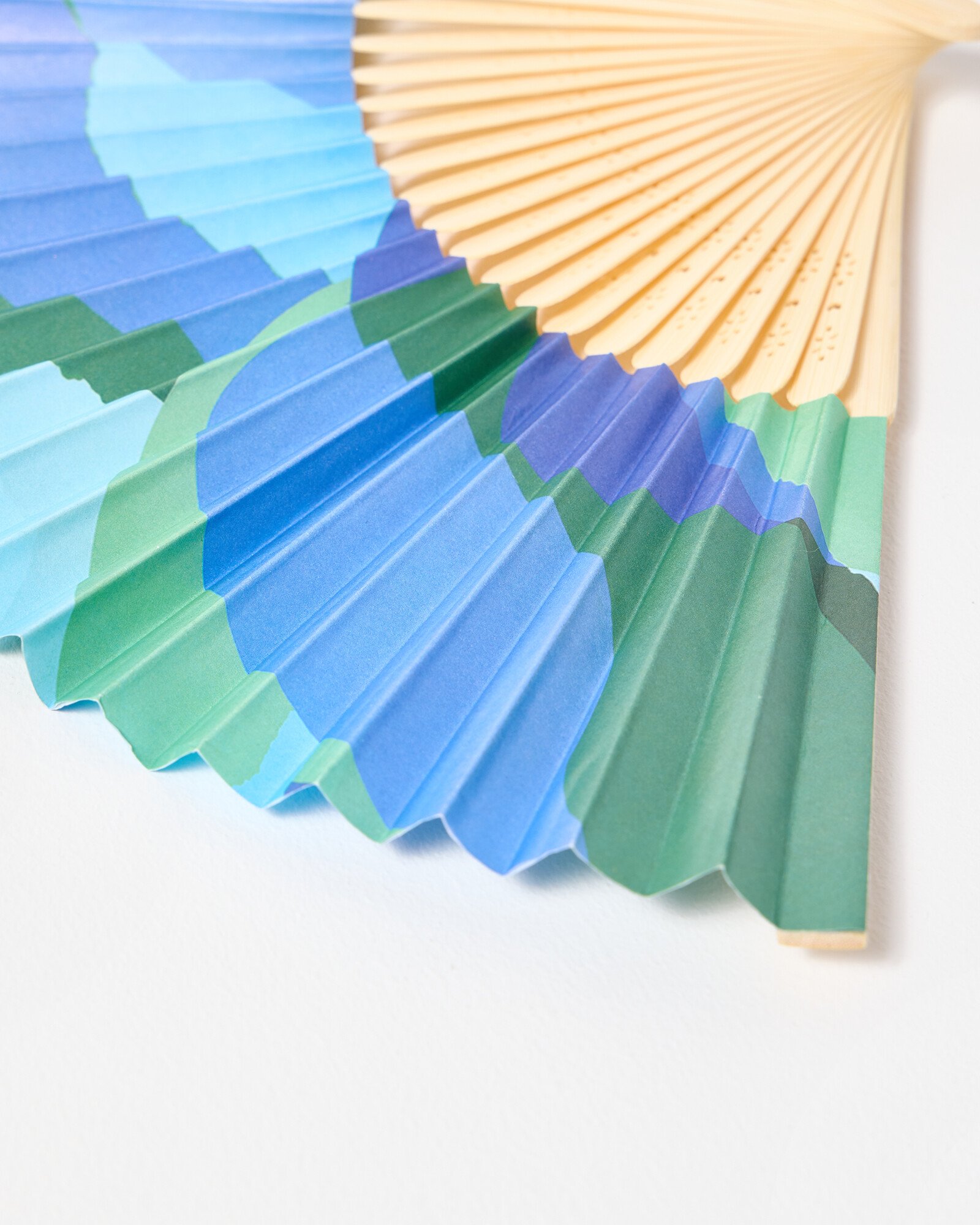 Keep cool in the heat of summer with this traditional handheld folding fan, made from a light coloured wood and bright blue printed paper. With a colourful decorative wave print in blue and green hues, the design of this hand fan was hand-drawn in the OB creative studios. The perfect size for slipping into your handbag or beach tote, keep on hand during the holidays to stay cool and refreshed under the hot sun.