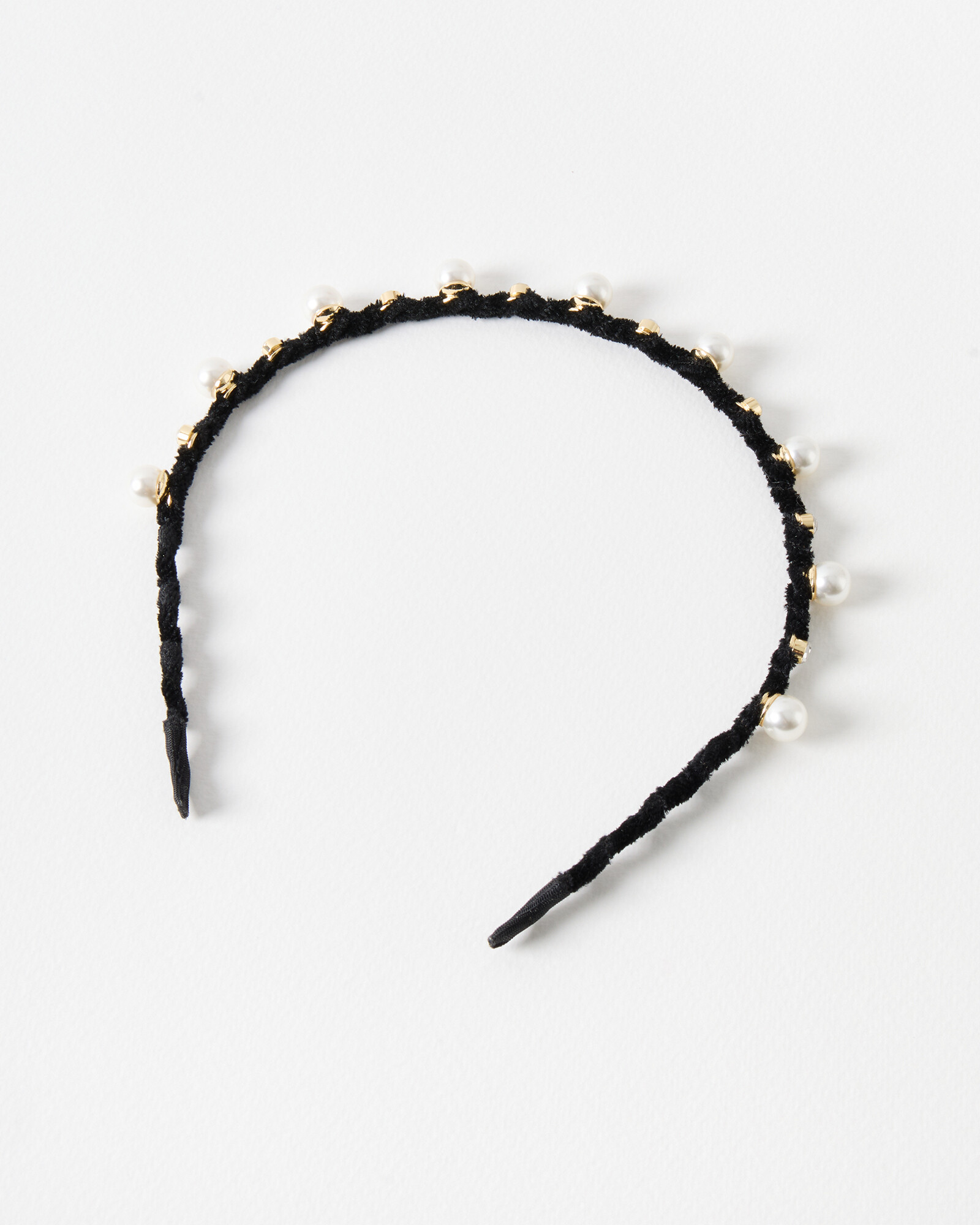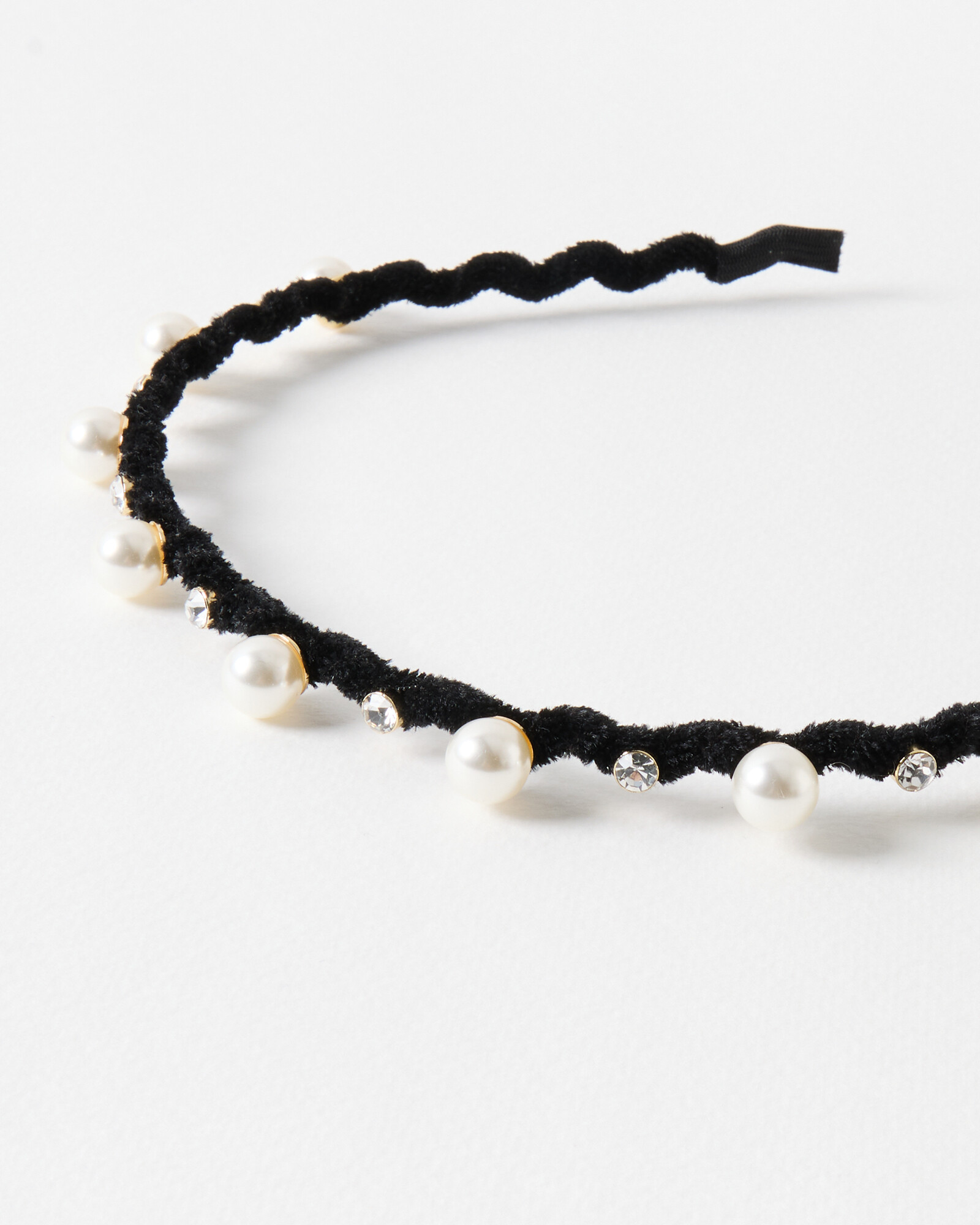 Wavy black velvet headband embellished with faux pearls and clear gems.