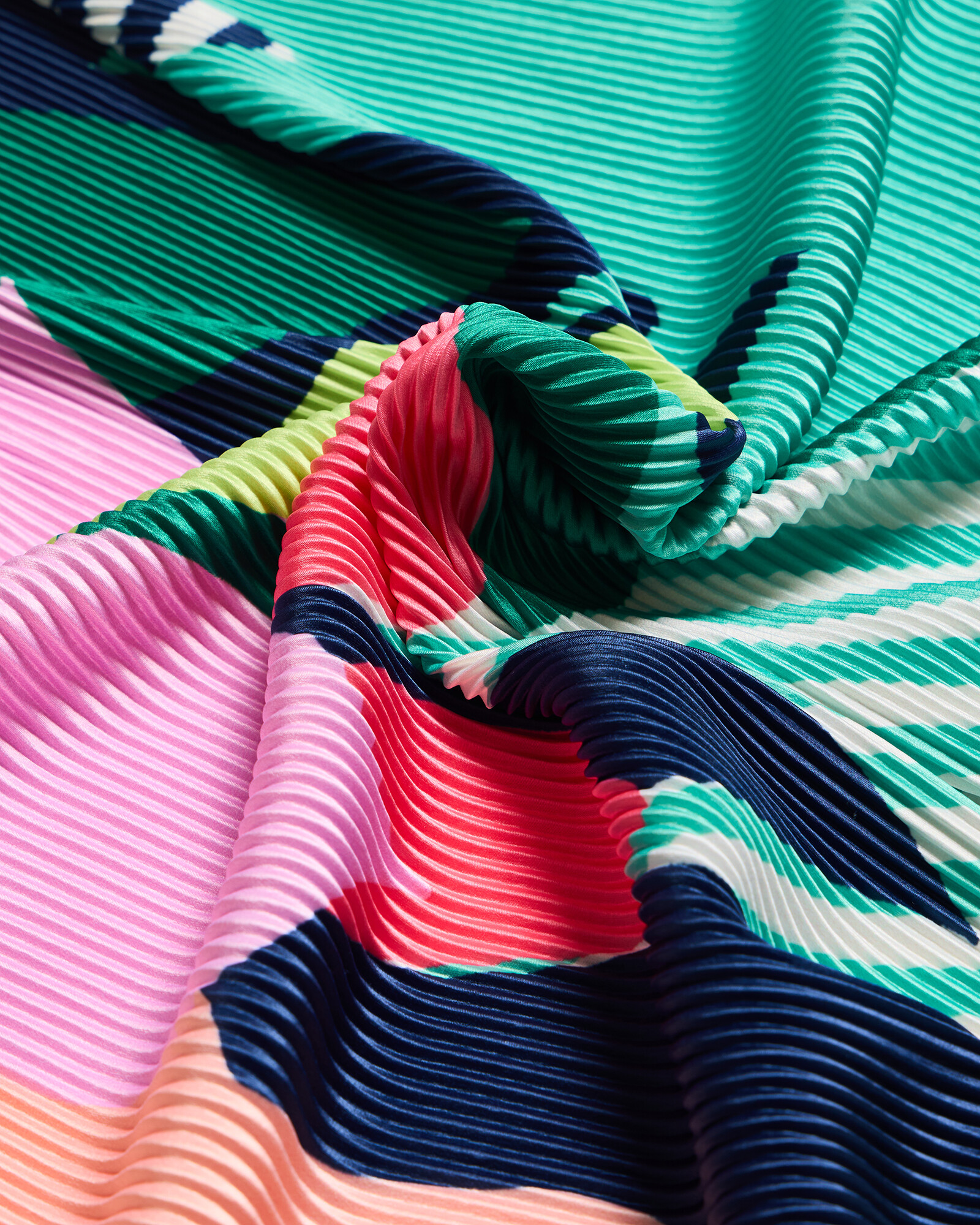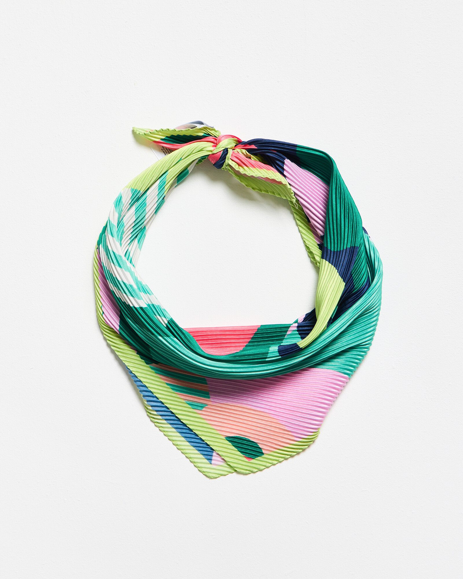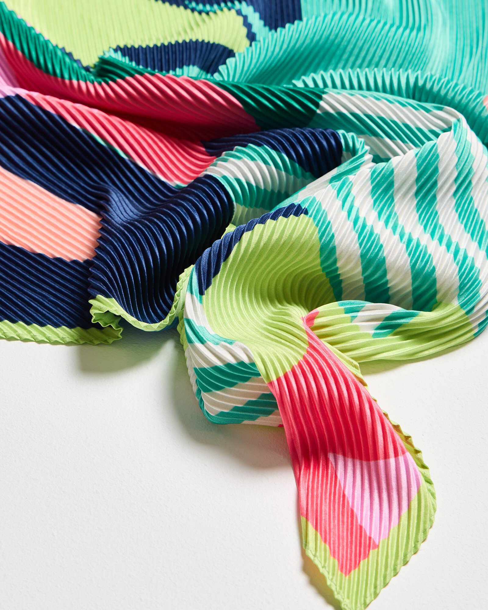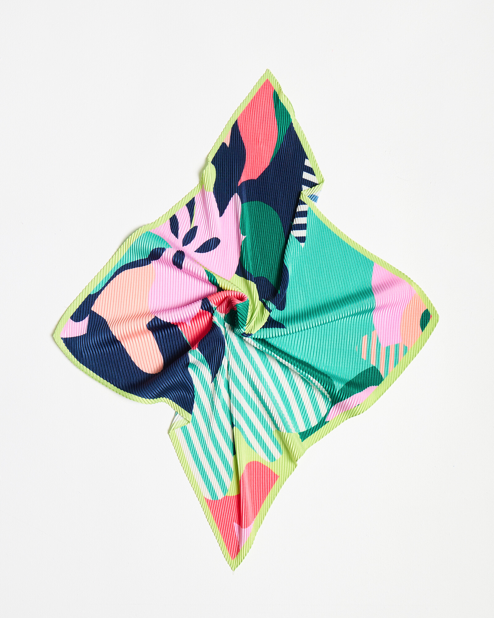 Pleated square scarf in a tonal green, pink and blue abstract floral pattern incorporated with stripes and a lime green border.
