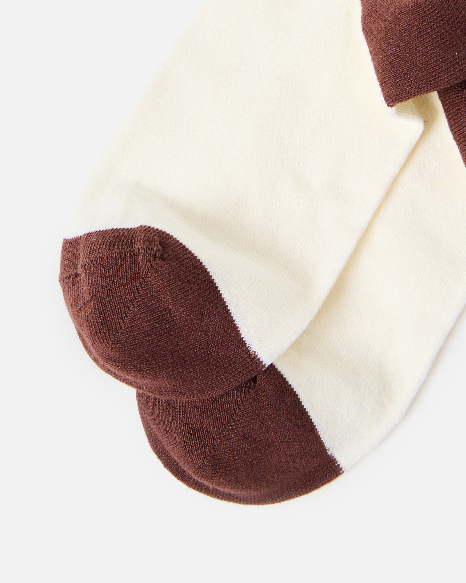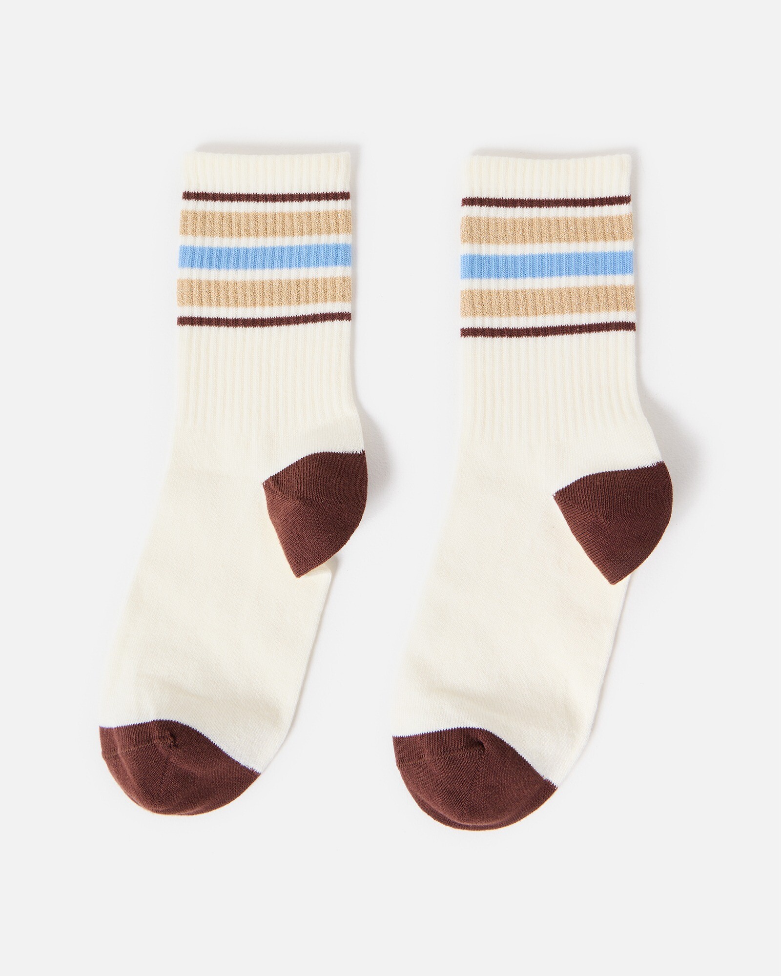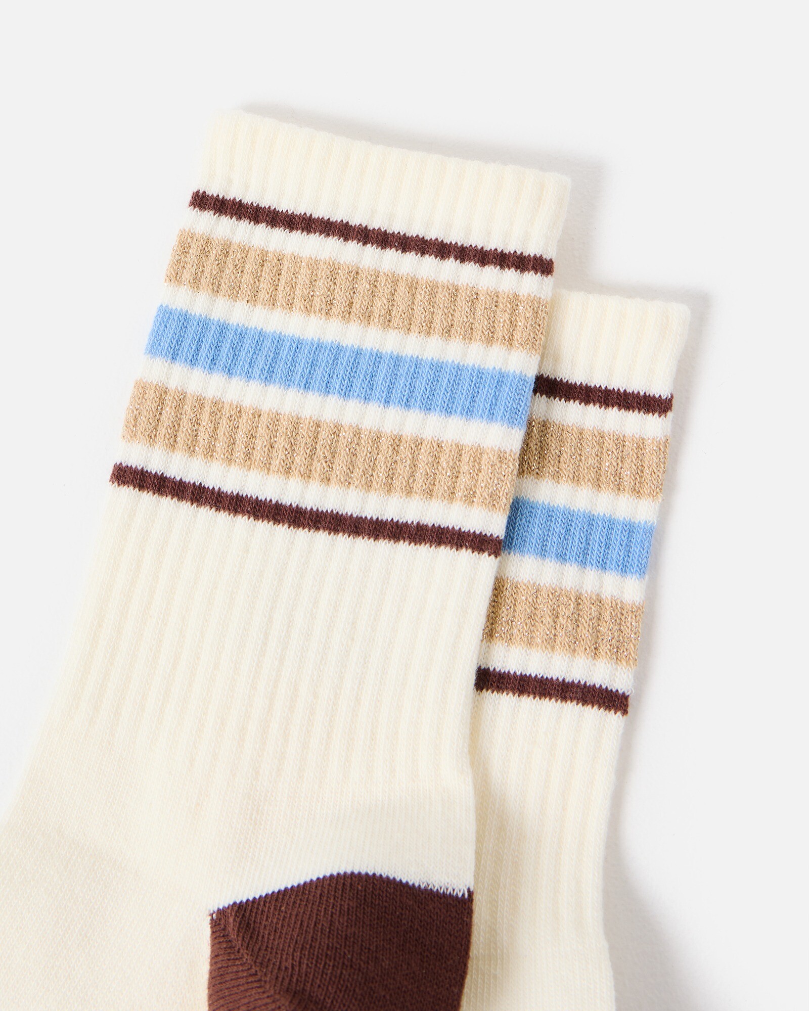 Looking to add a touch of athleisure to your outfit? Then our cream sporty ankle socks knitted in a ribbed pattern with solid chocolate brown toes and heels have your name all over them. And because it's you, we've woven a subtle metallic gold thread through the brown and blue striped trim for a little extra sparkle.