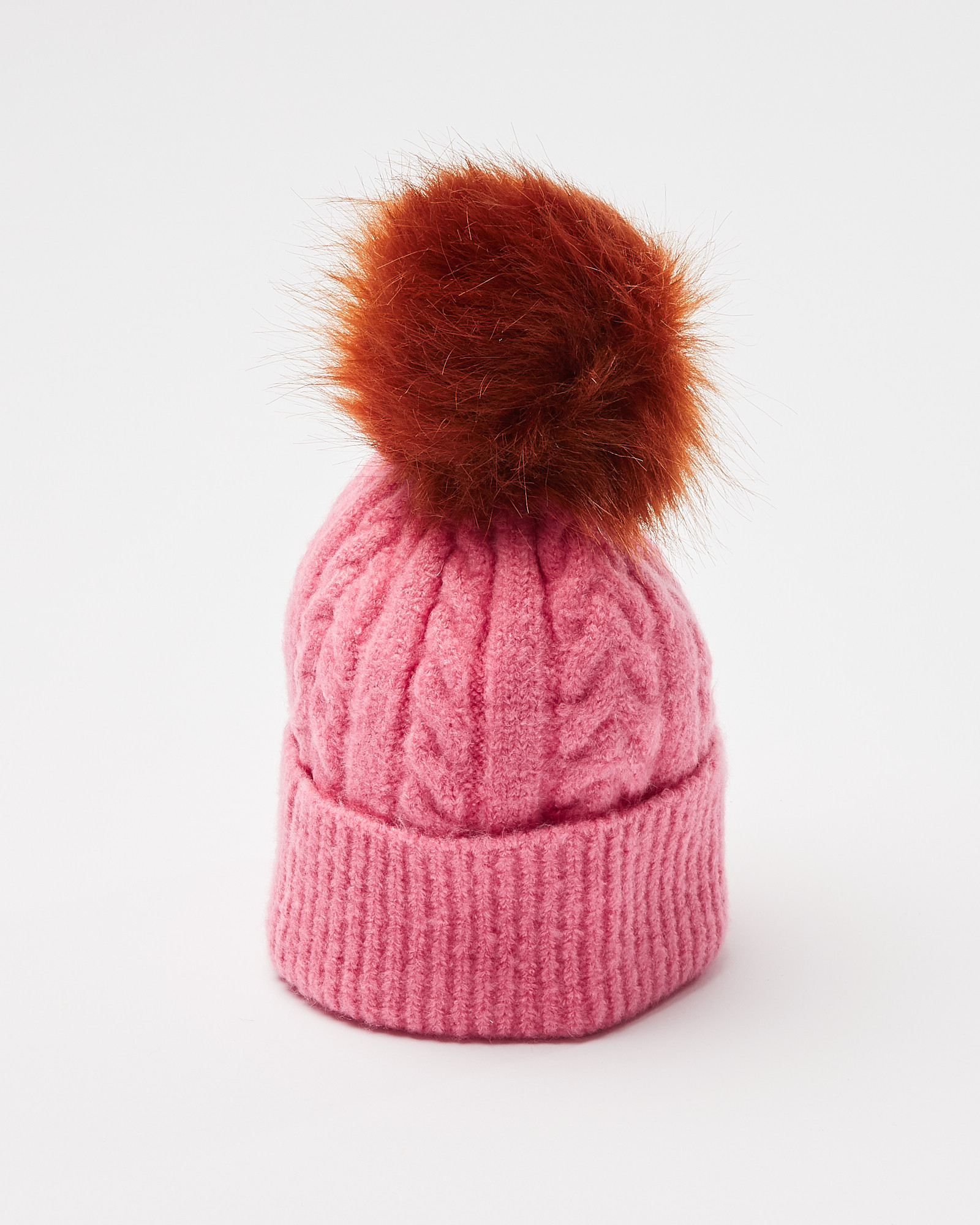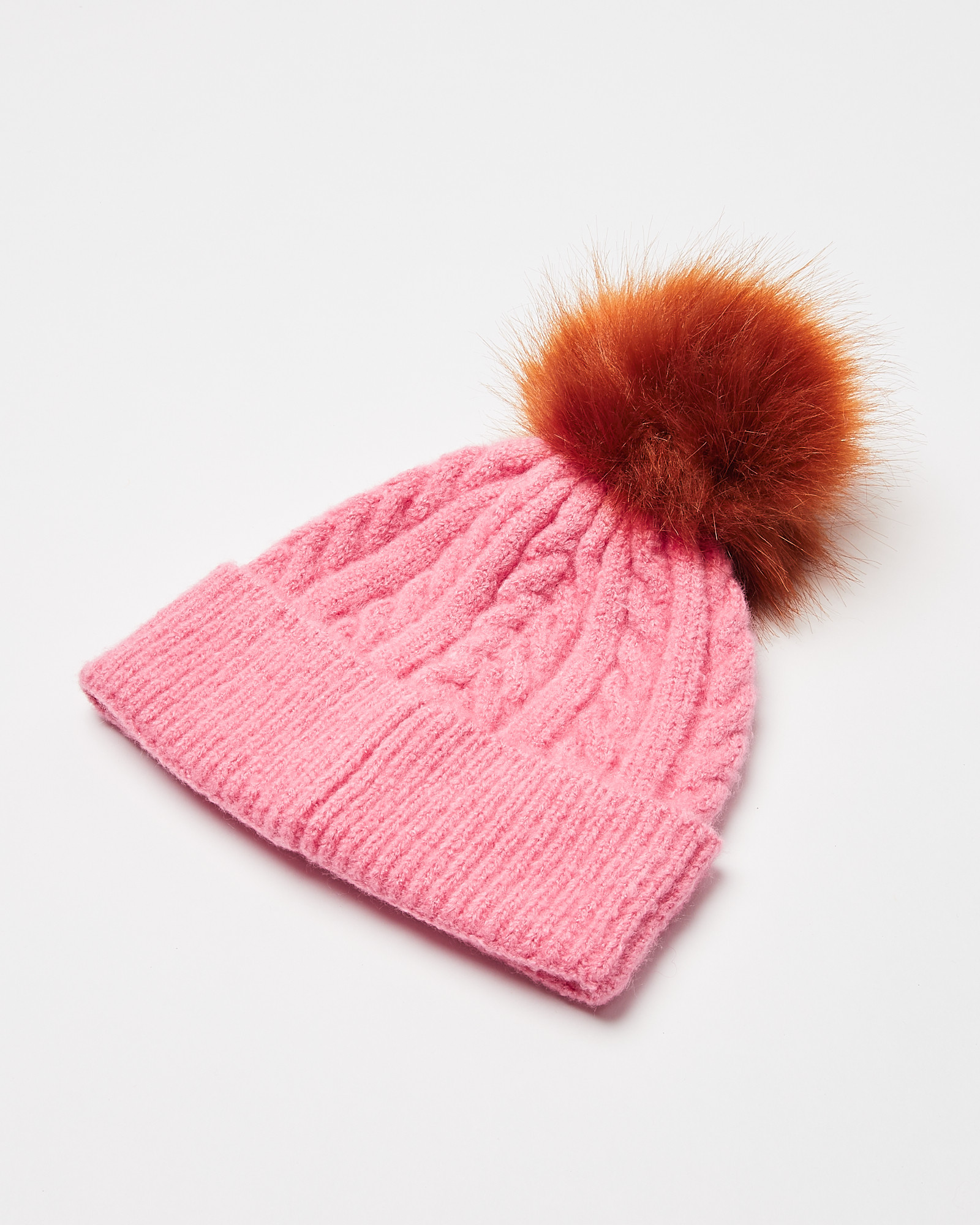 Style: BeanieDesign: Cable knit in rose pinkFinish: KnittedFaux fur pomTurn-up trim