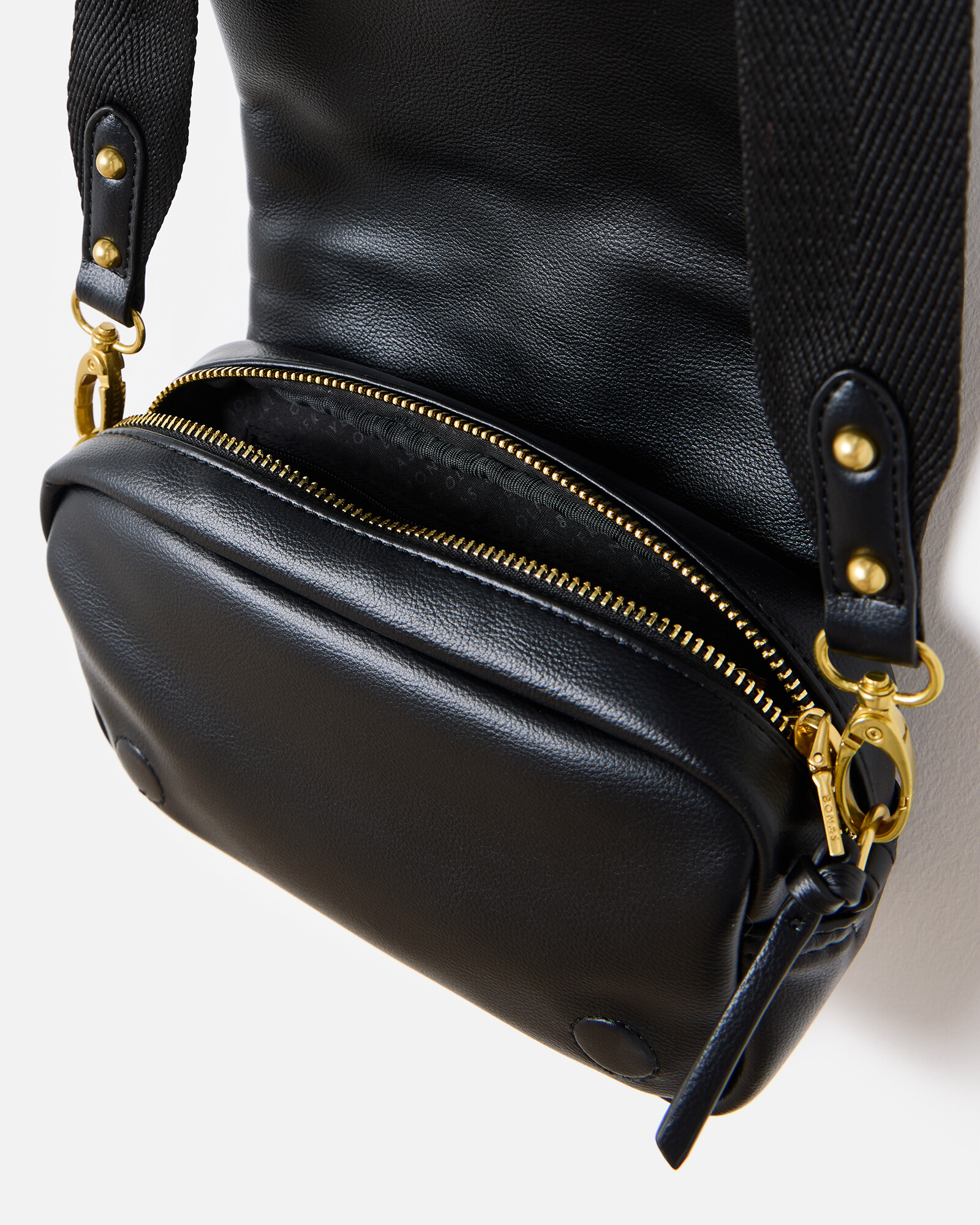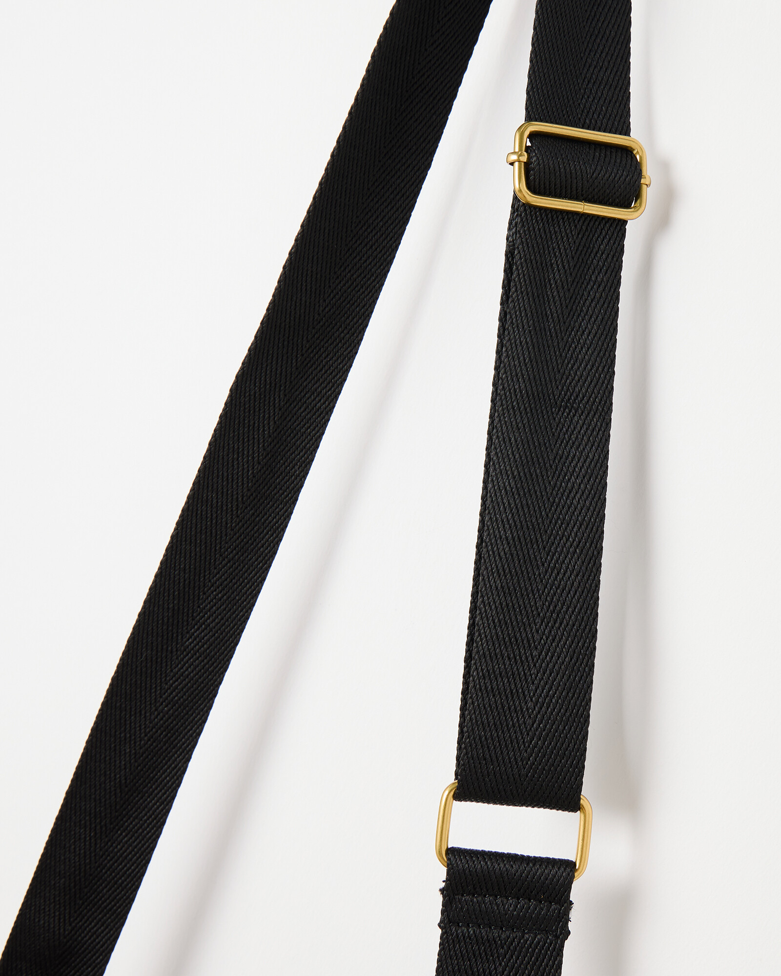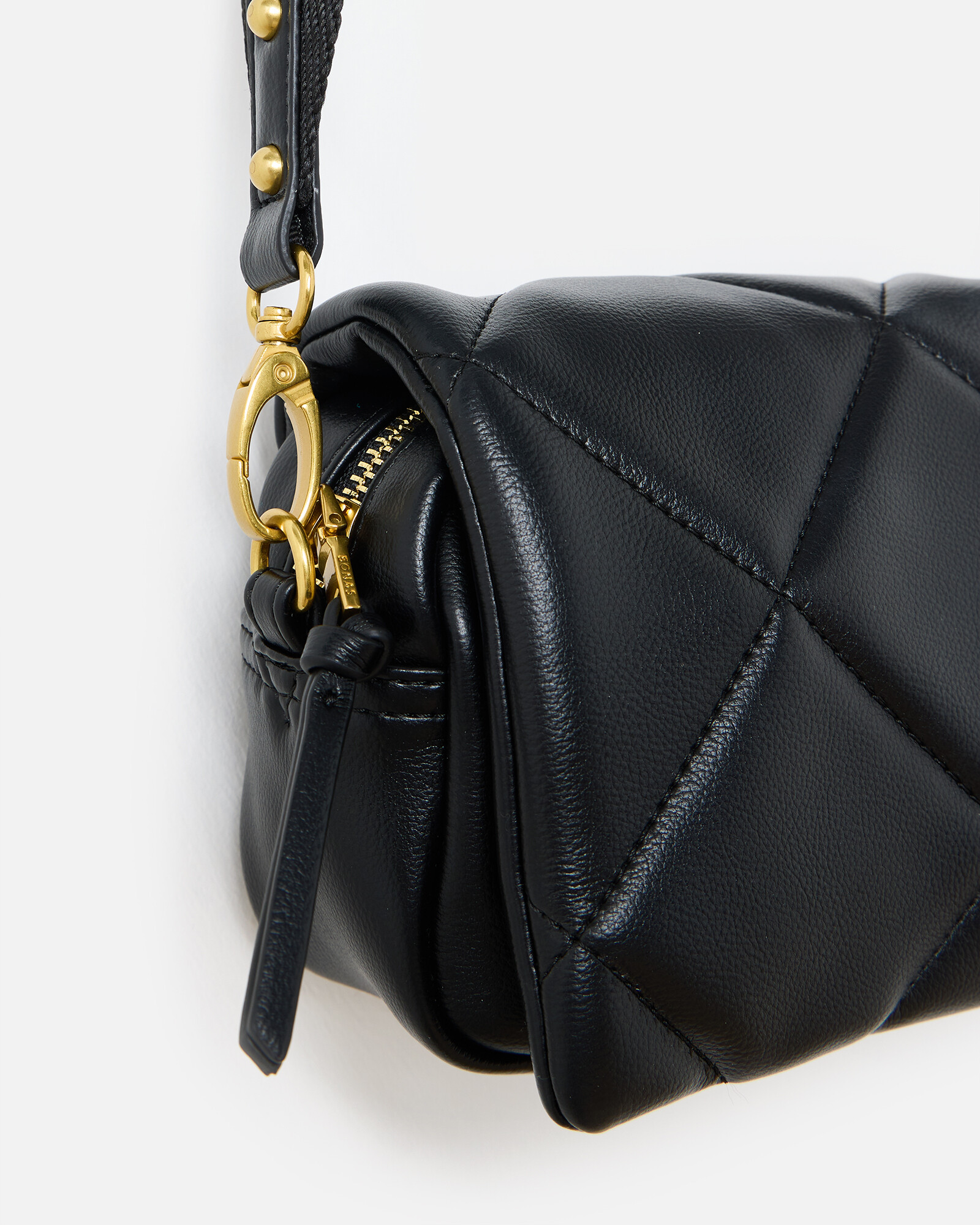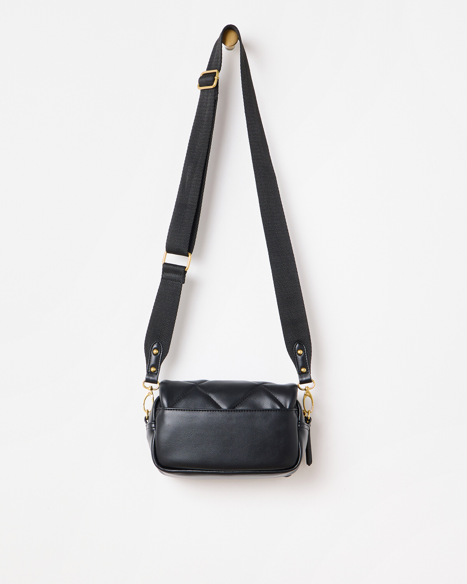 Black crossbody bag with a matching woven strap, quilted detailing and magnetic fold over closure.