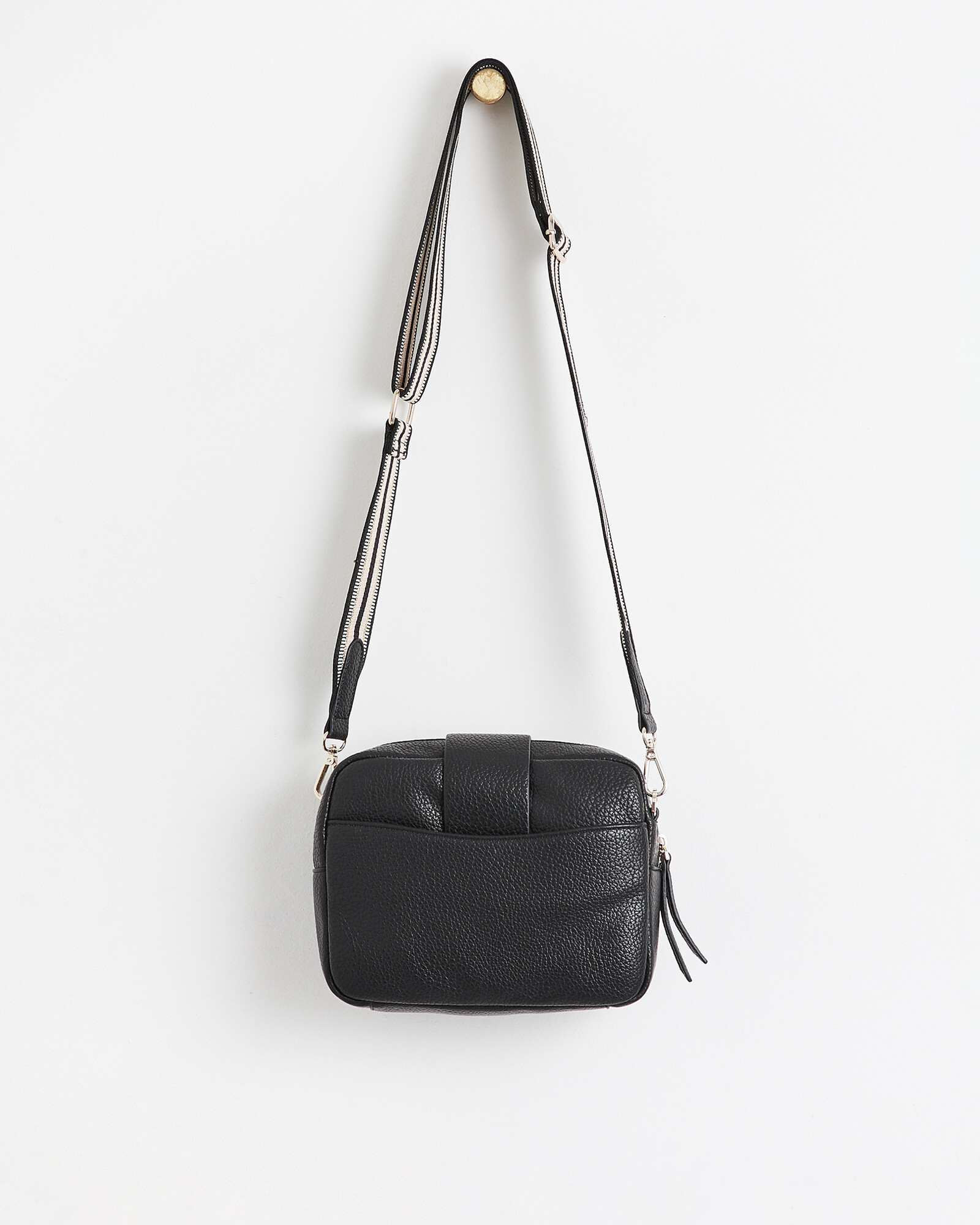 This crossbody bag sits in a rectangular profile with one lined main compartment, and one inner and outer zipped pocket for your essentials. Featuring a striped crossbody strap with metallic highlights and gold-toned hardware, this bag has a zip fastening and a fold over flap.