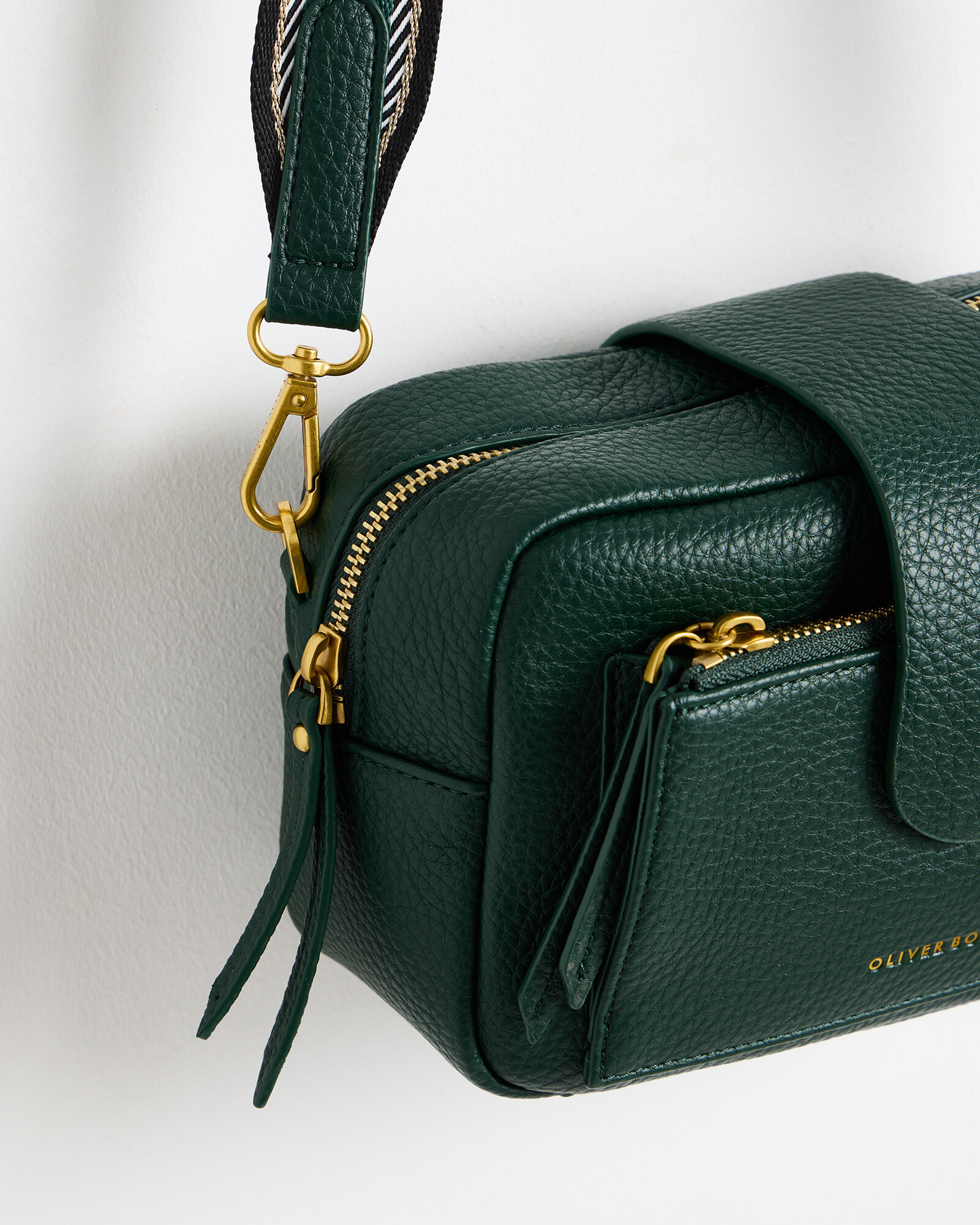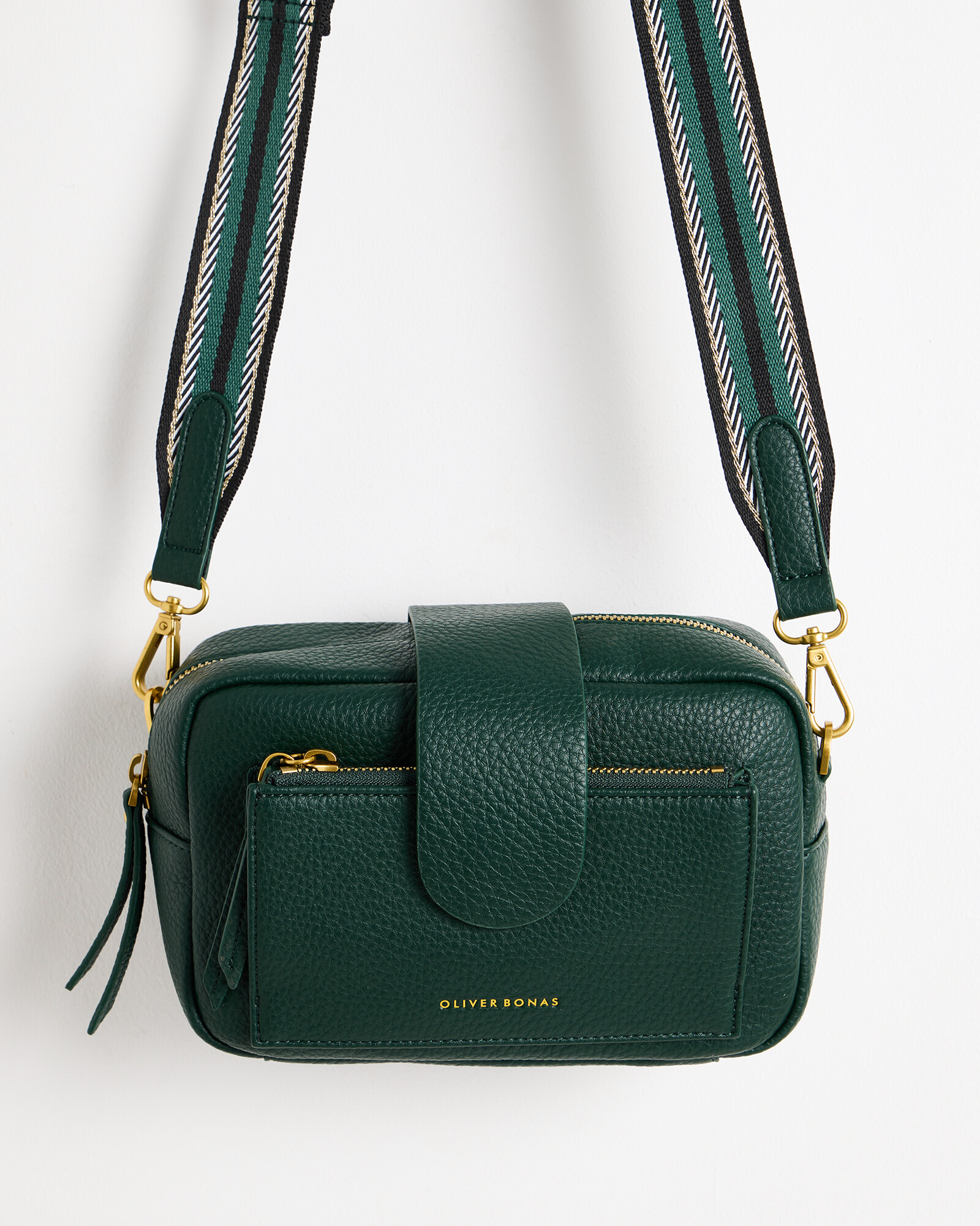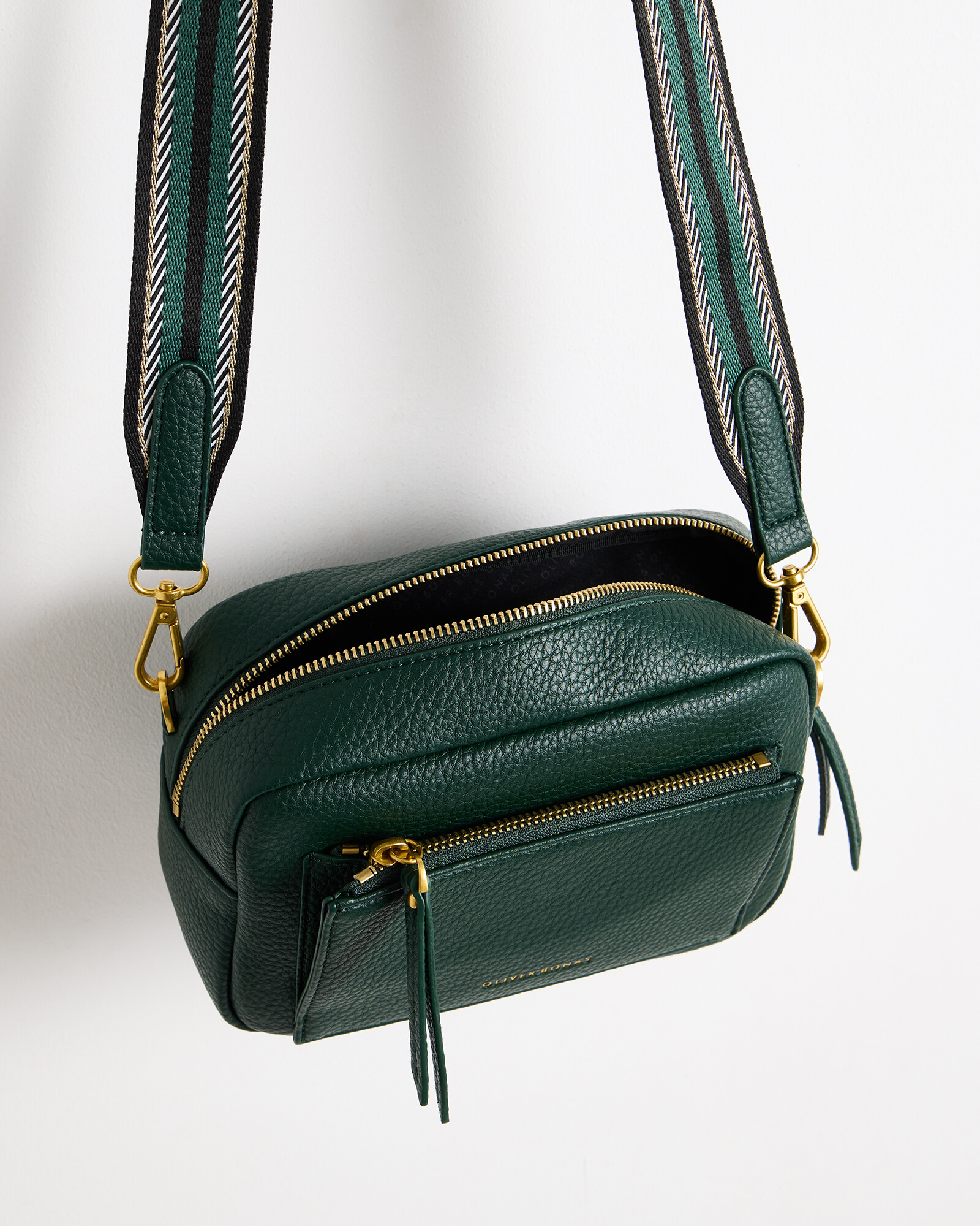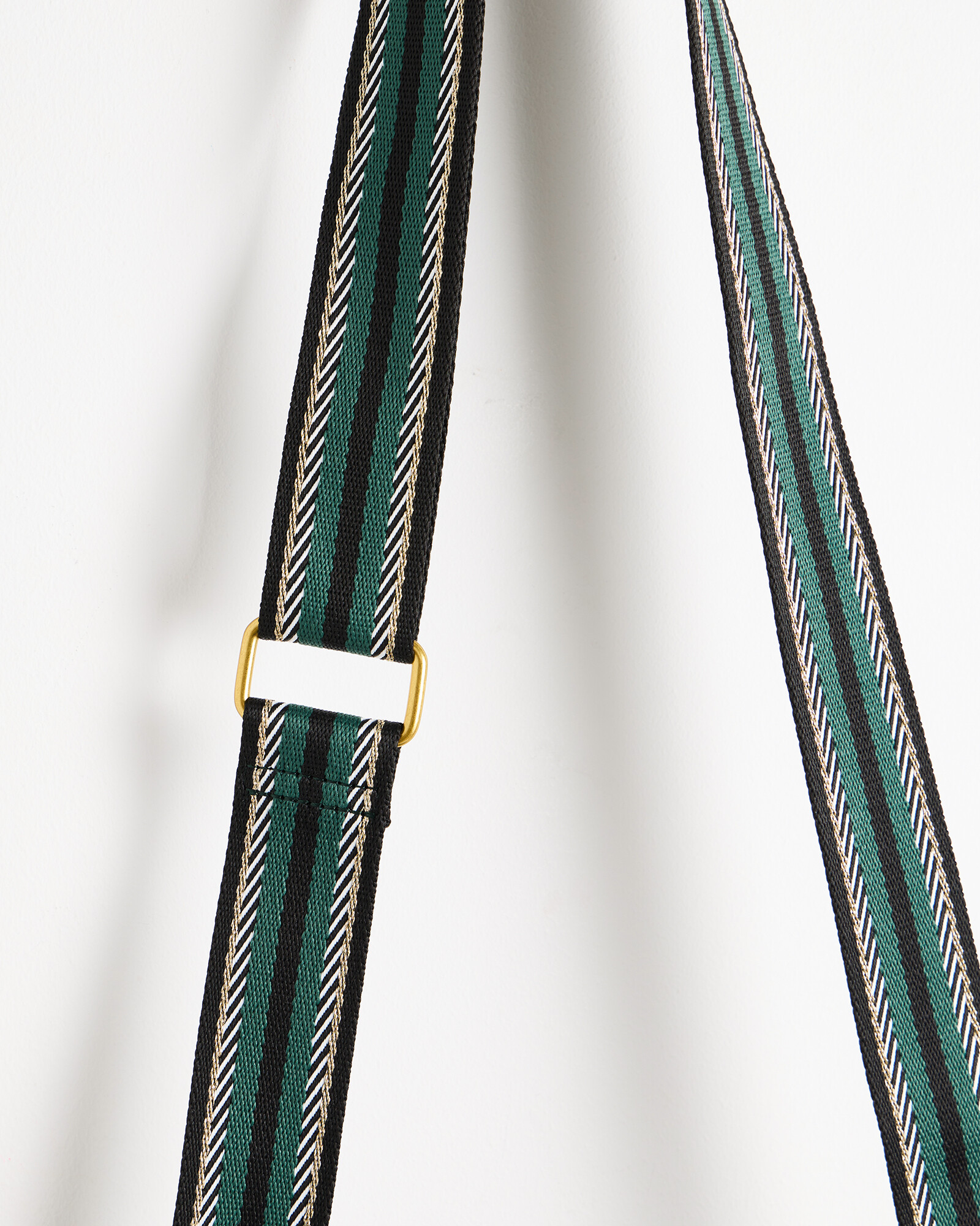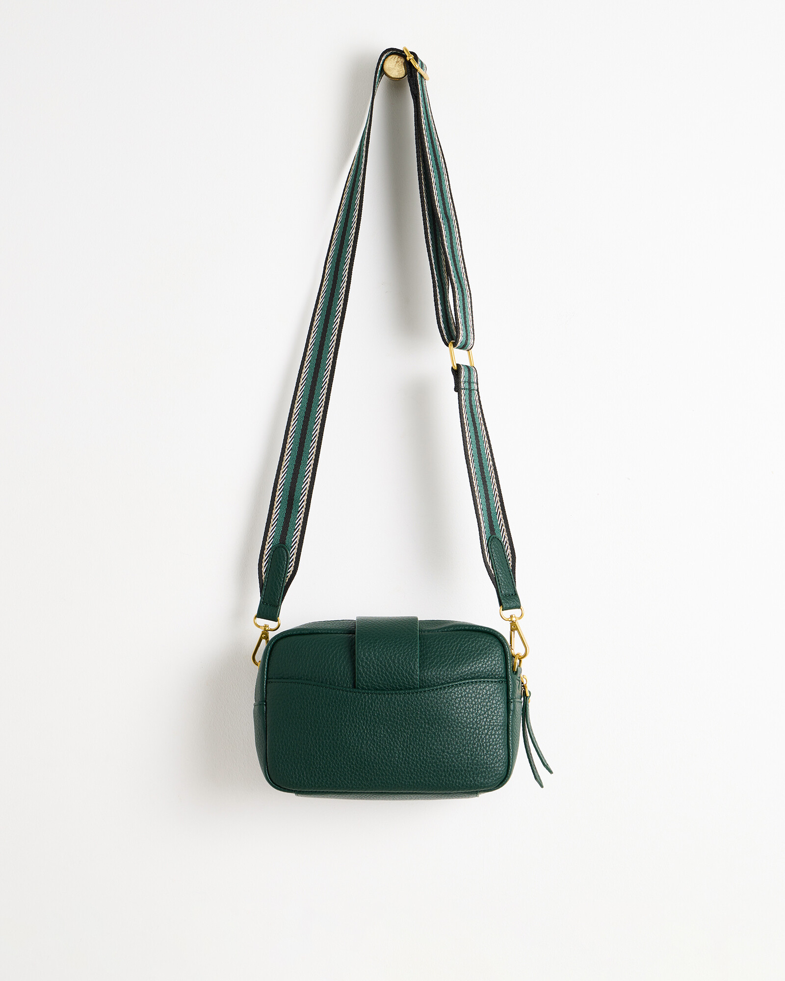 Compact bottle green bag with a fold over design and handy zipped pocket. Detach or adjust the stripy strap to wear crossbody or on your shoulder.