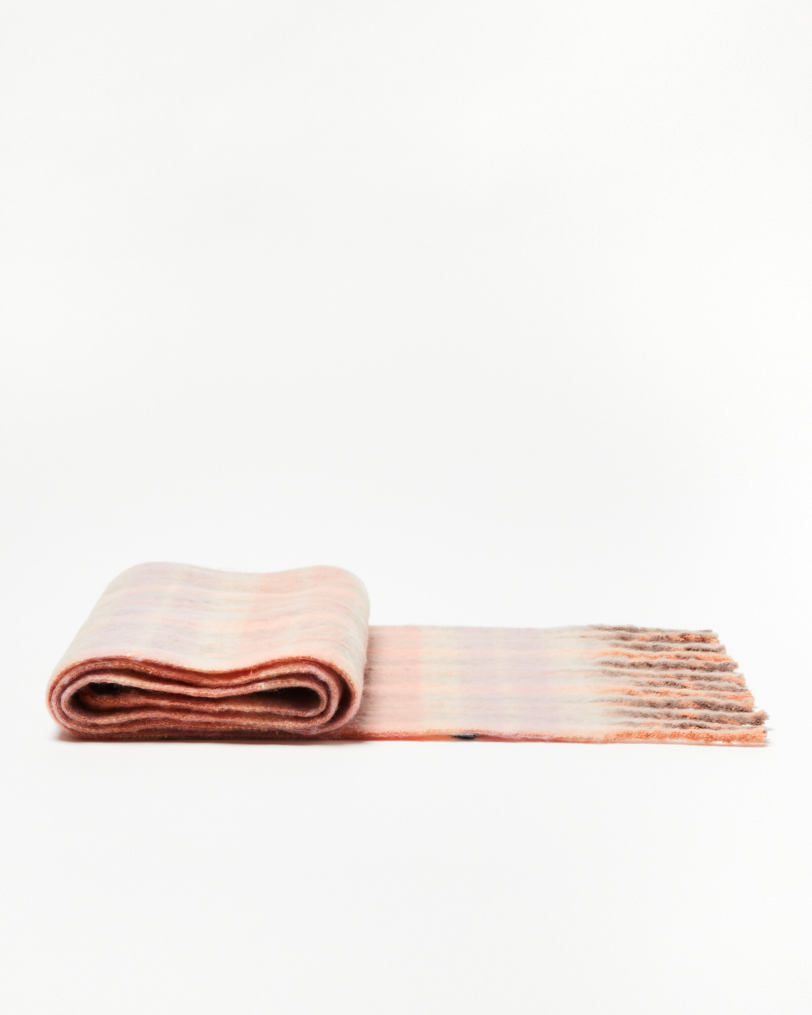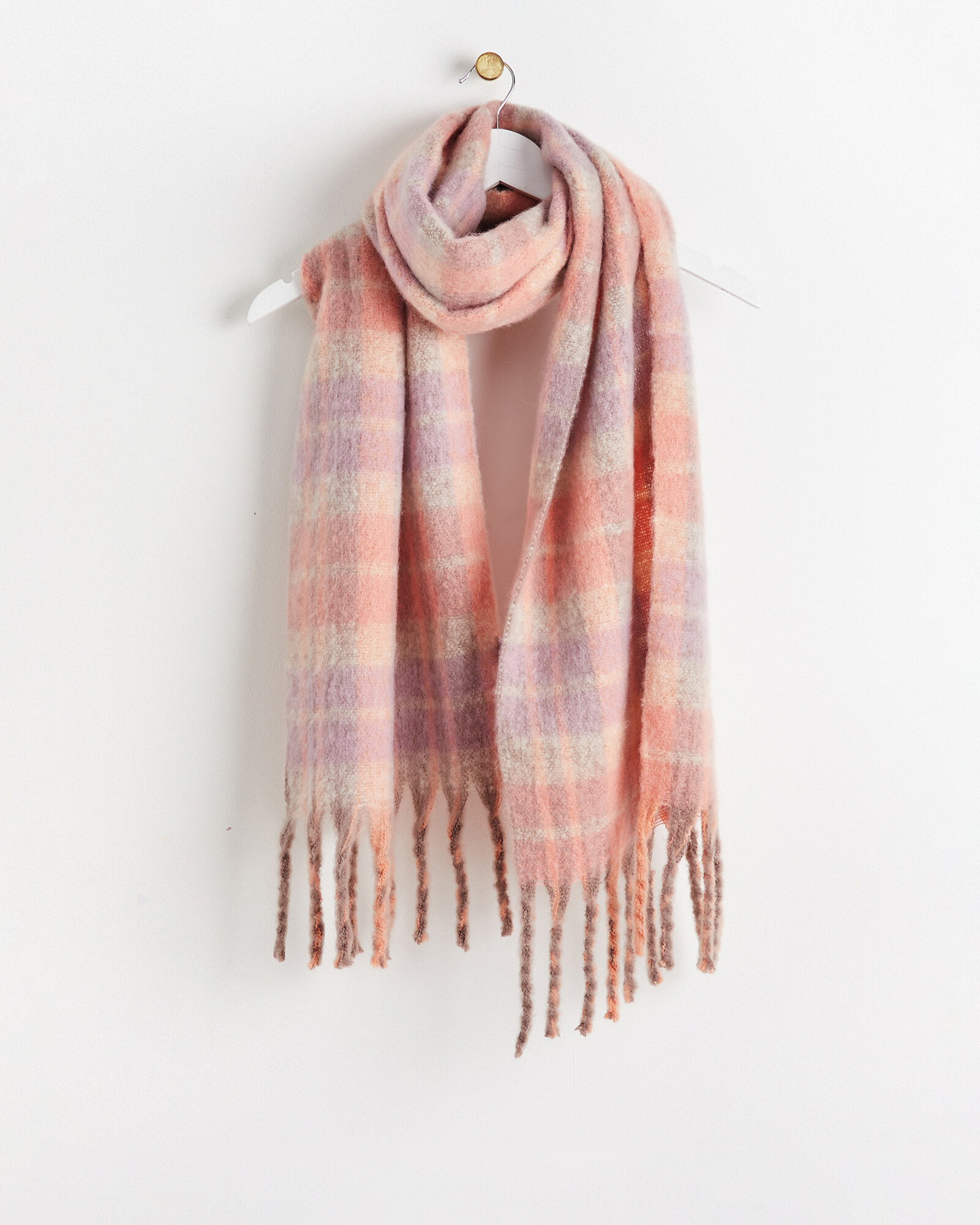 Cosy scarf woven in a mini check design, blending tones of pink and purple in a heavyweight fabric.