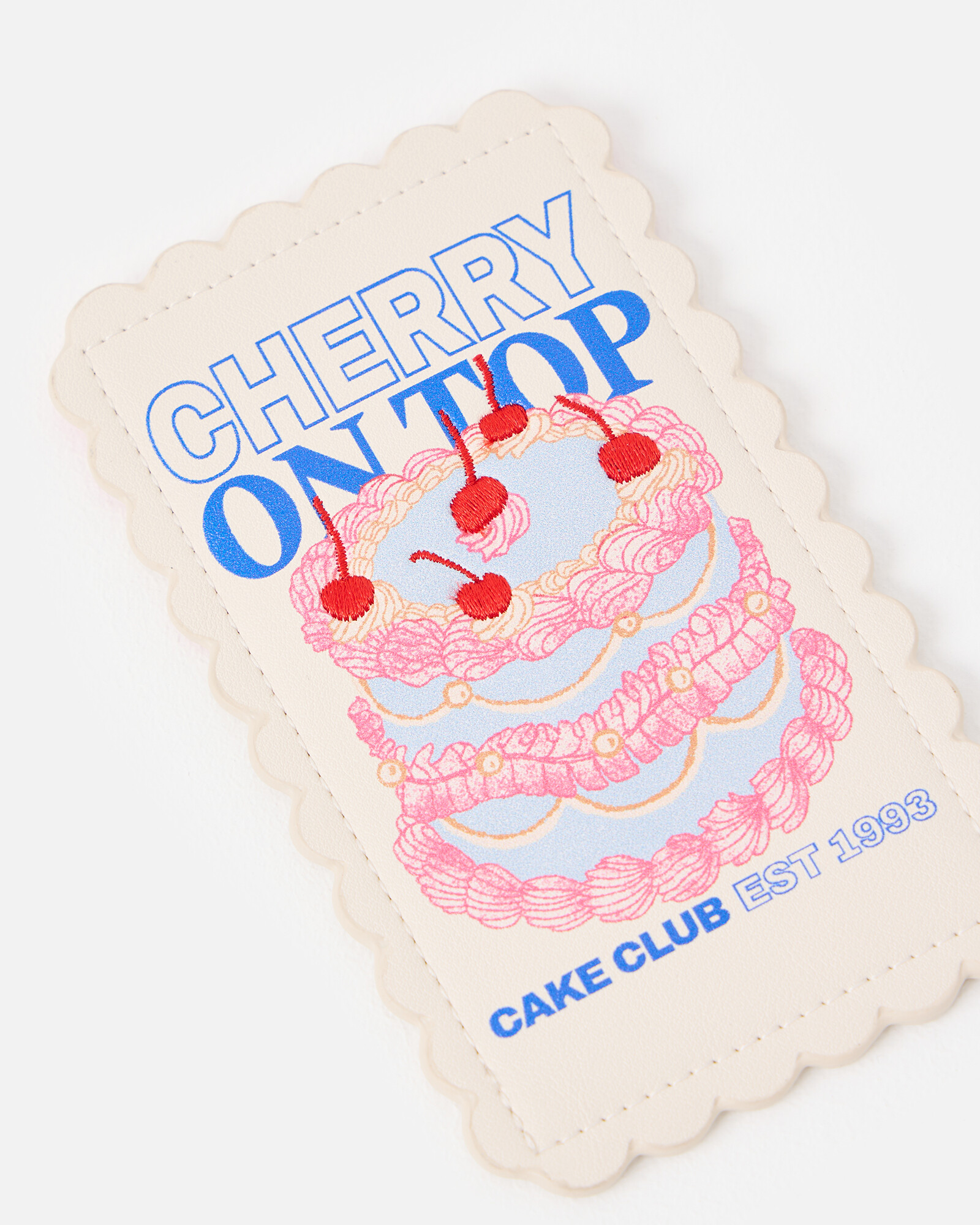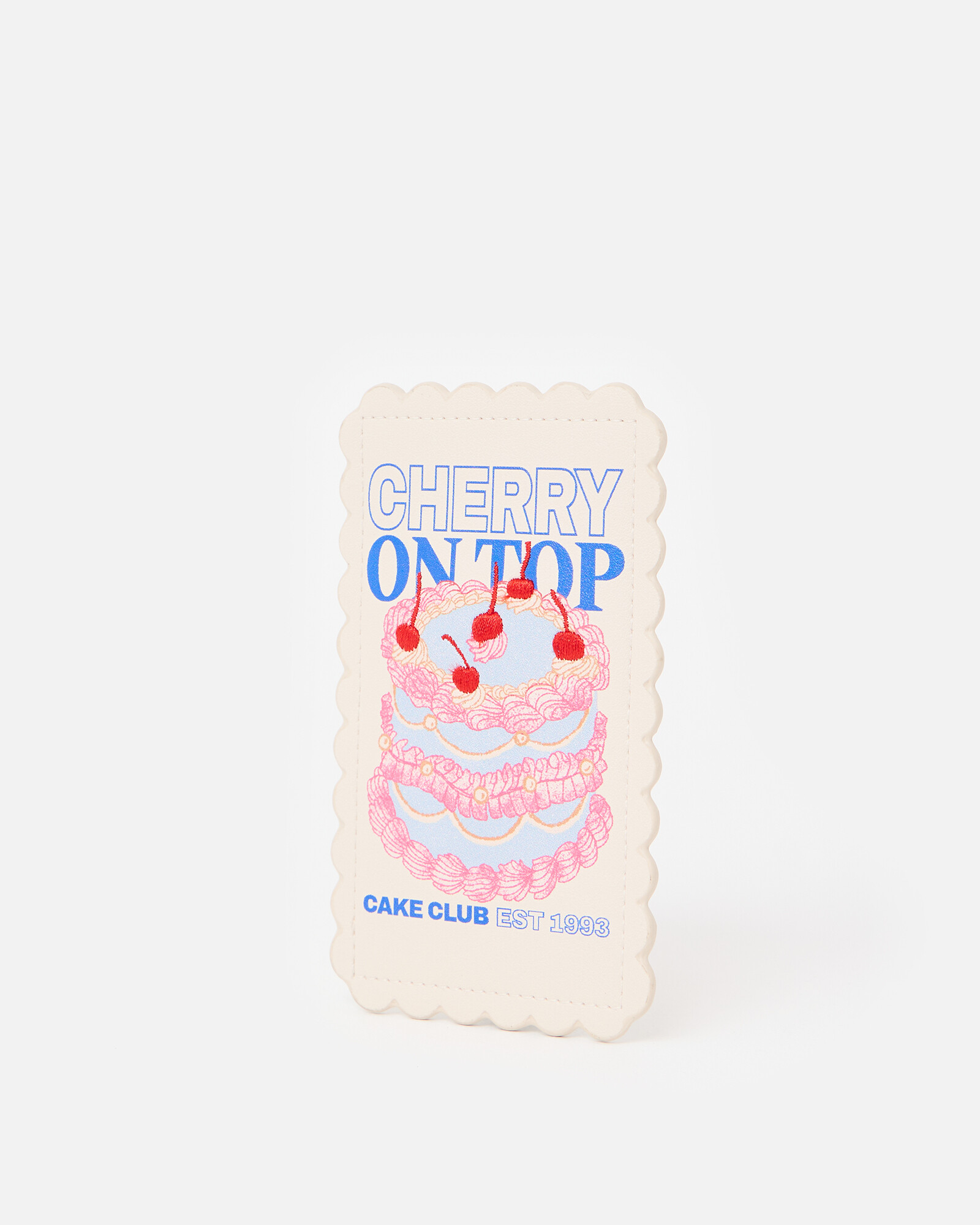 Cream card holder with a blue and pink cherry cake illustration, pink and cream alternating card slots and a scalloped edge.