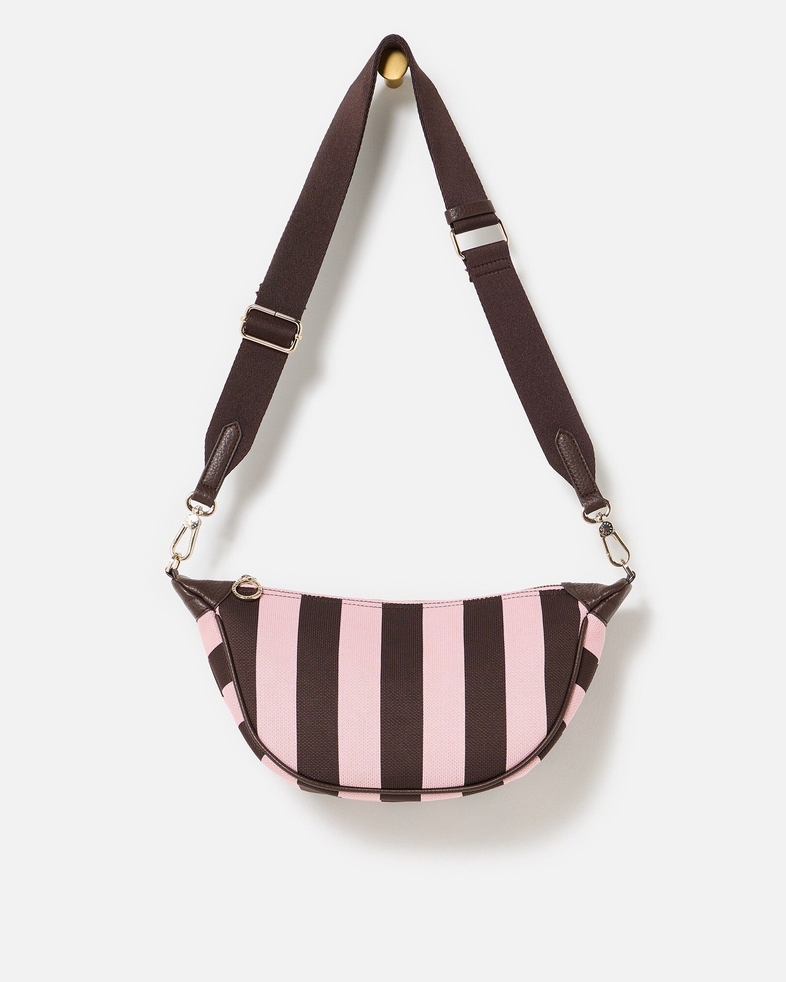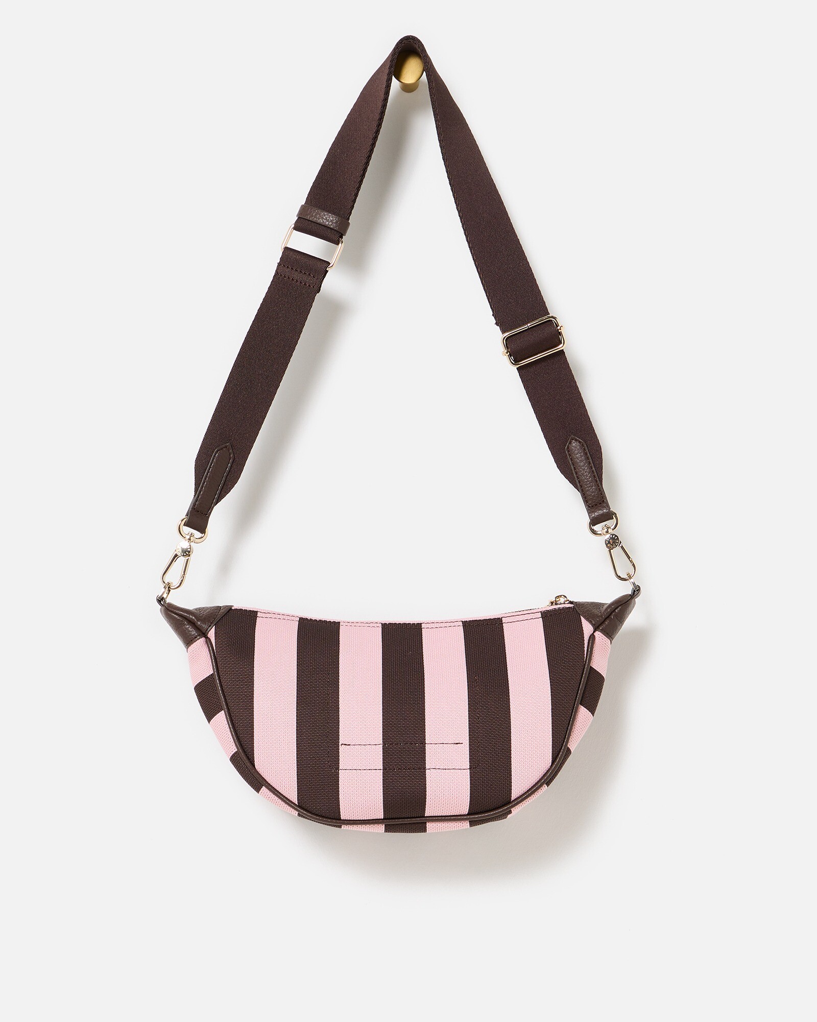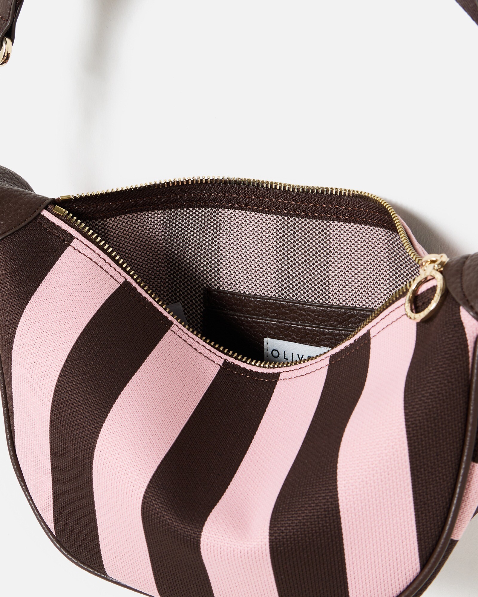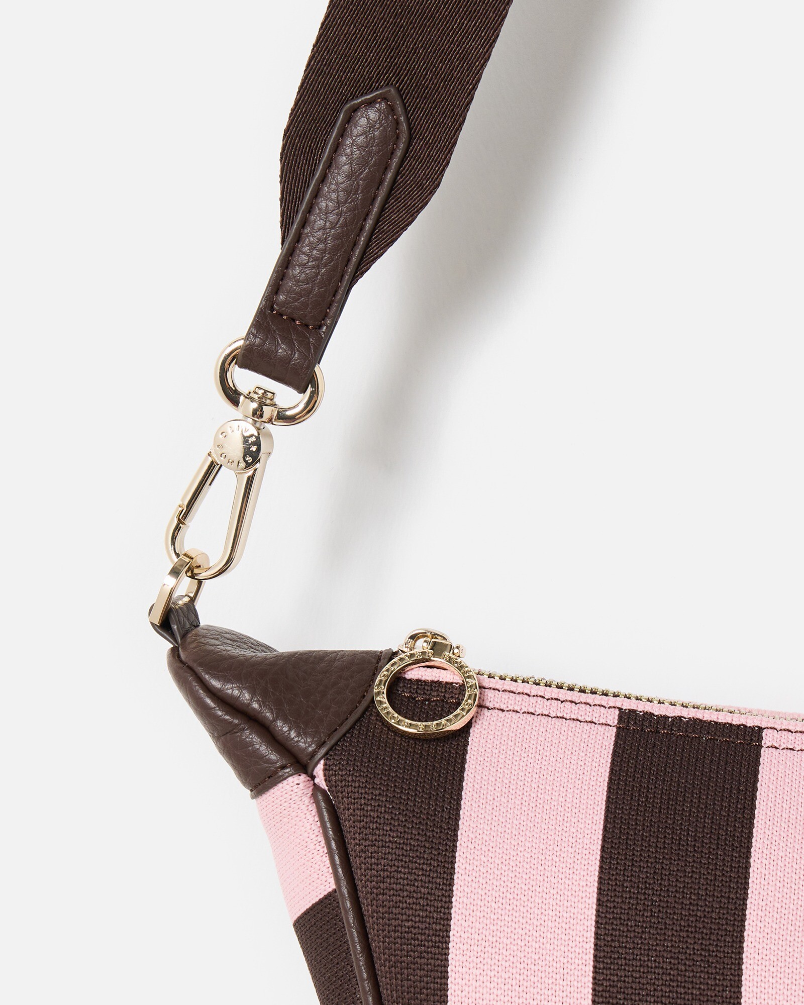 We can't get enough of stripes, especially when those stripes come in candy pink and rich chocolate brown. Our curved sling shape knitted belt bag comes in the colour combo we never knew we needed. It has a zipped main compartment for your summer essentials and a handy interior card organiser. We've added gold-toned hardware and a matching brown woven crossbody strap that can be easily swapped for versatile styling, because we know you like options. It's the everyday hands-free hero bag you need on long, sunny days when you need to juggle your iced coffee while taking a selfie. You multi-tasking queen.