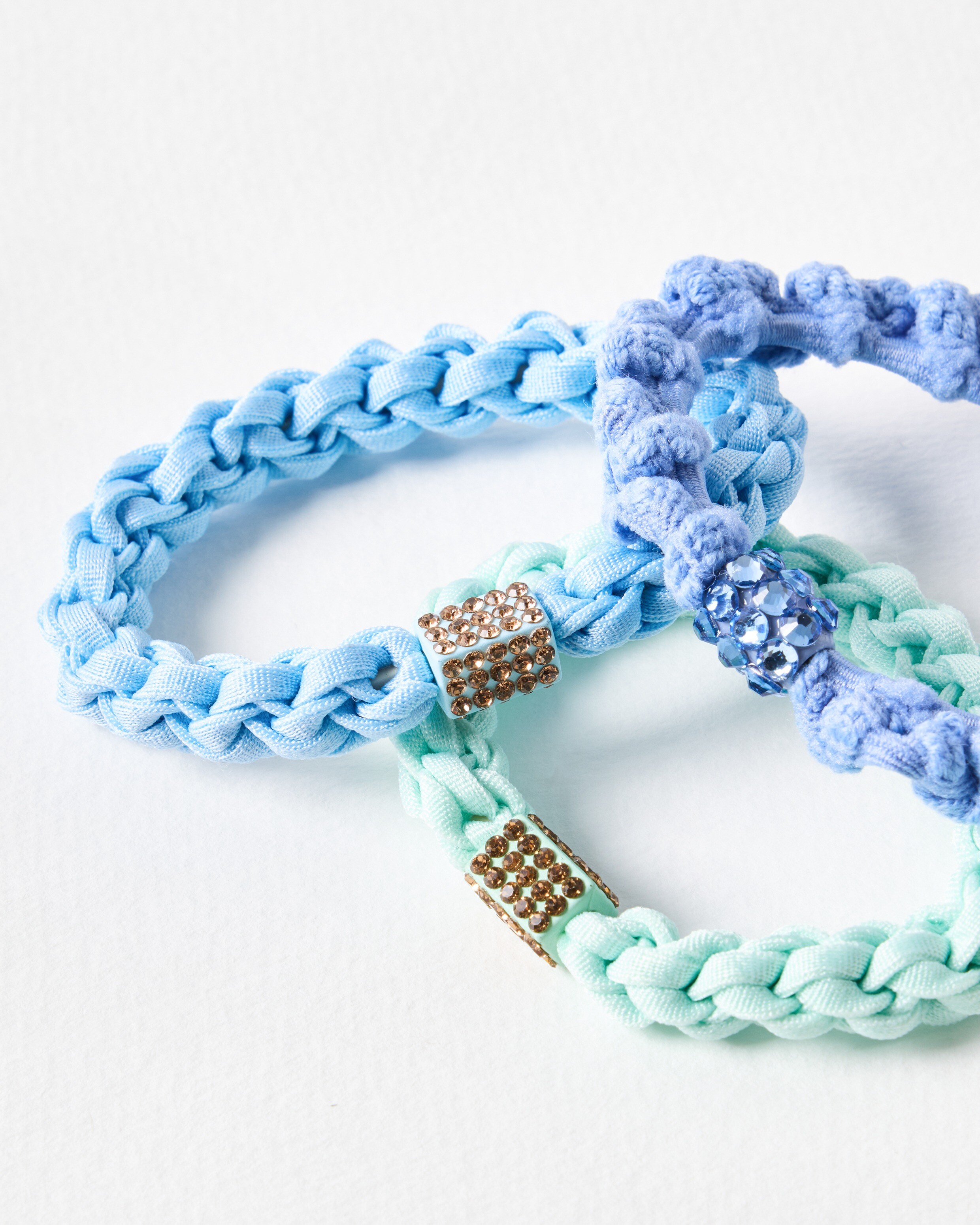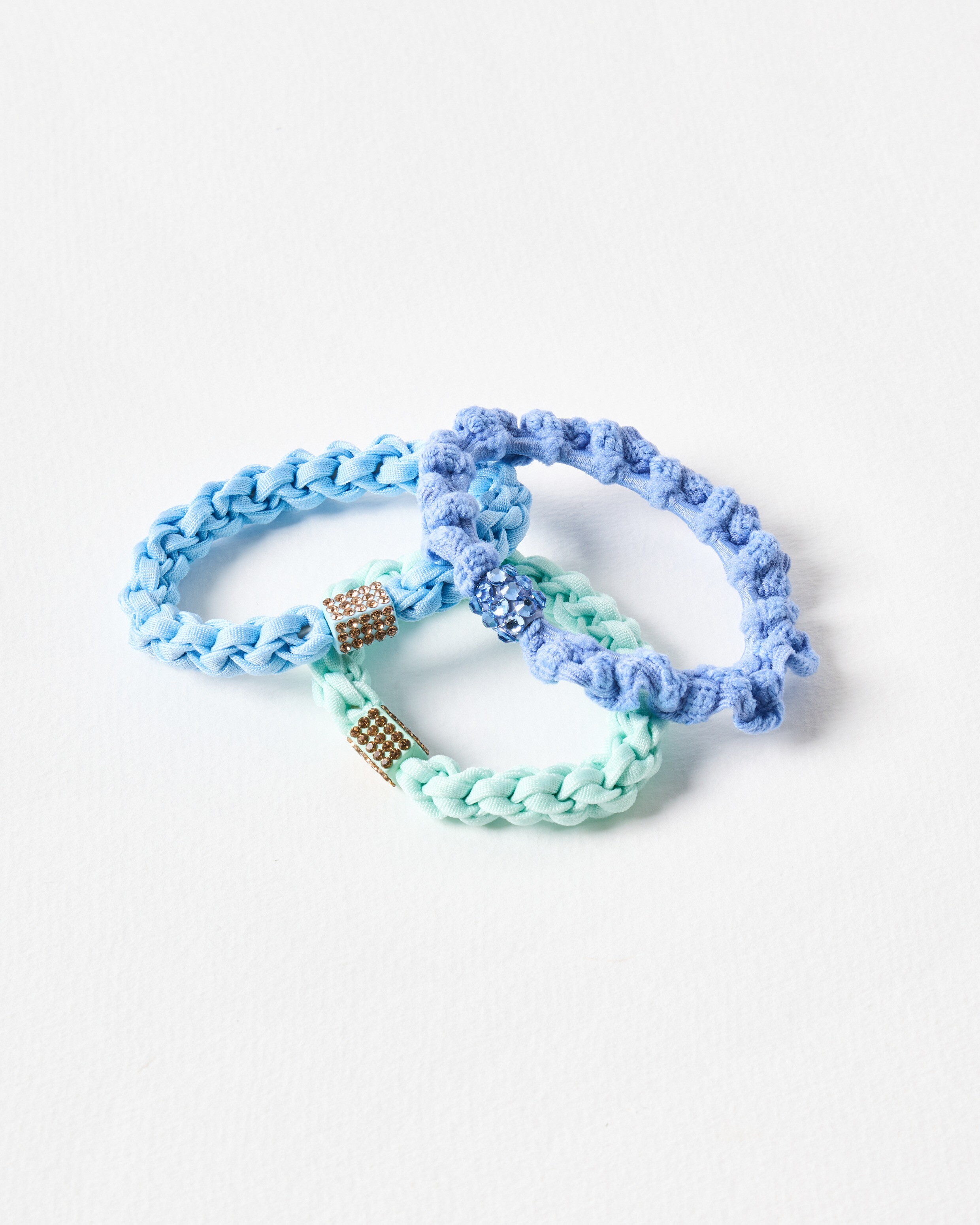 Set of three plaited elastic hair bands woven in tonal blue and mint green yarn with gem embellishments.