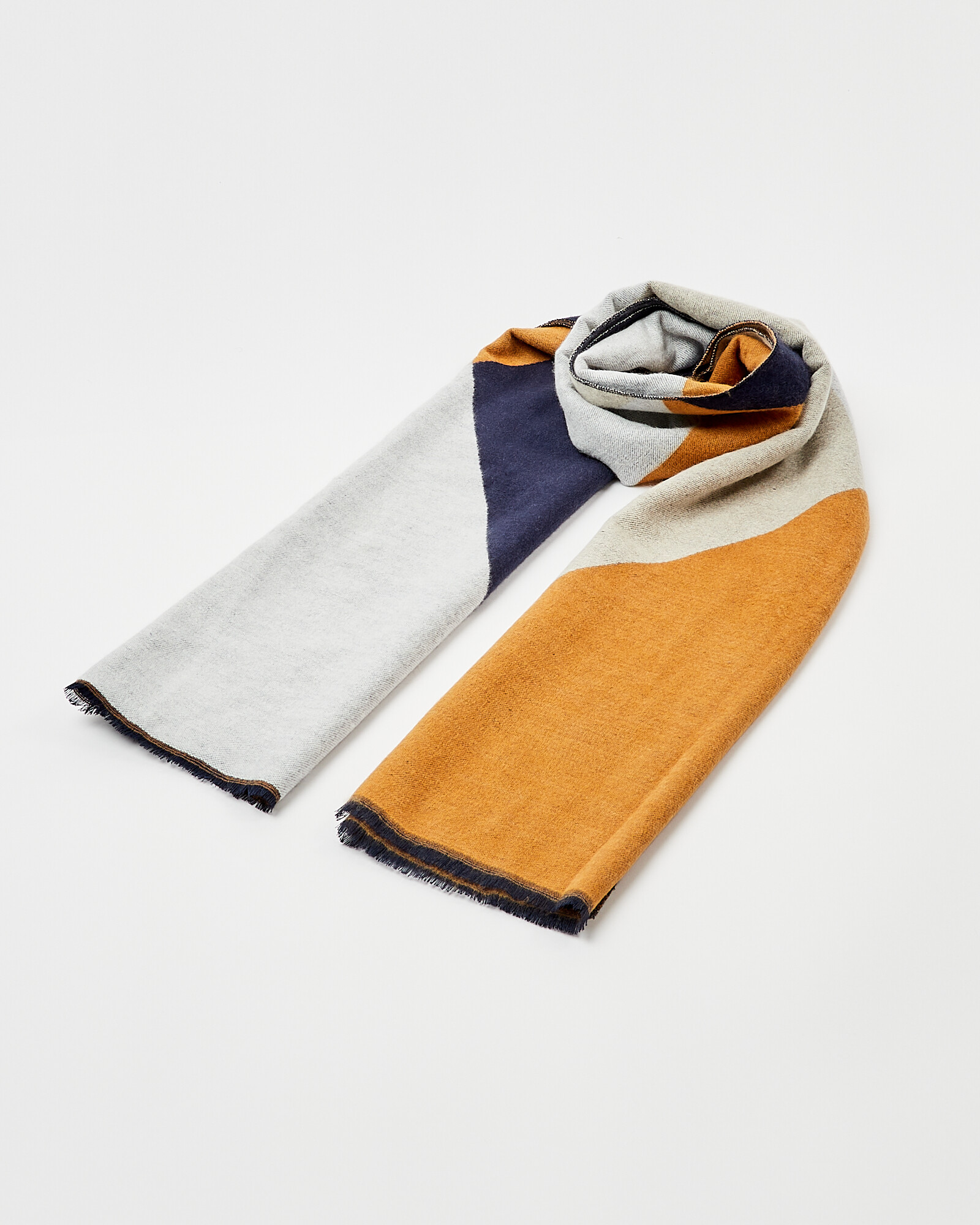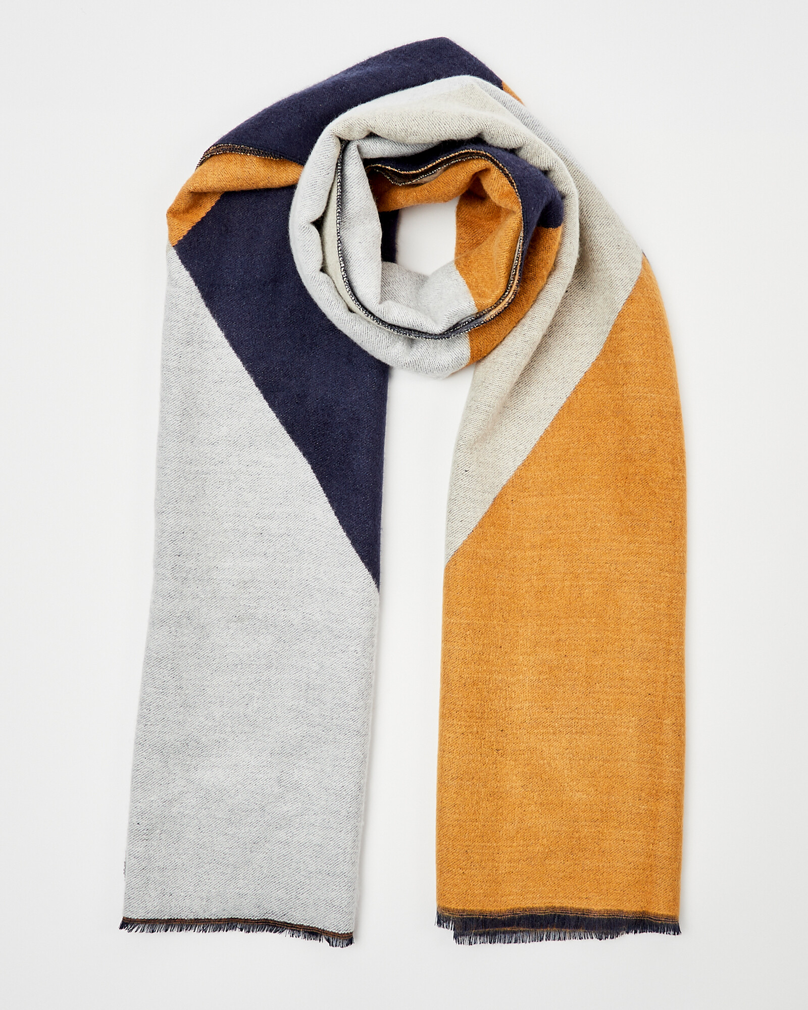 In a colour block pattern, this soft midweight scarf features mustard yellow, navy blue and light grey tones and is complete with frayed edging.