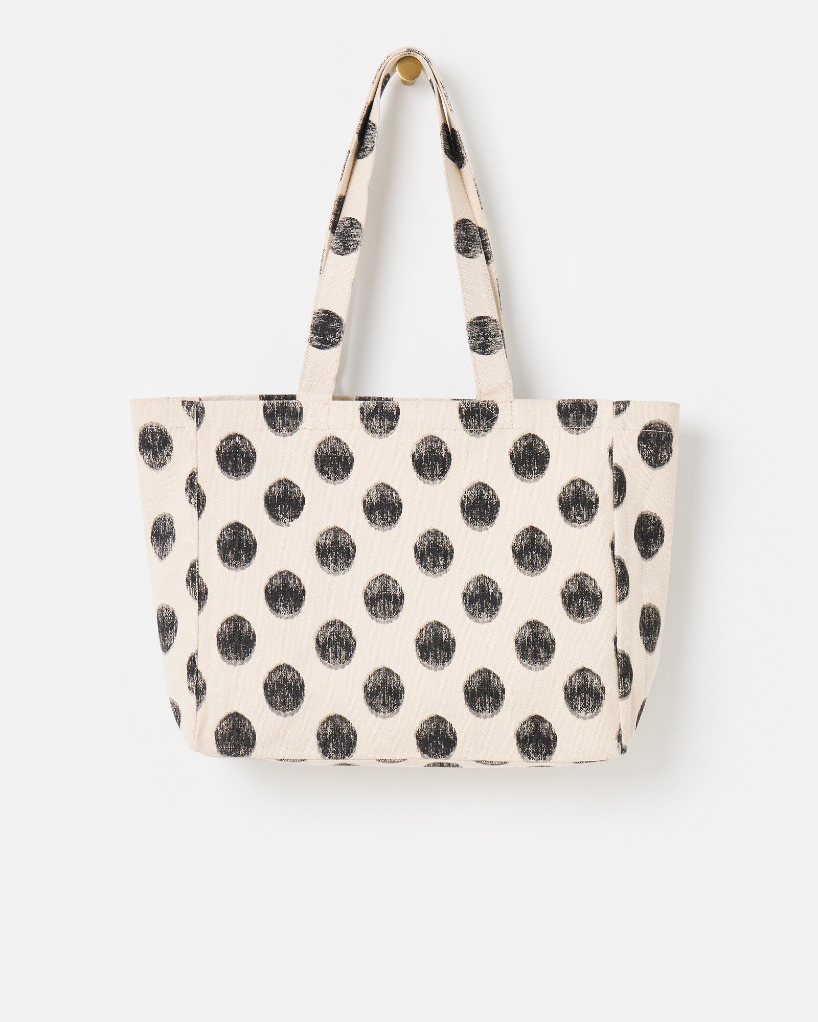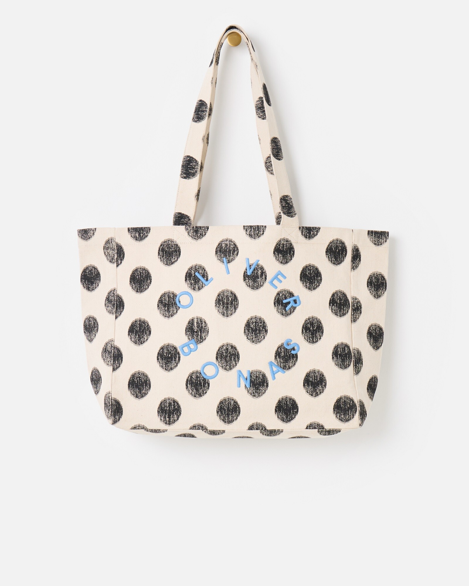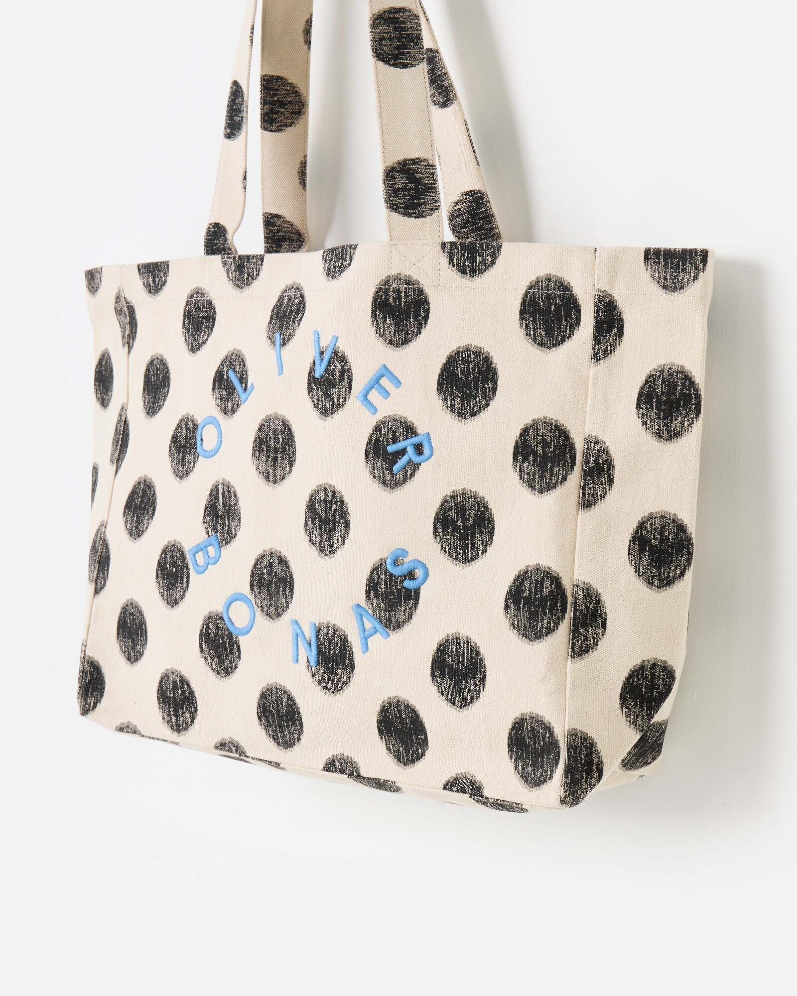 Cream fabric tote bag in a black spotted pattern with matching shoulder handles, an interior pocket and light blue embroidered Oliver Bonas text in a circular design. This large shopper bag is designed to hold everything you need on the go.