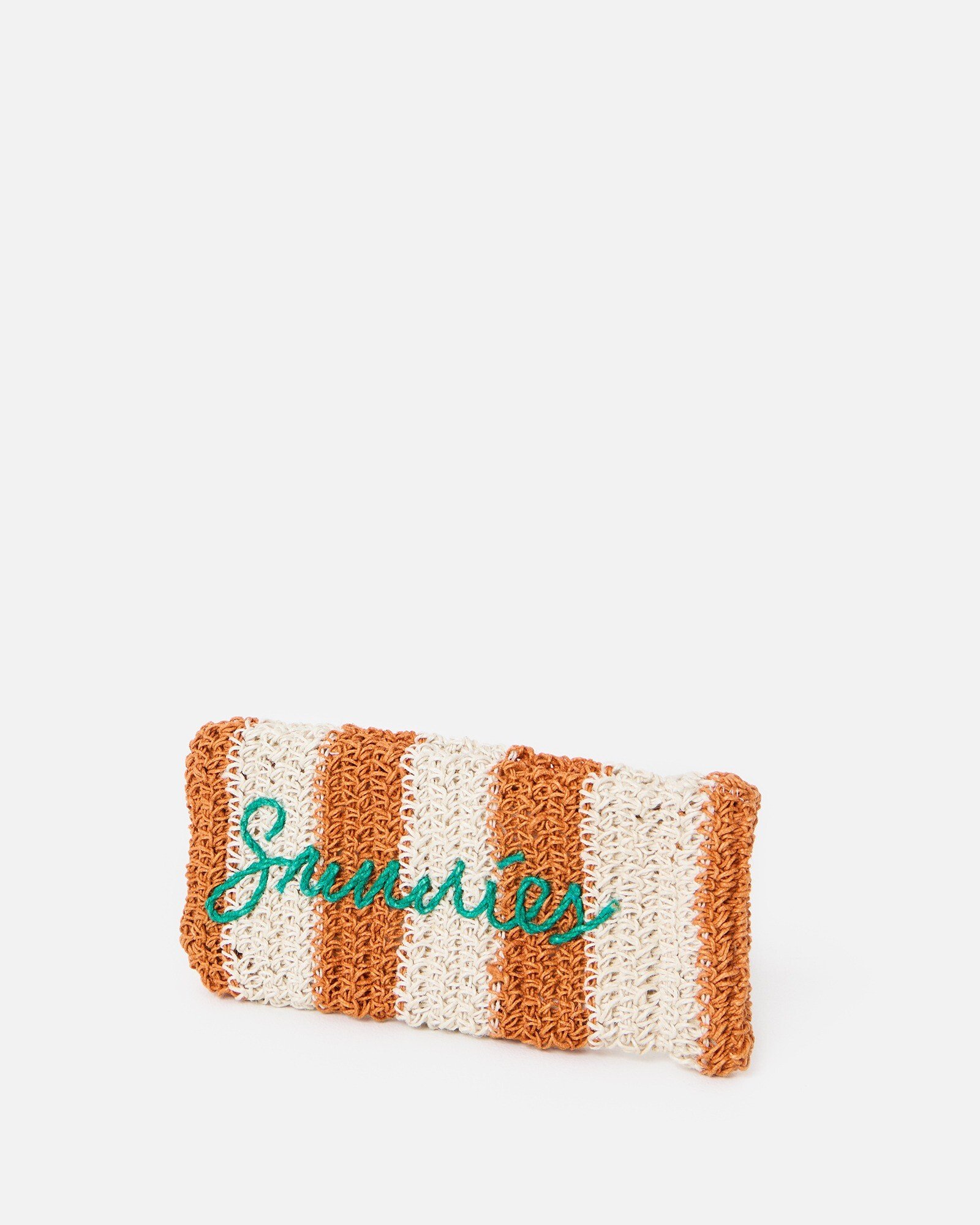 Keep your sunnies protected and scratch-free with this cotton lined sunglasses case. Woven with cream and brown jute using a traditional macrame knotting technique and completed with a green 'sunnies' slogan, it'll make it easy to find your shades at the bottom of your summer tote.