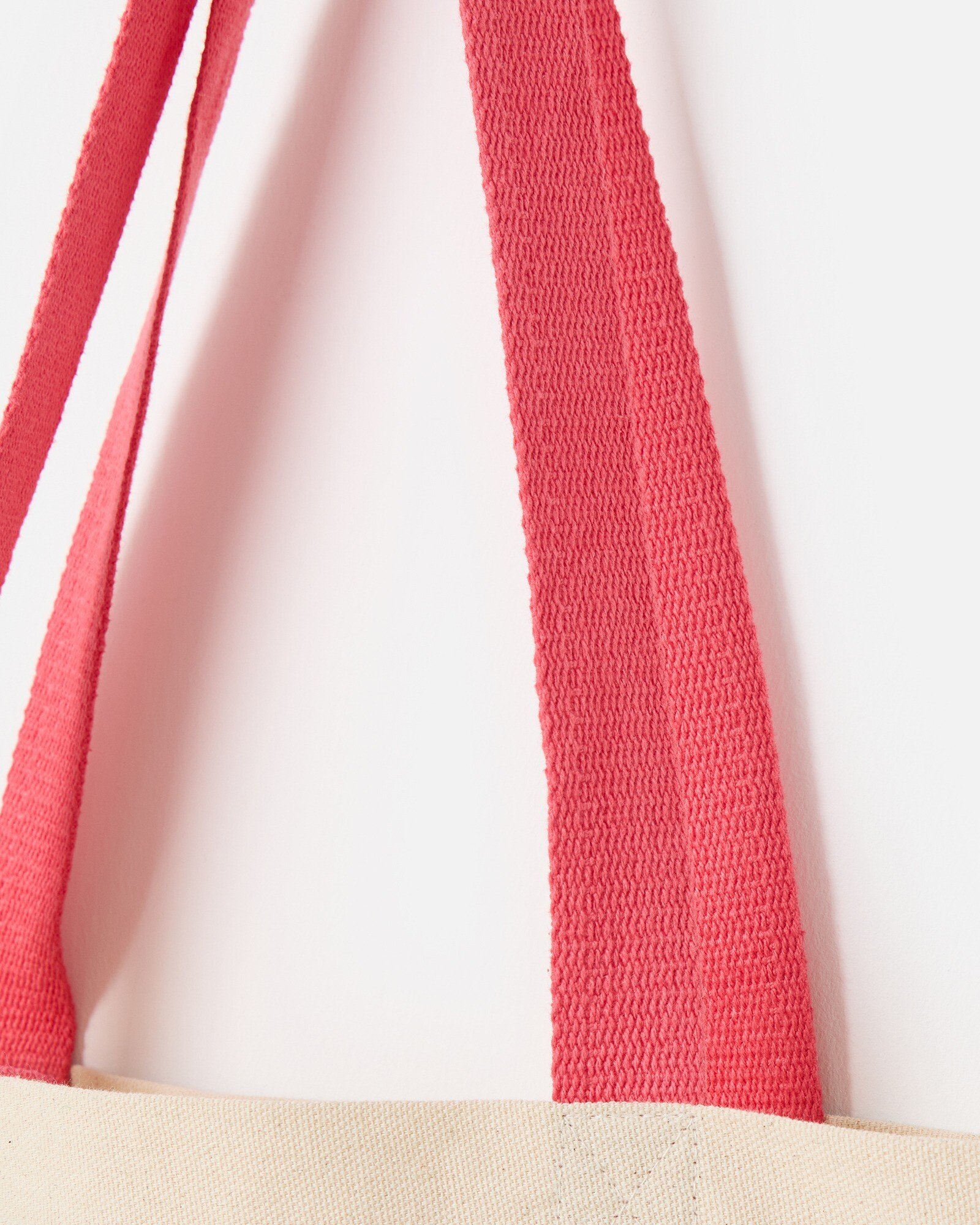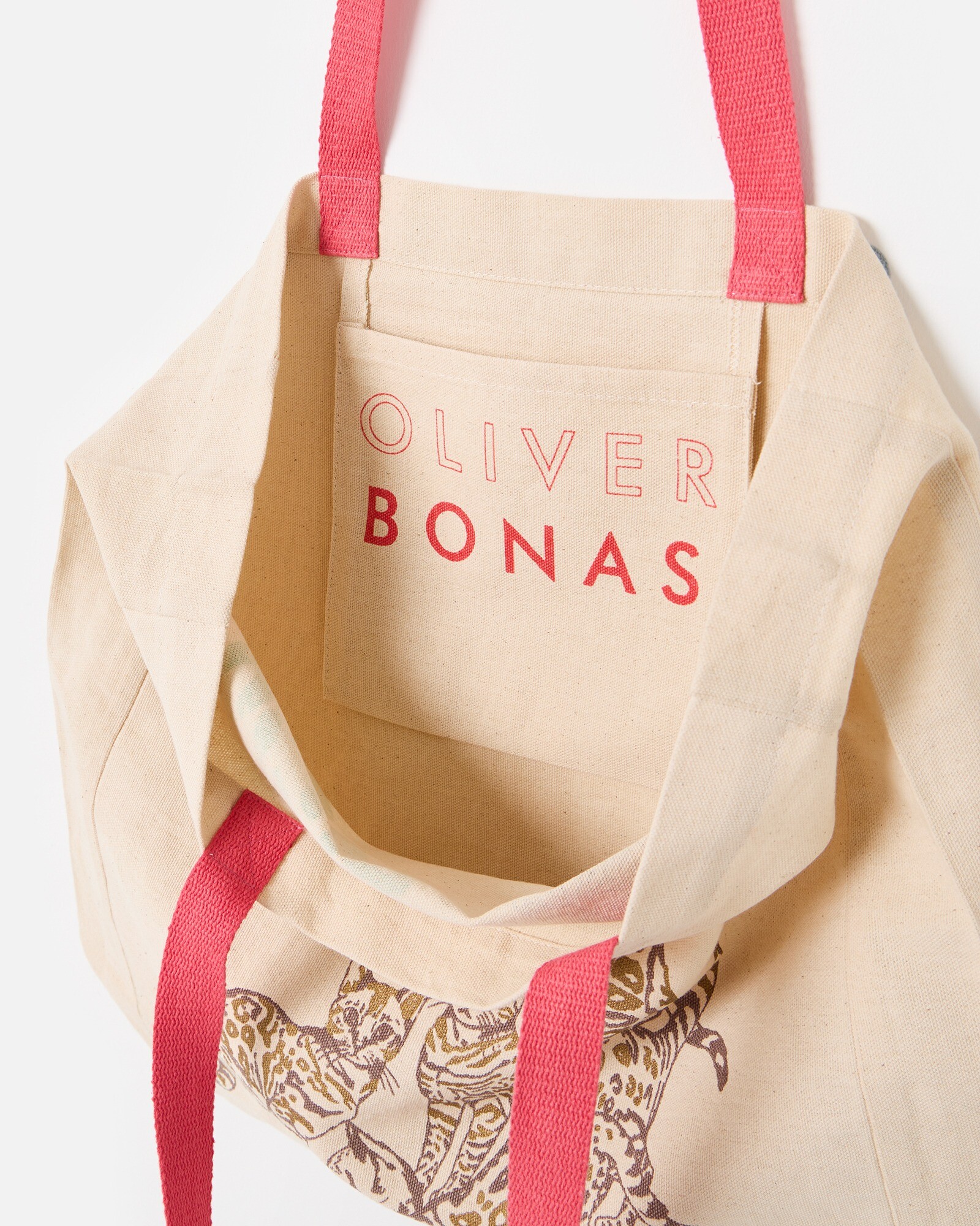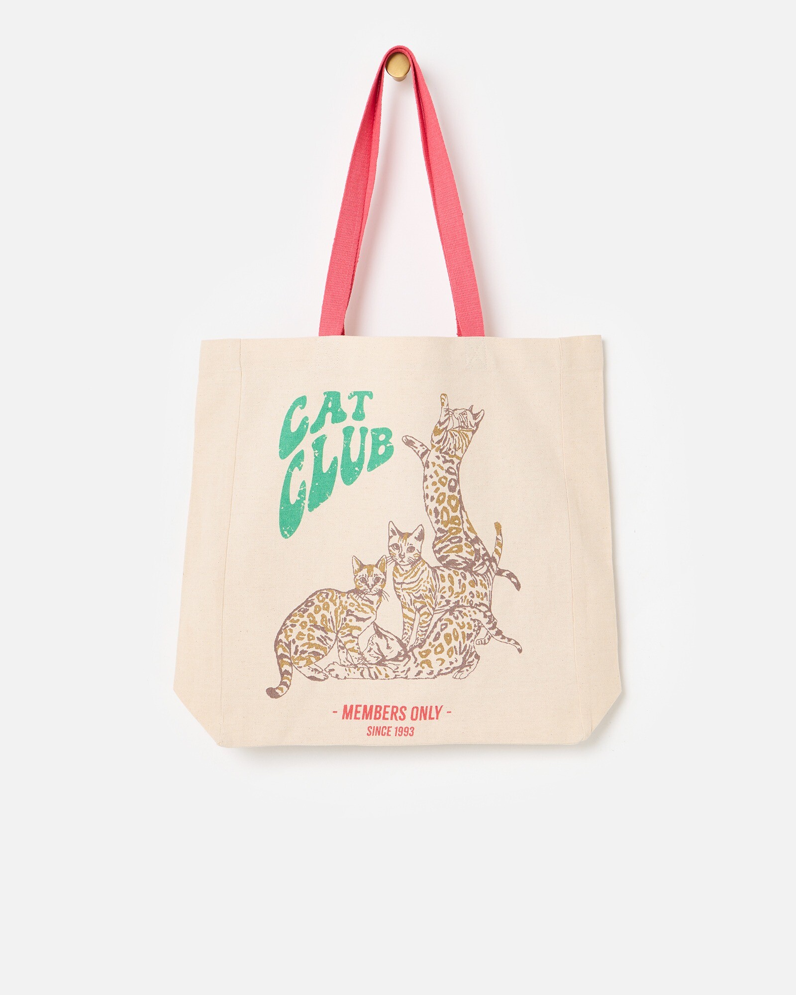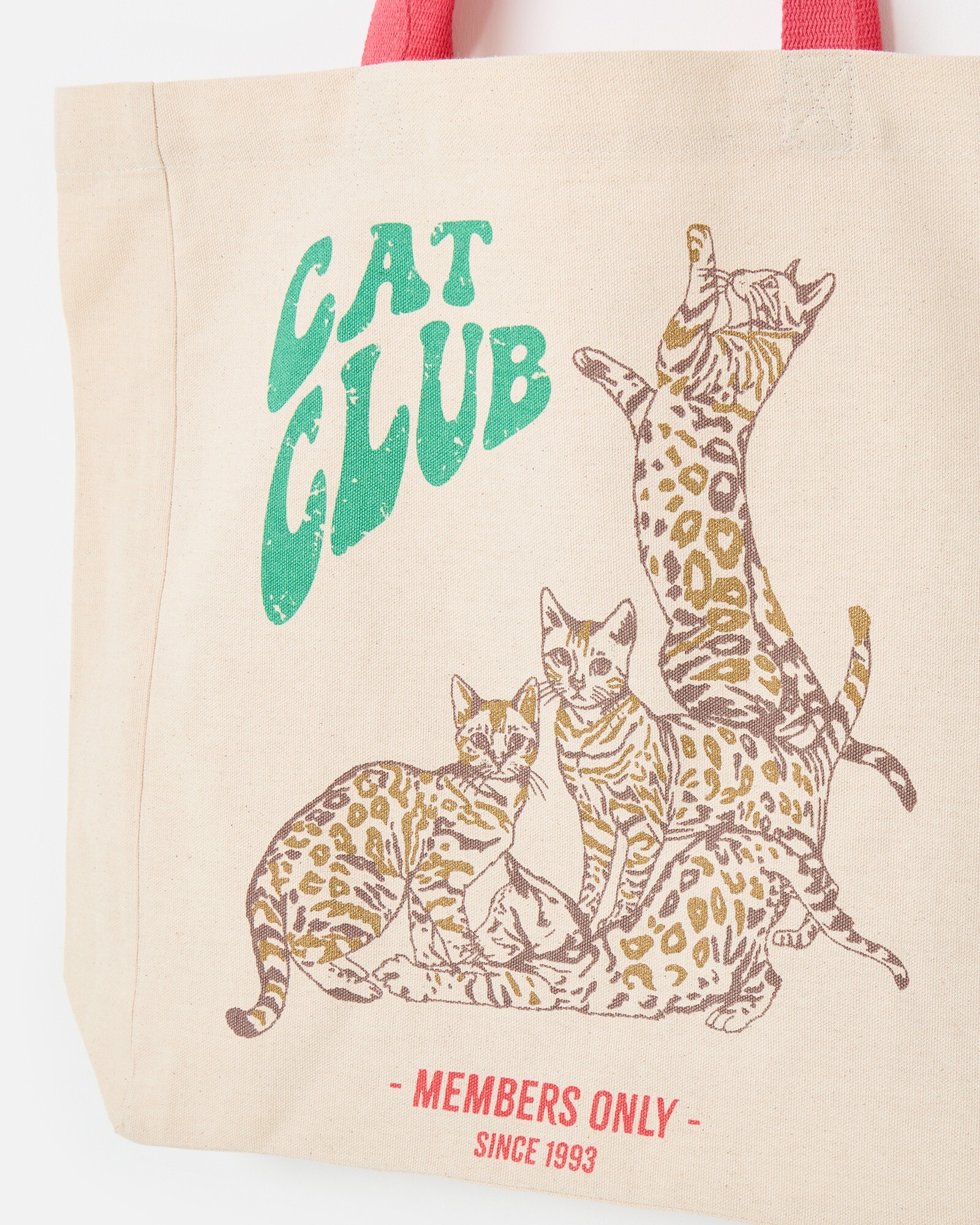 Cream cotton tote bag with a brown and metallic gold cat graphic designed in the OB creative studios, featuring green 'cat club' text. Designed with an interior pocket printed with a pink Oliver Bonas logo and woven pink shoulder handles, this shopper bag is an ideal grab-and-go option this summer.