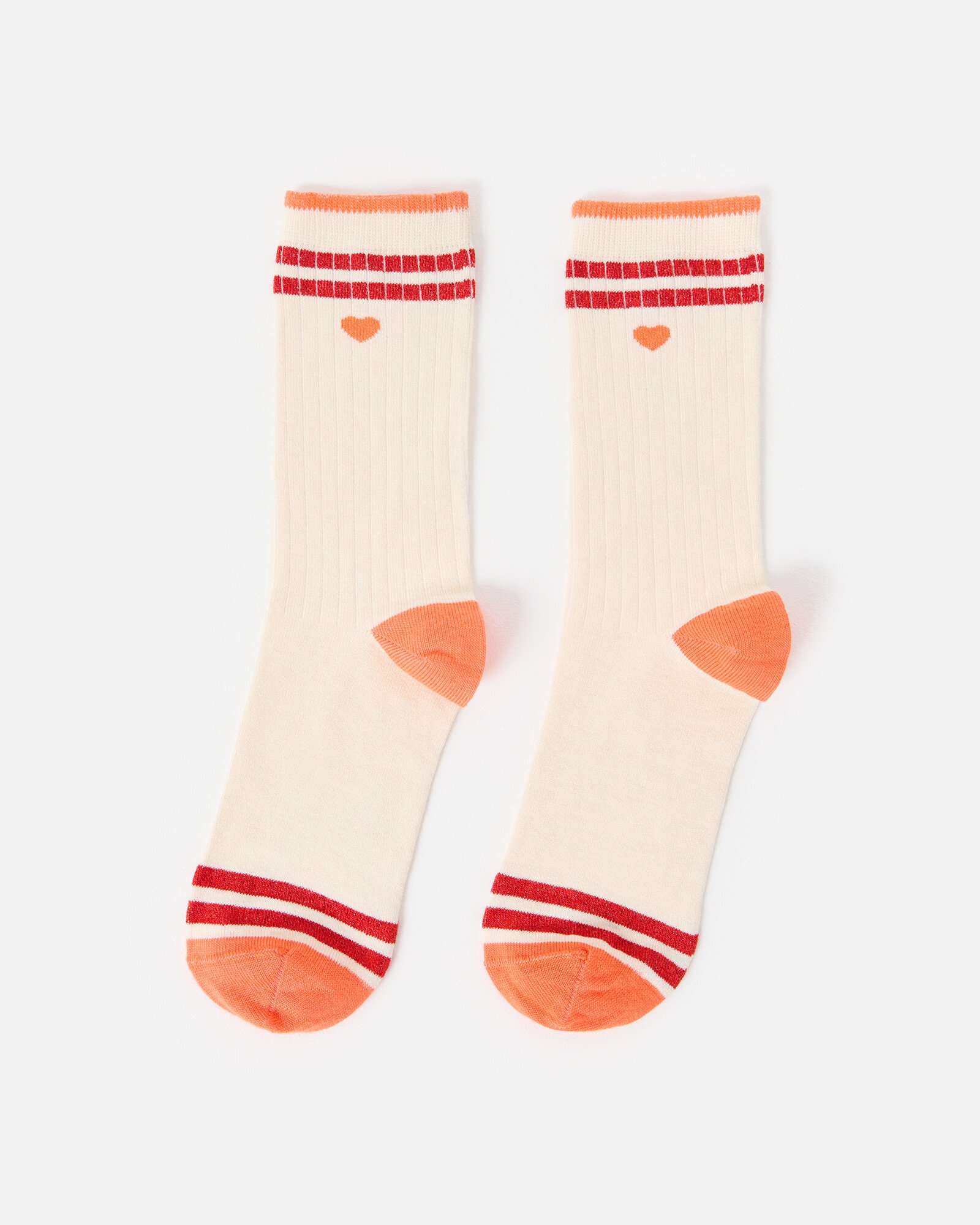 Cream sporty ankle socks knitted in a ribbed pattern with metallic red stripes on the trims and an orange heart.