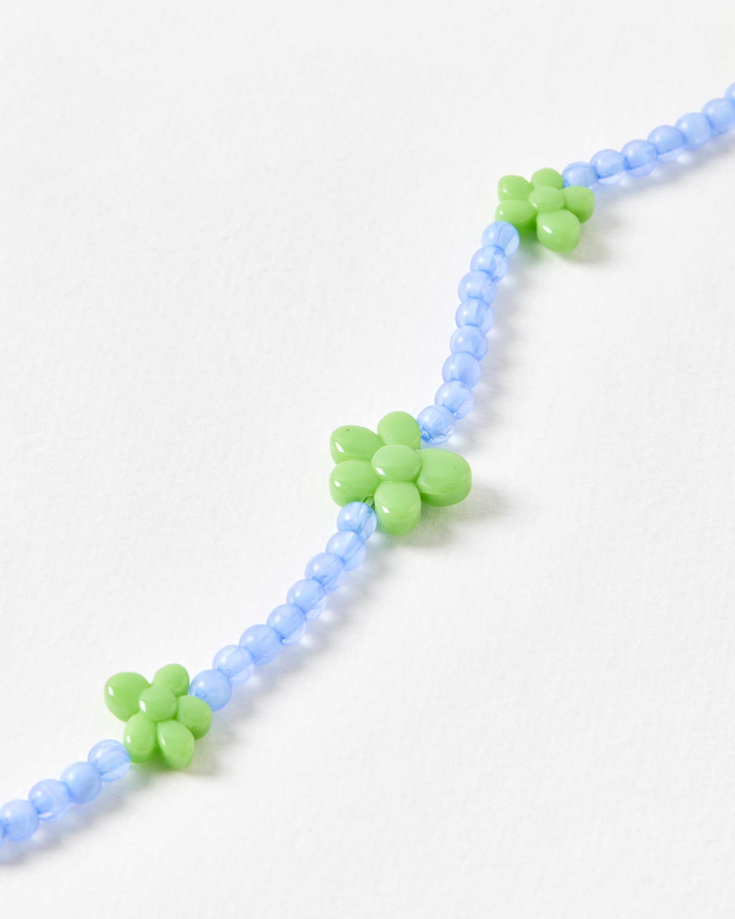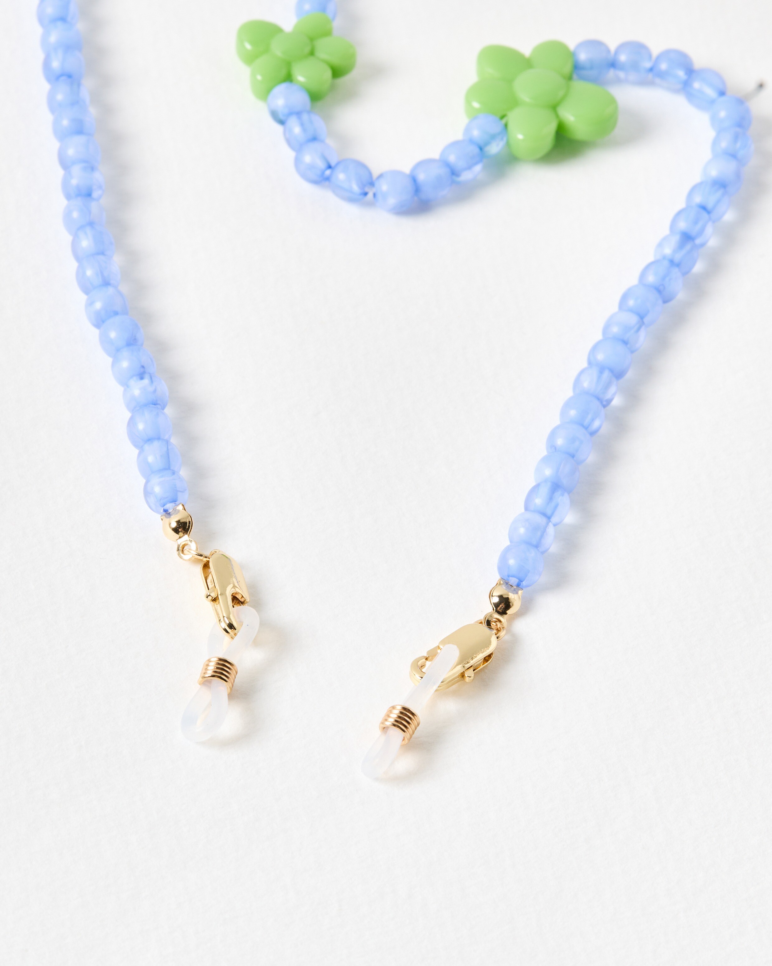 Beaded glasses chain with small faceted blue beads interspersed with green flower beads all the way around. Finished with gold tone hardware and two white rubber loops two secure to your glasses arms, wear on holiday as a sunglasses chain for a bright pop of colour, or use with your everyday and reading glasses at home or work.