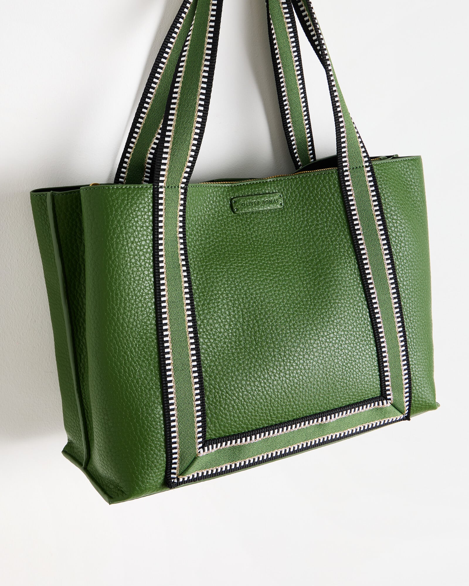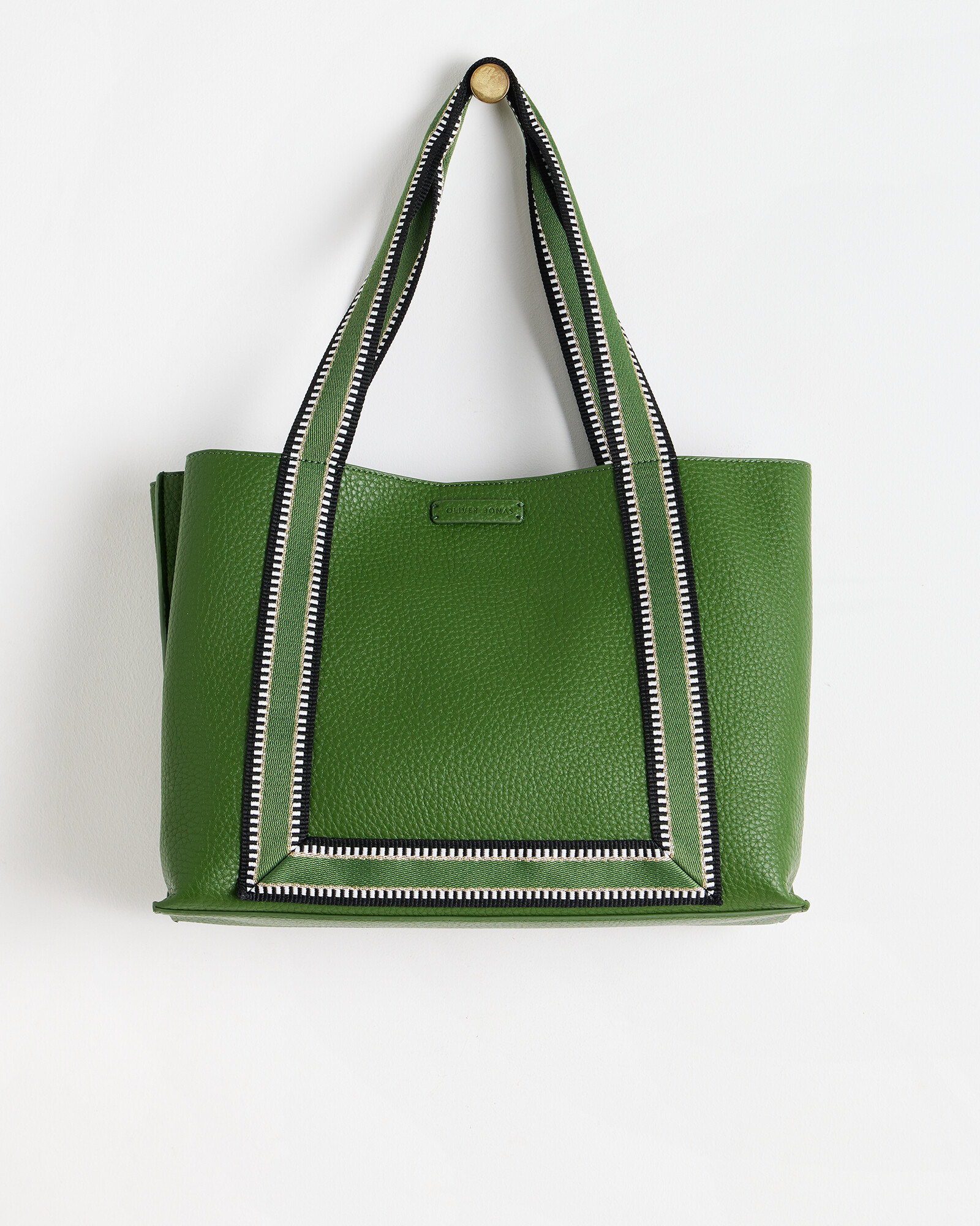 Green tote bag with a black, metallic and white woven strap that continues down the bag.