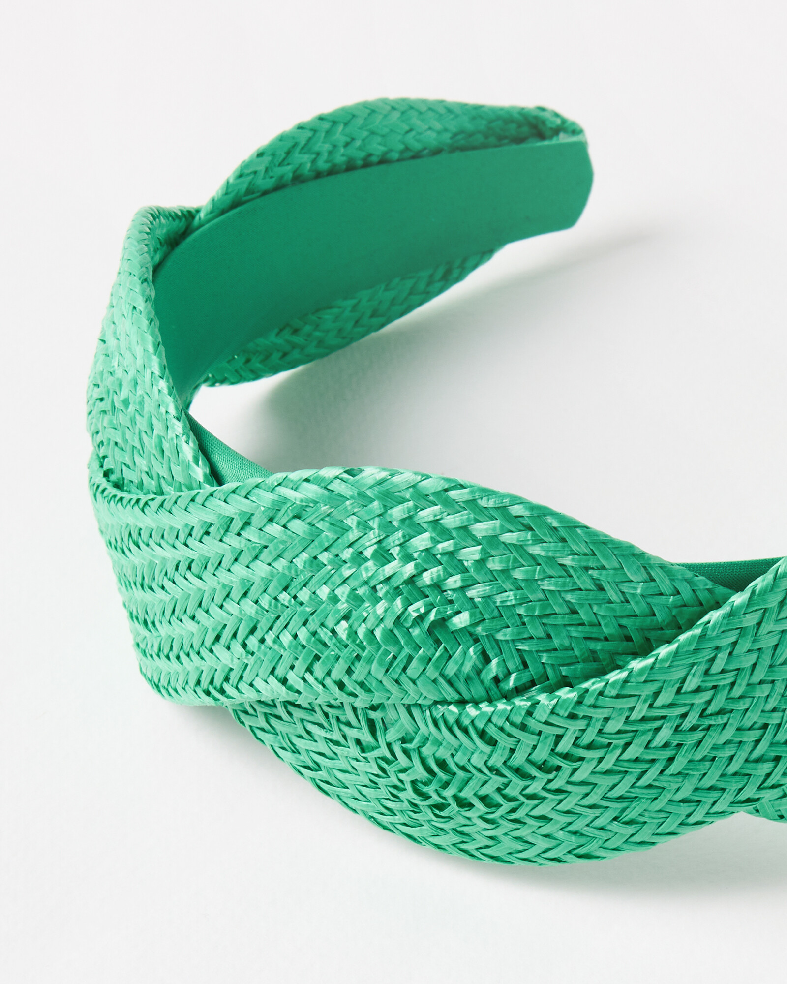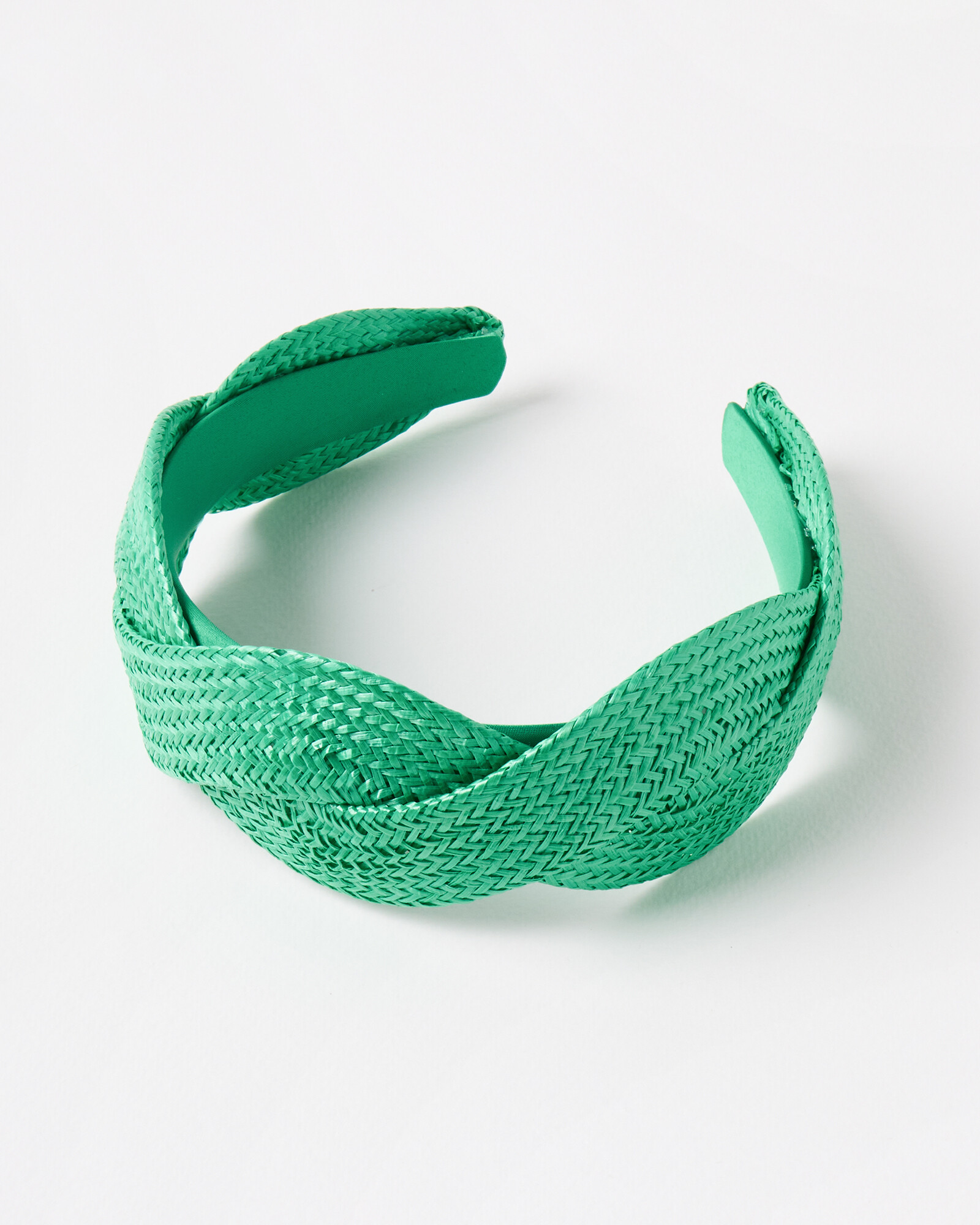 Wide green fabric headband with a plaited design and intricate woven pattern.