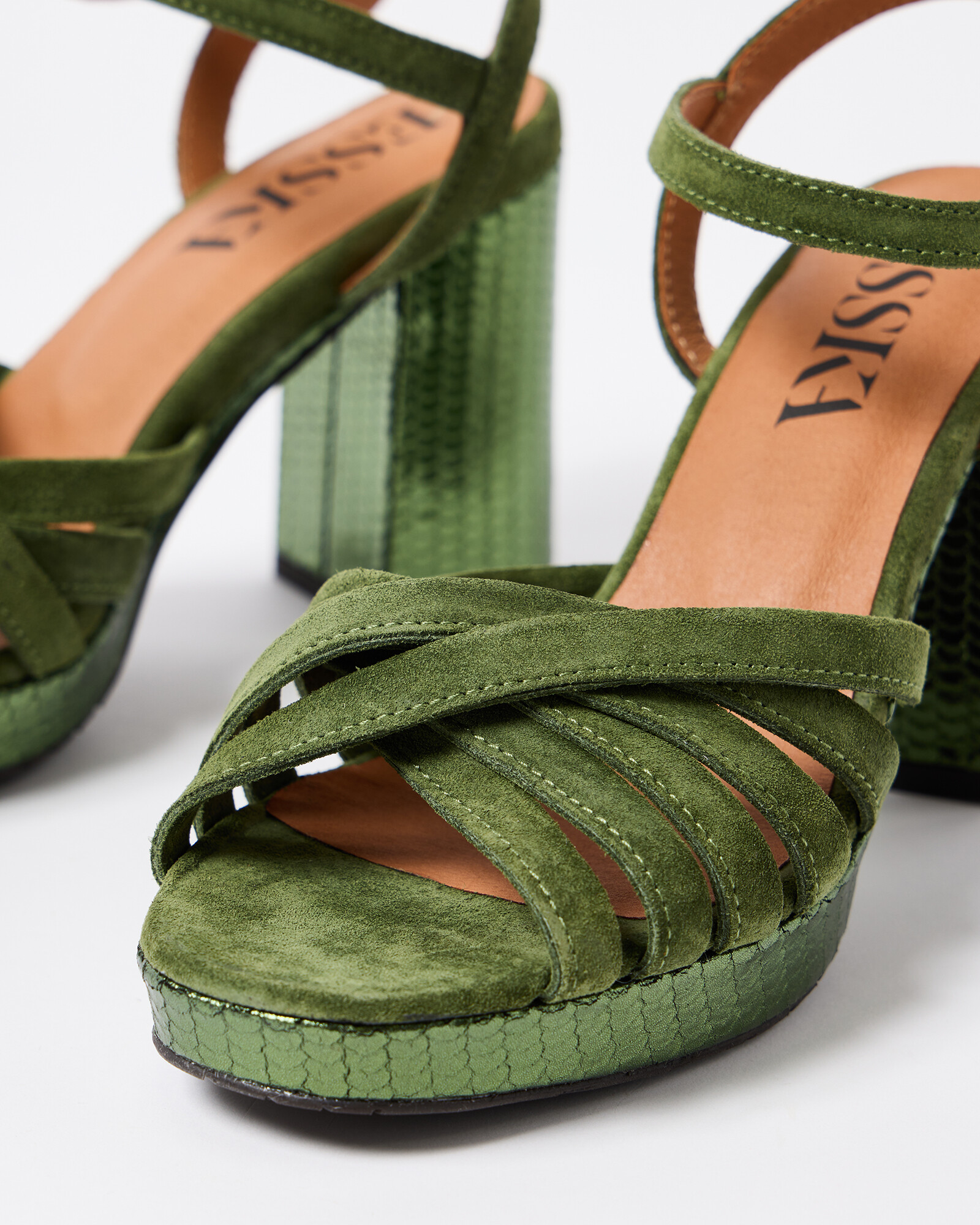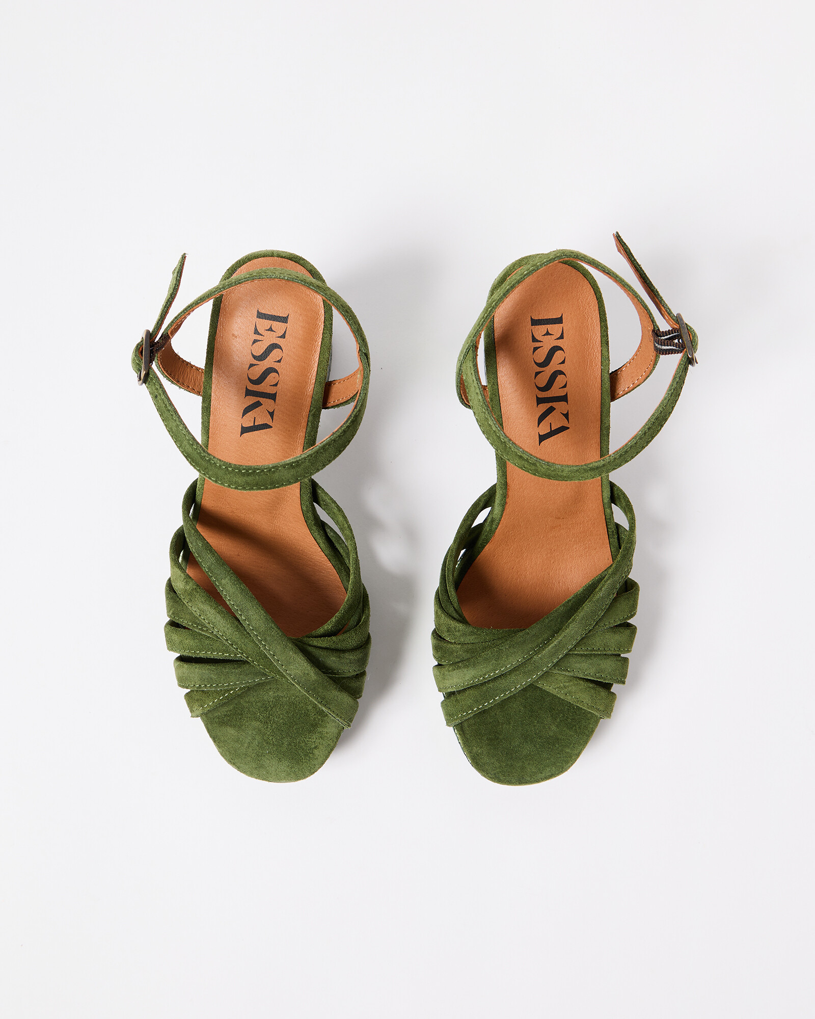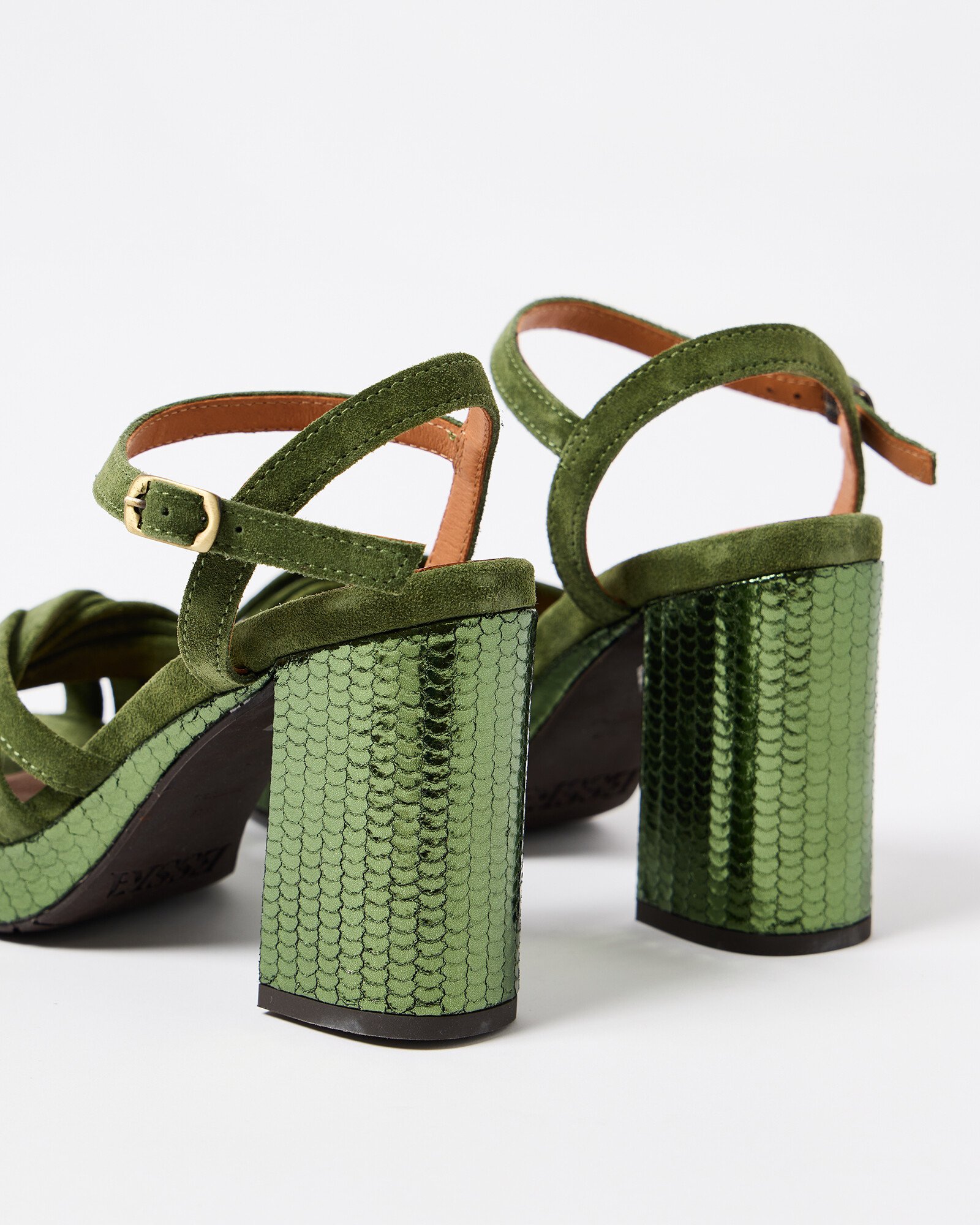 Heeled Esska sandals with a multi-strap design in green velvet, metallic embossed leather sole and buckle ankle fastening.