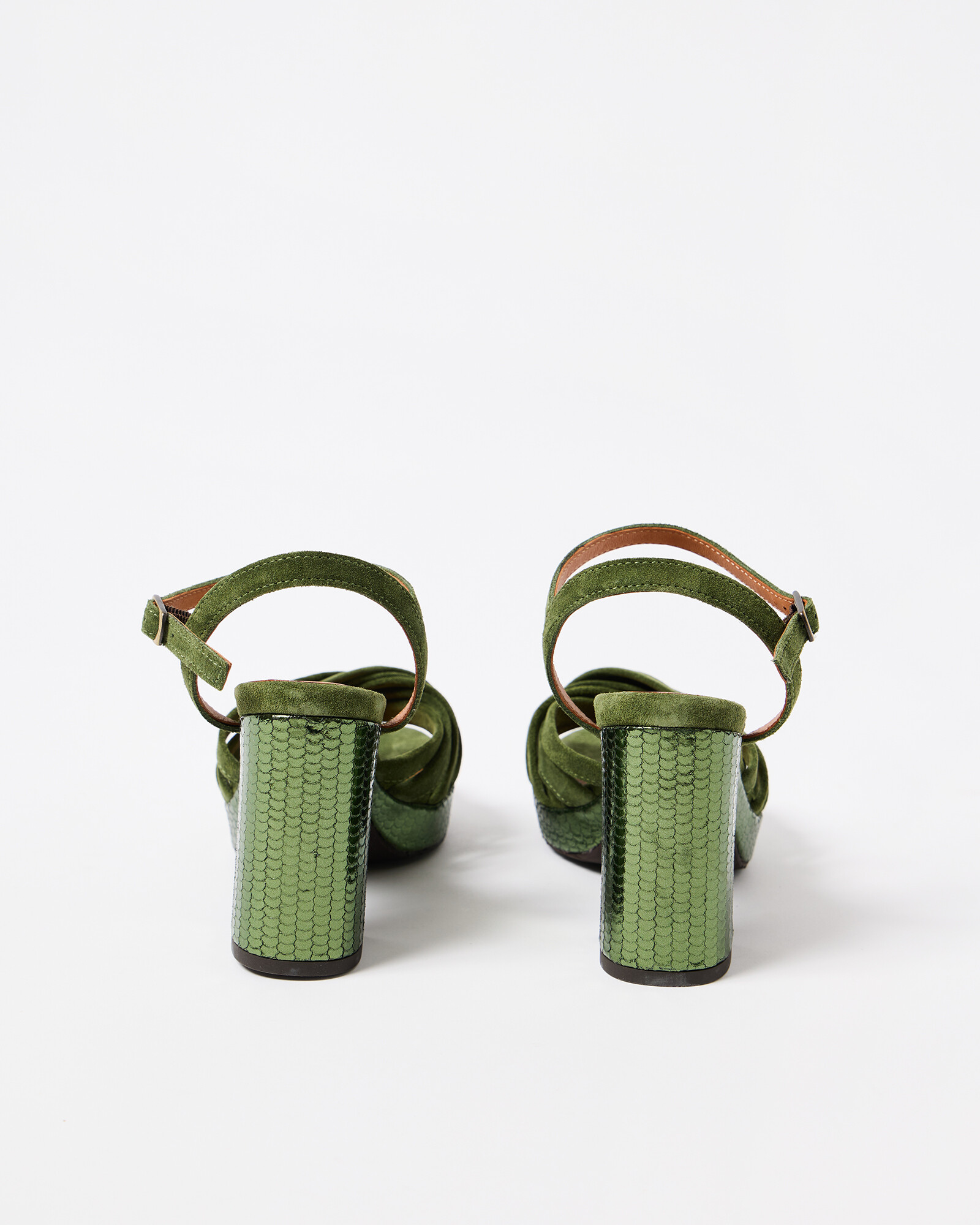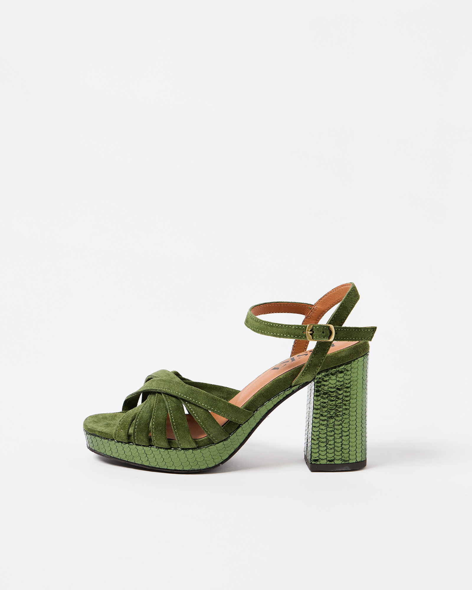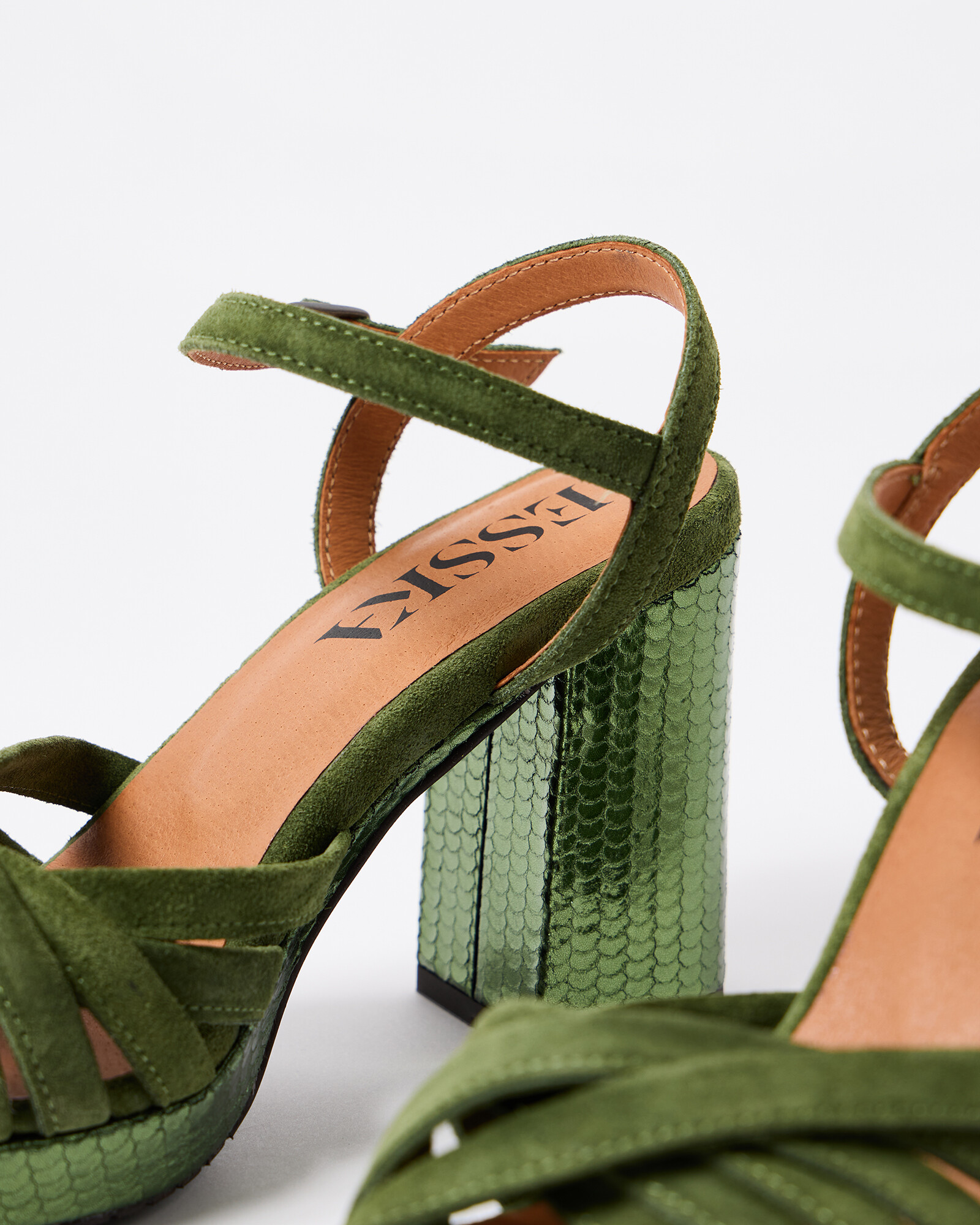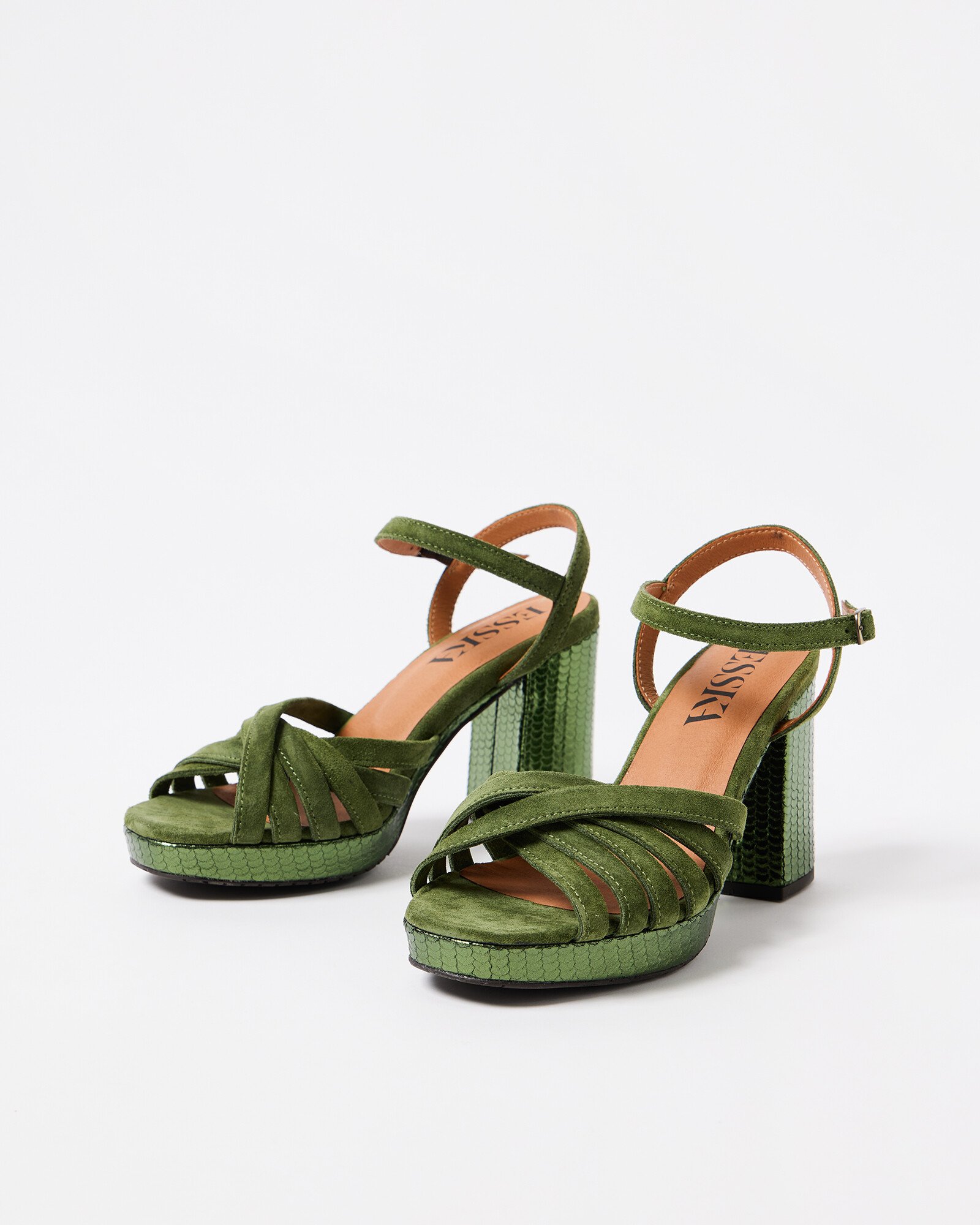 Heeled Esska sandals with a multi-strap design in green velvet, metallic embossed leather sole and buckle ankle fastening.