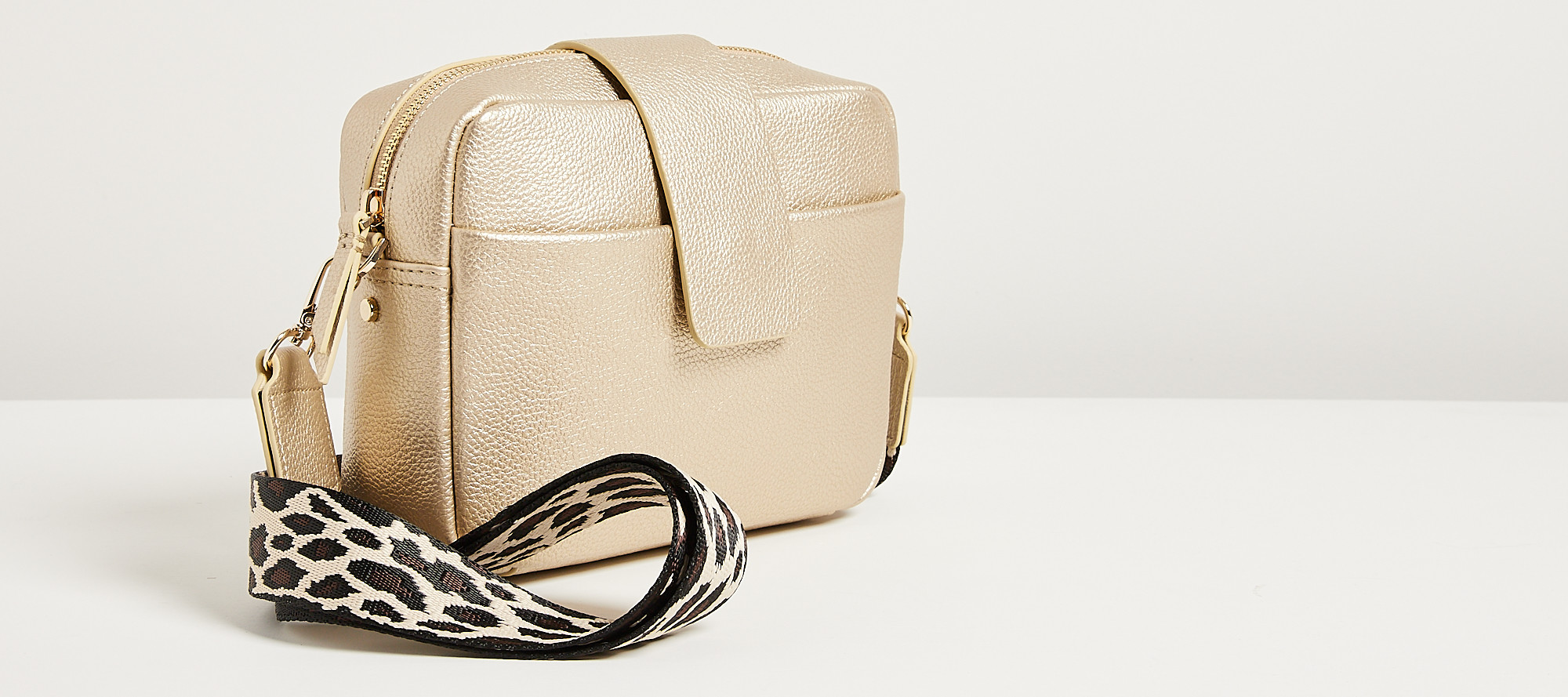 Combining a metallic tone with animal print, this crossbody camera bag is completed with luxe gold-toned metal fittings.