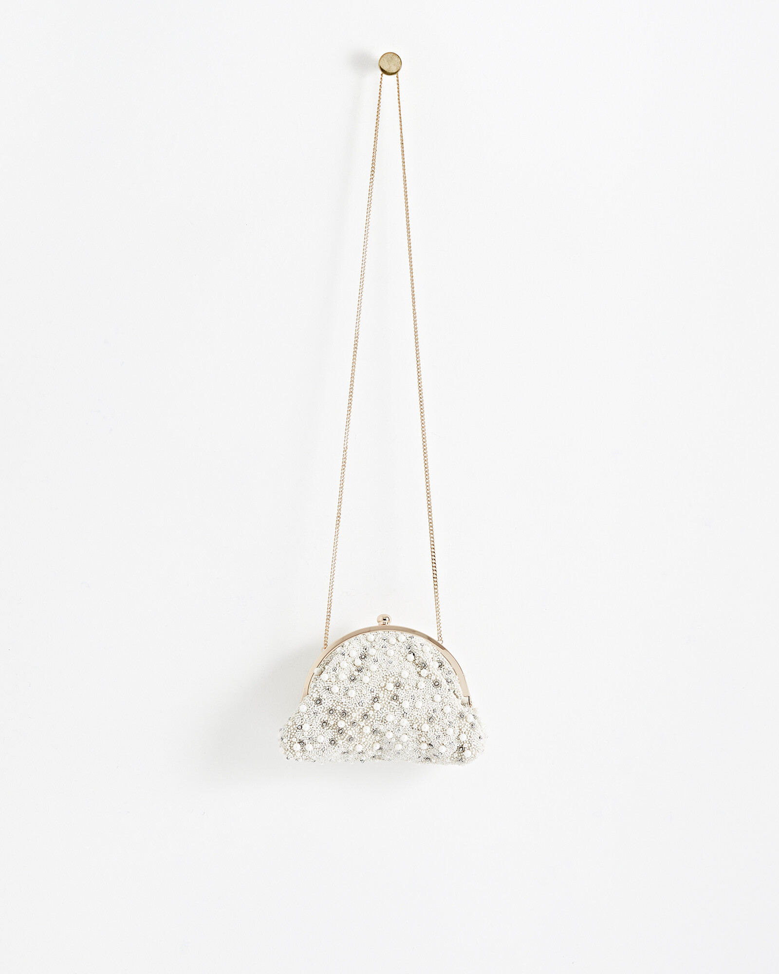 Anchored from a gold chain strap, this crossbody bag has a half moon silhouette adorned with white beads, faux pearls and glittering gems for a sophisticated and shimmering addition to your party accessories.