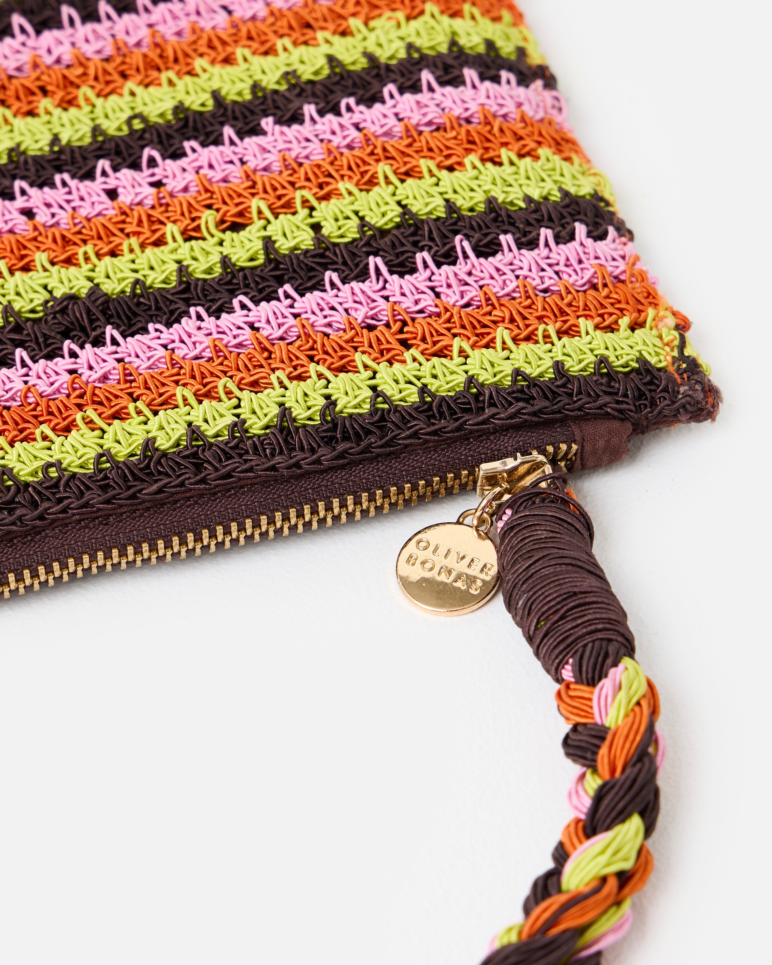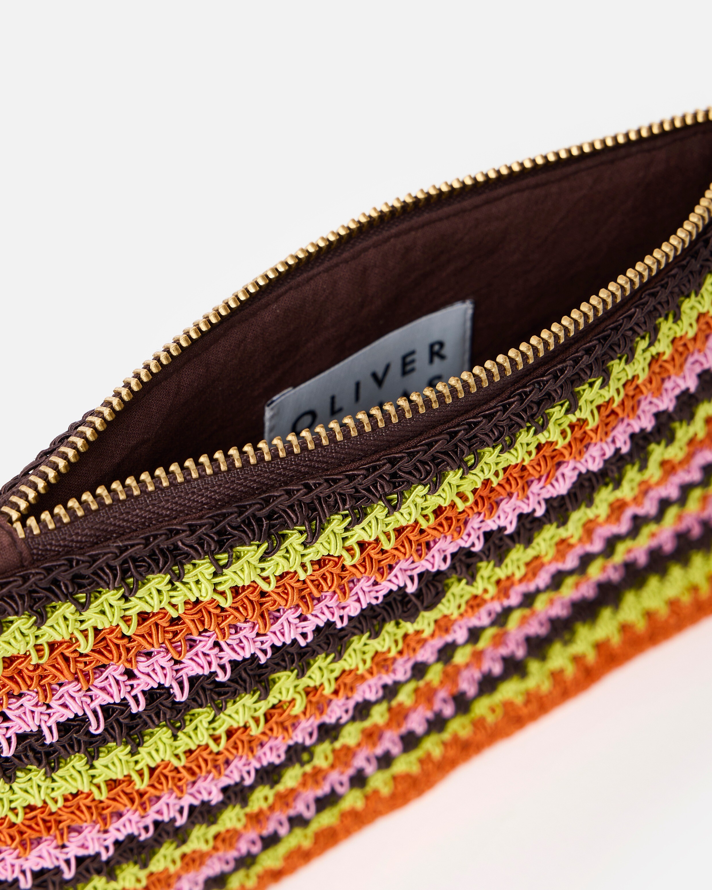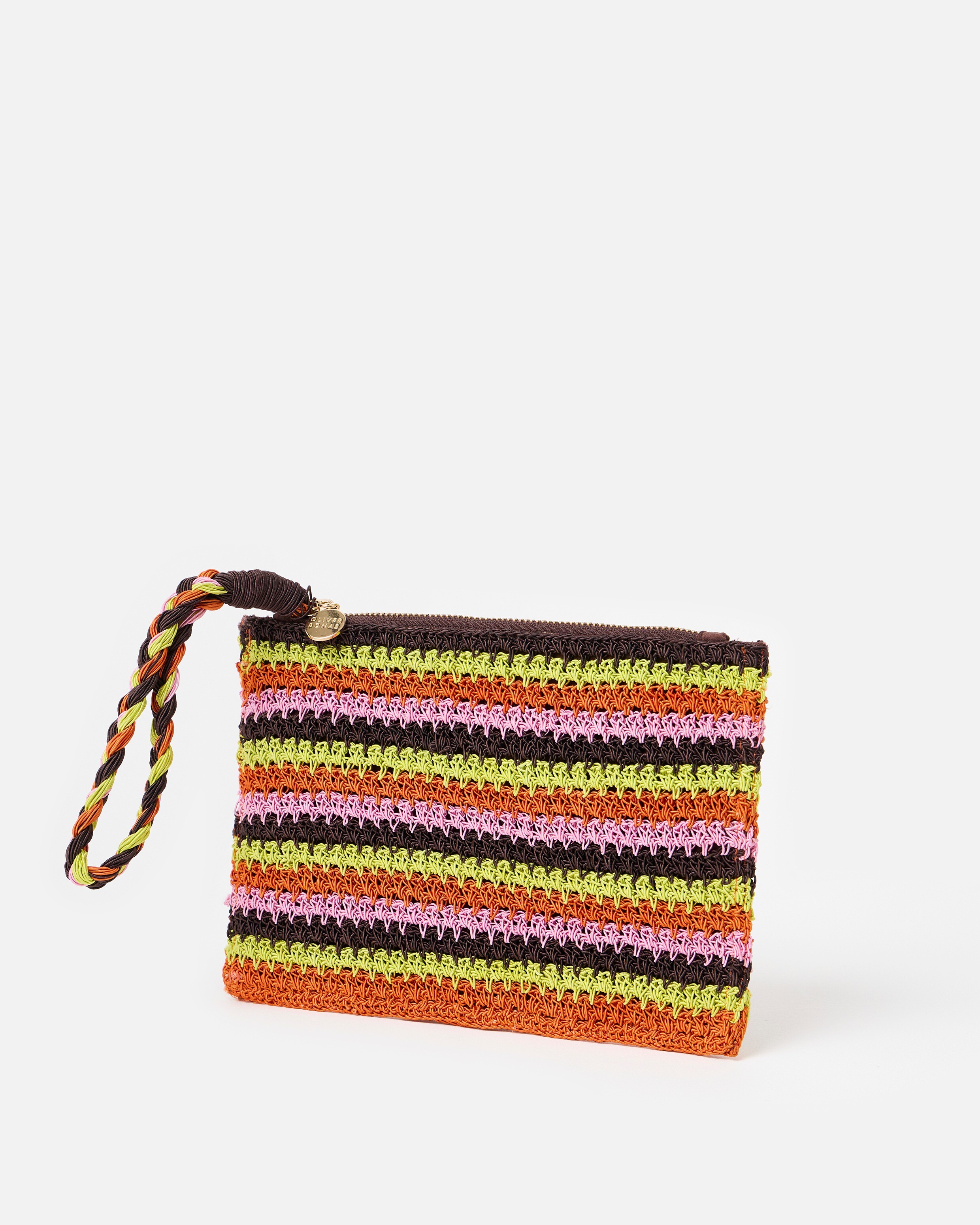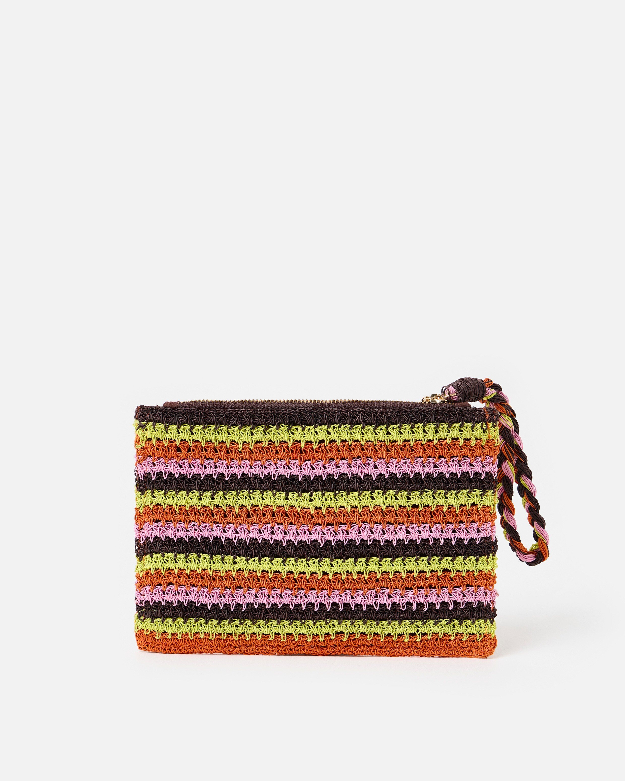 Keep your essentials stylishly secure this summer with our vibrant zipped pouch. Crocheted in a striped pattern with bold pops of brown, green, pink and orange, we've added a convenient wrist strap for hands-free wear (always here for the important design details). Finished with a matching brown lining, gold tone zip and Oliver Bonas logo charm, it's ready to store your lippy, hair grips, cash, keys or emergency snack bar.