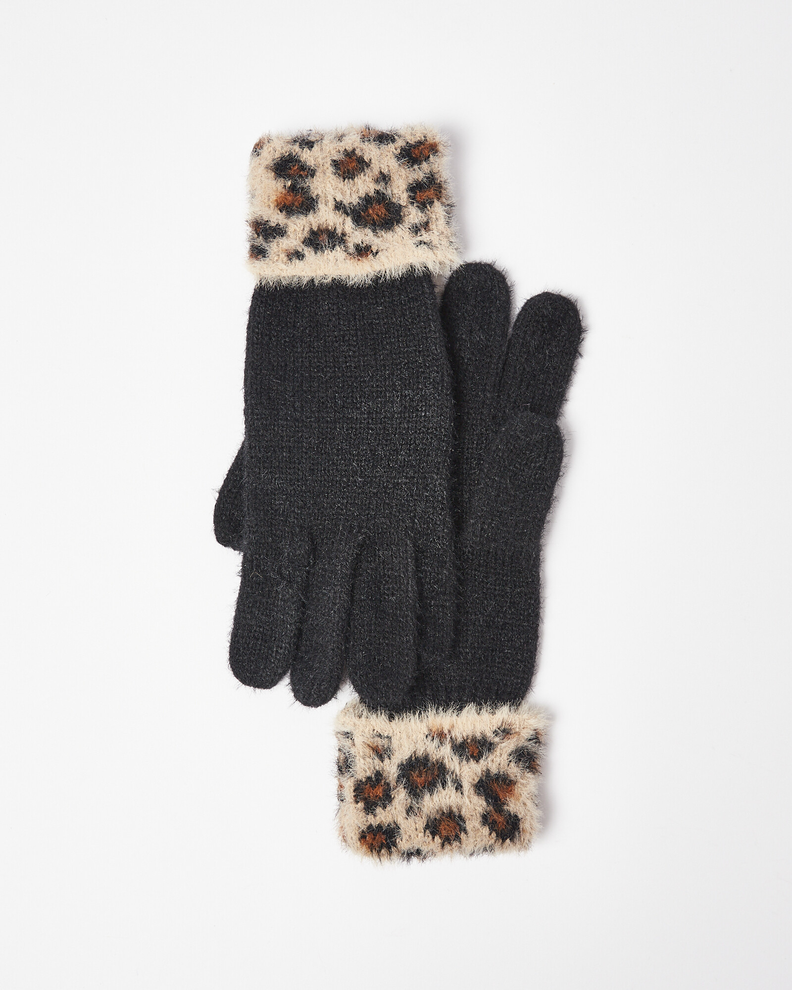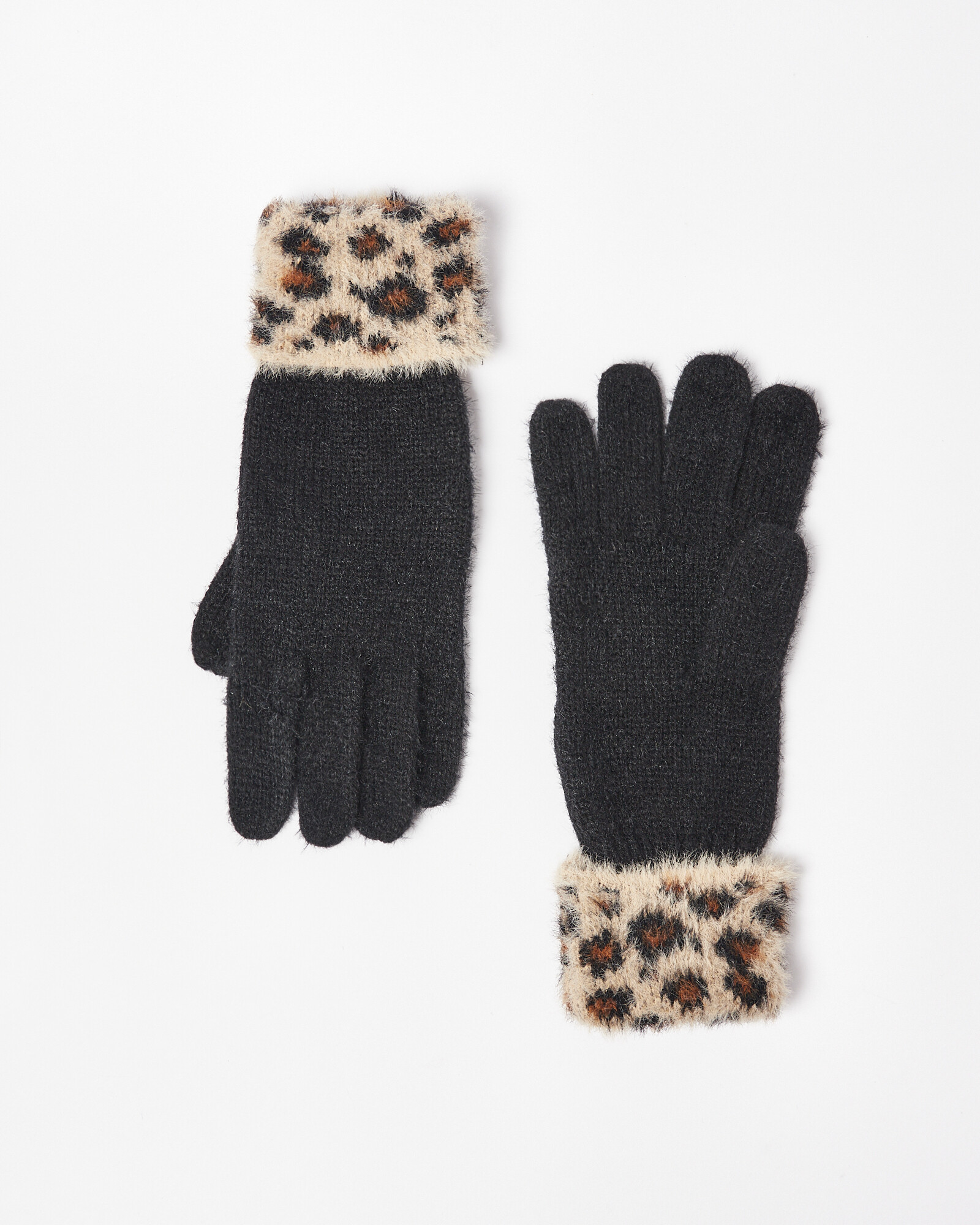In a fluffy black material, these warm gloves have a brown animal print trim to keep you toasty and on trend.