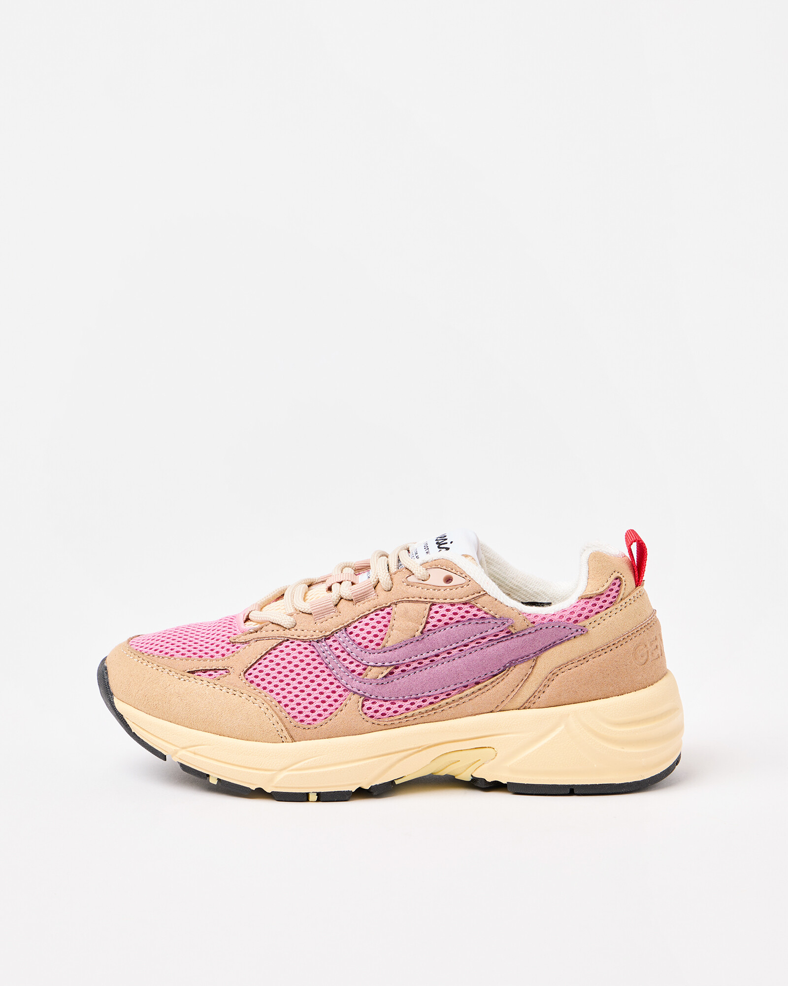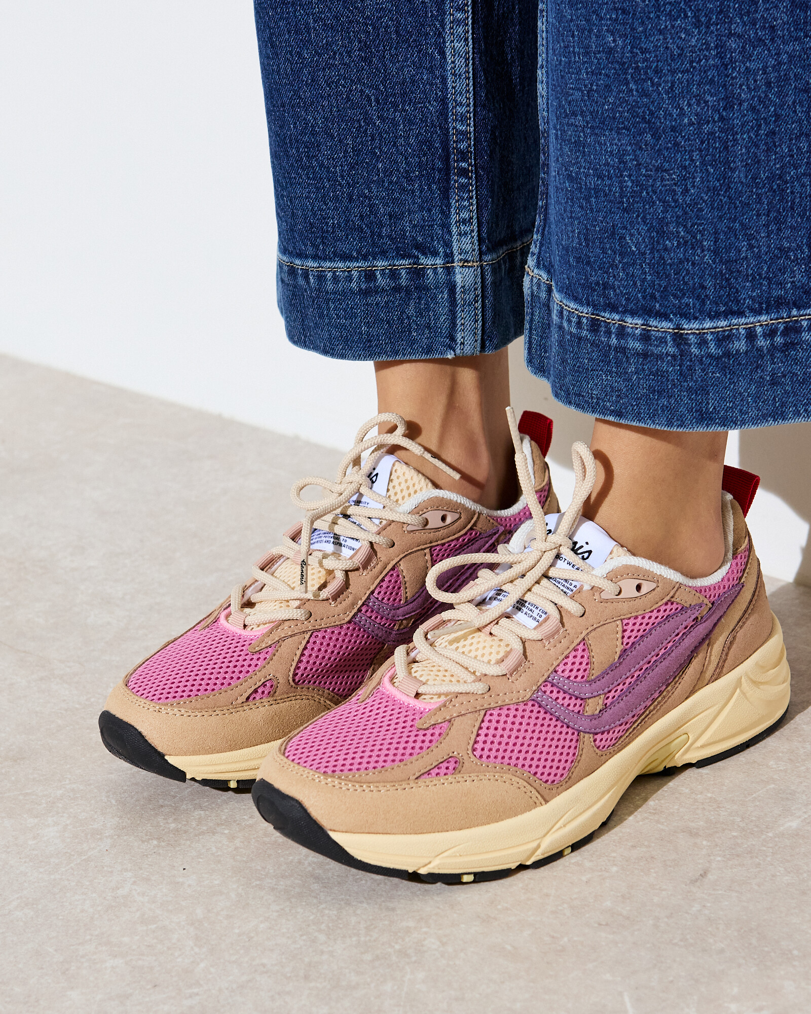 Beige and pink chunky mesh trainers made from BIOWAVE Sugar Cane, a vegan suede made from sugar cane and recycled PET. Inside, Genesis' Cork'in insoles are a combination of recycled PU foam and FSC-certified cork, providing extra comfort. The laces and seams are also made from 100% recycled PET bottles.