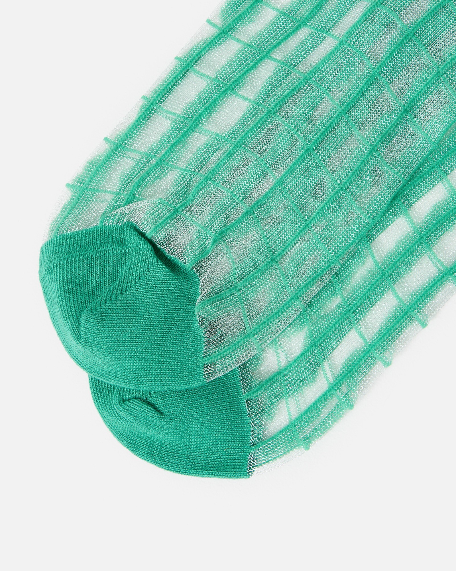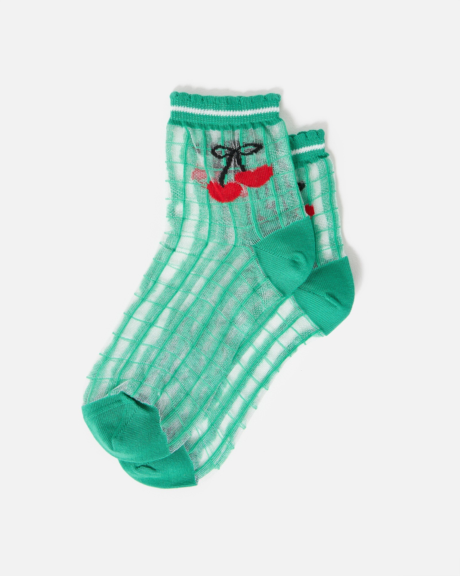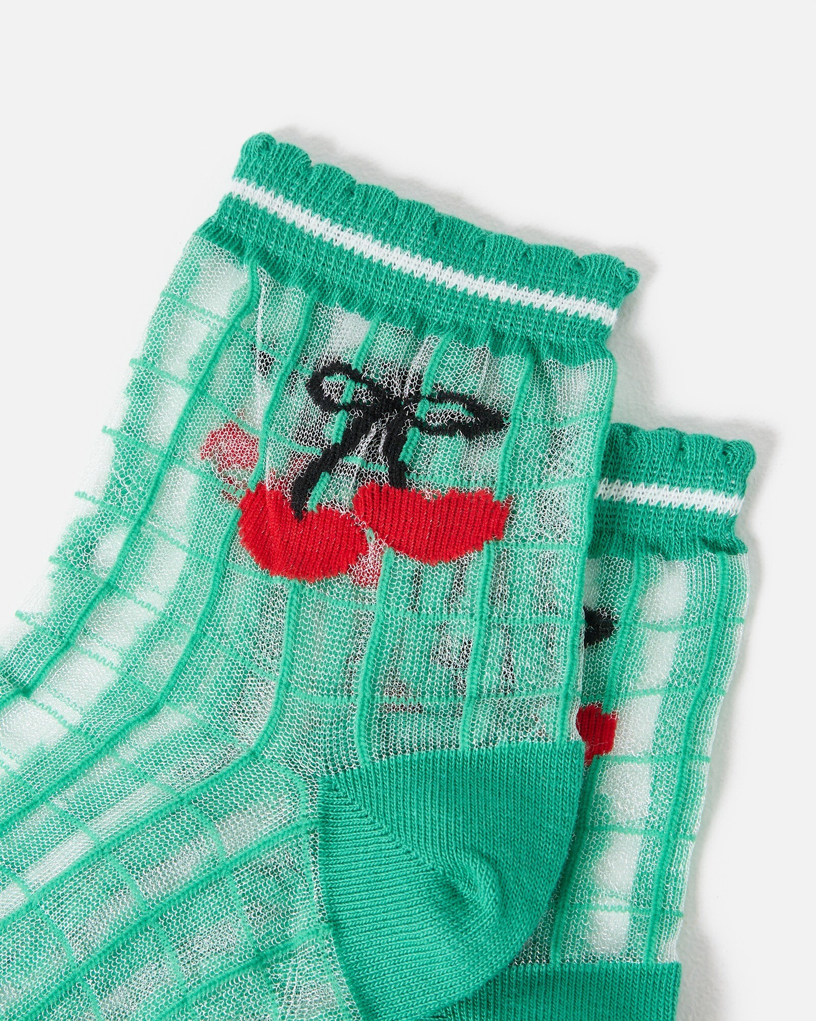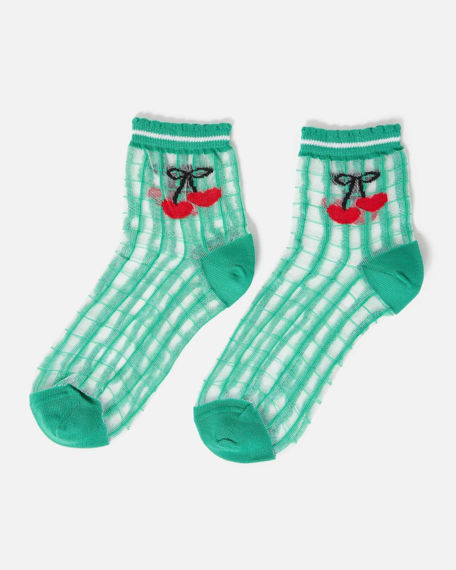 Because everyday basics don't have to be basic. Meet our sheer ankle socks knitted with a fresh green checked pattern accented with playful cherry motifs, featuring solid green toes, heels and striped trims, for ankles that like to make their own statement.