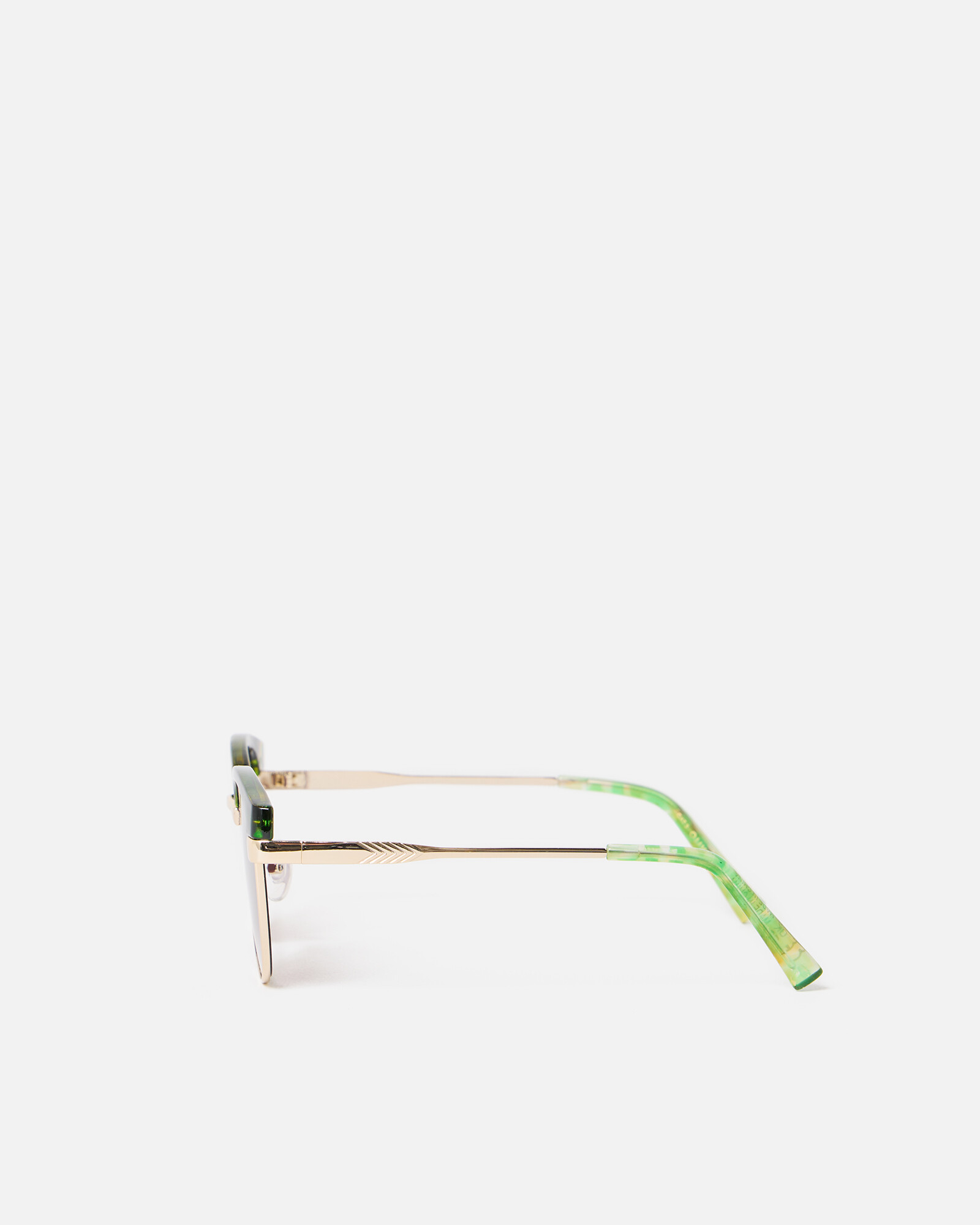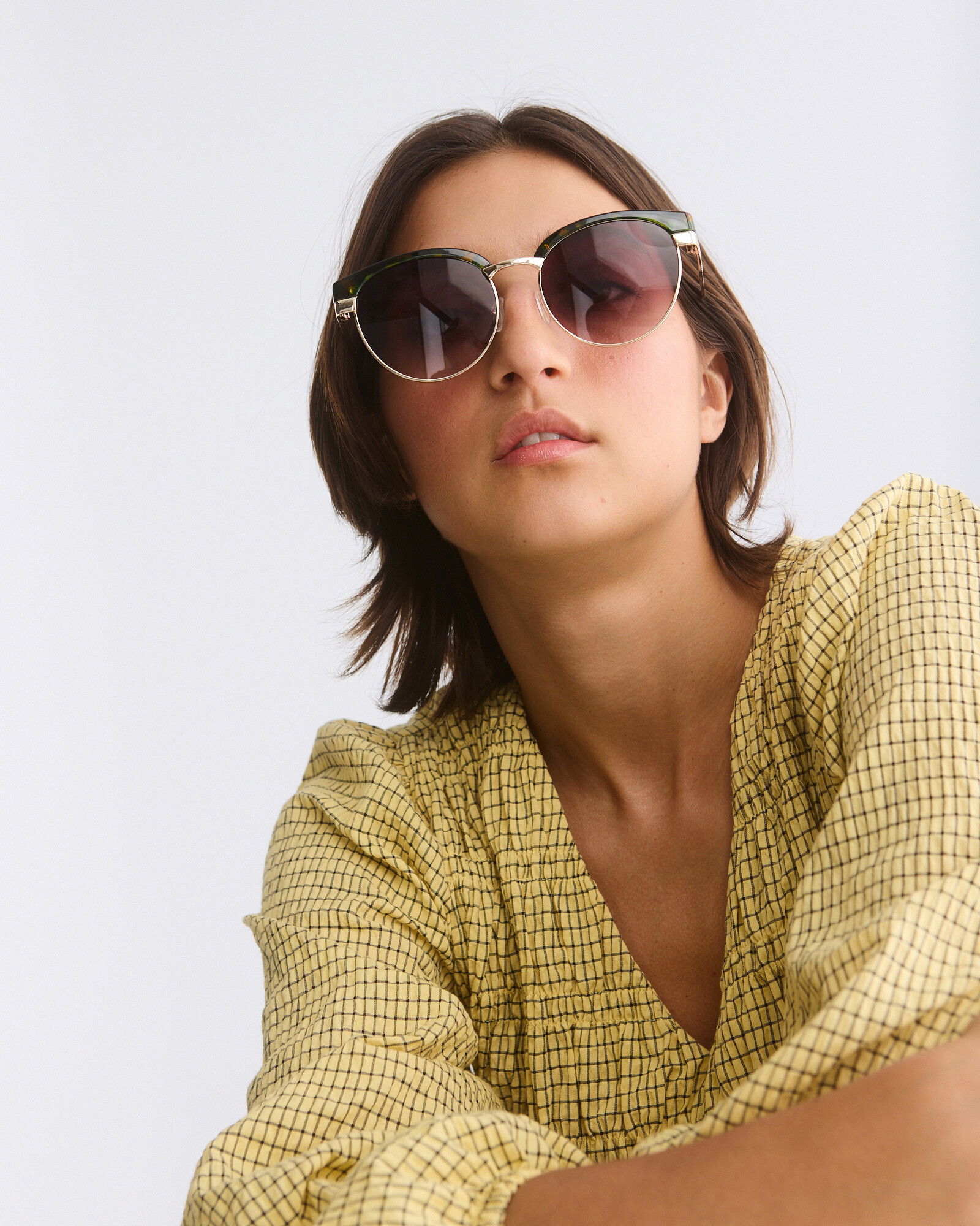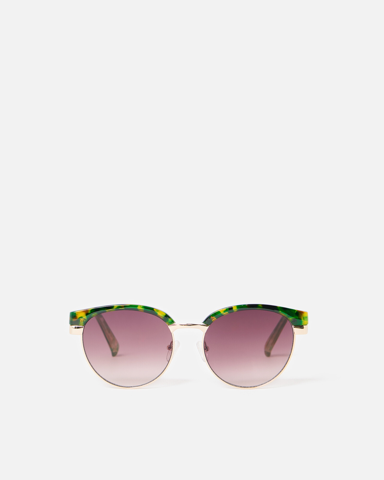 Sunglasses with round lenses, a golden frame and tonal green faux tortoiseshell accents, these shades are an essential for summer and holiday escapes.