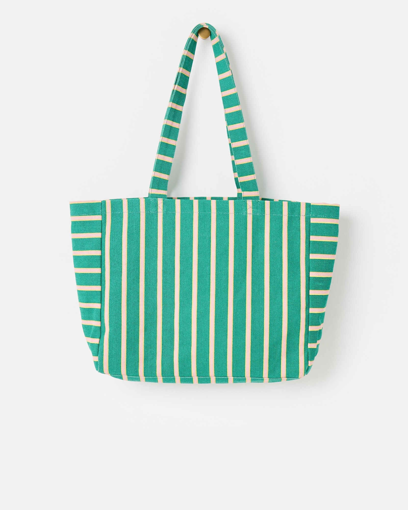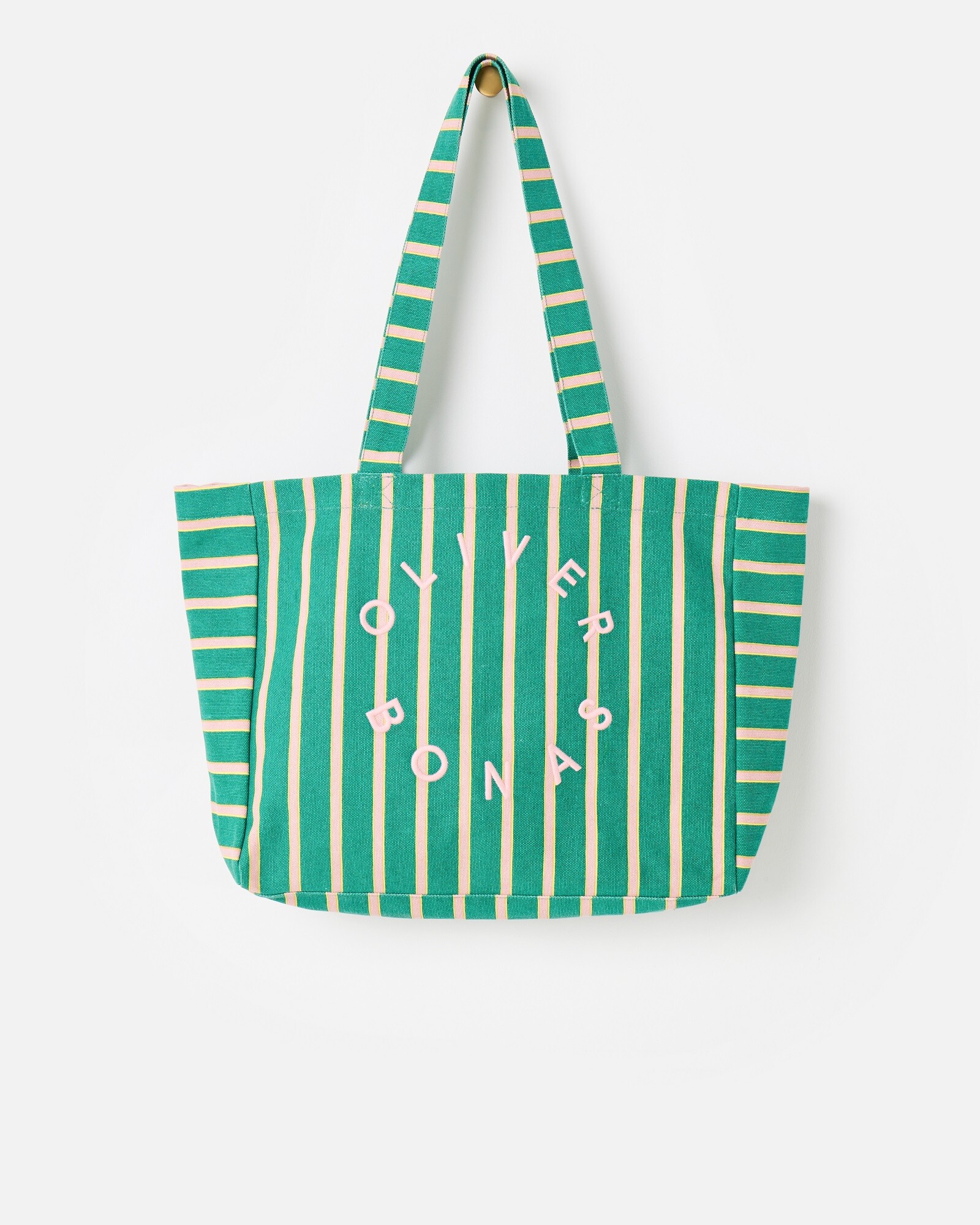 Green fabric tote bag in a light pink striped pattern with a yellow trim, with matching shoulder handles, an interior pocket and light pink embroidered Oliver Bonas text in a circular design. This roomy shopper bag is an ideal grab-and-go option to hold everything you need for the day.