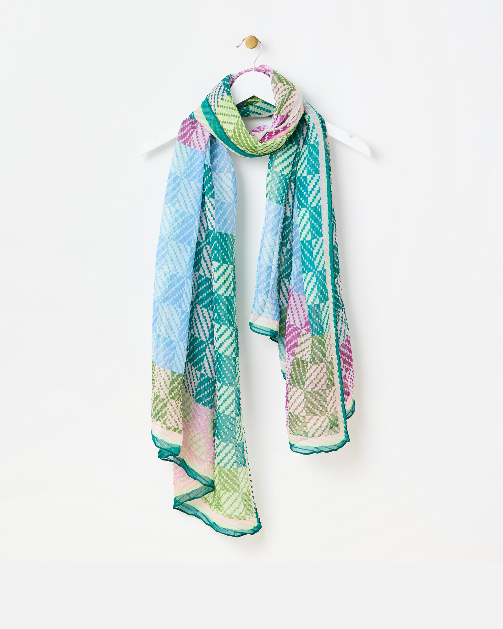 Lightweight scarf in a tonal green and pink chequerboard pattern with a pleated finish.