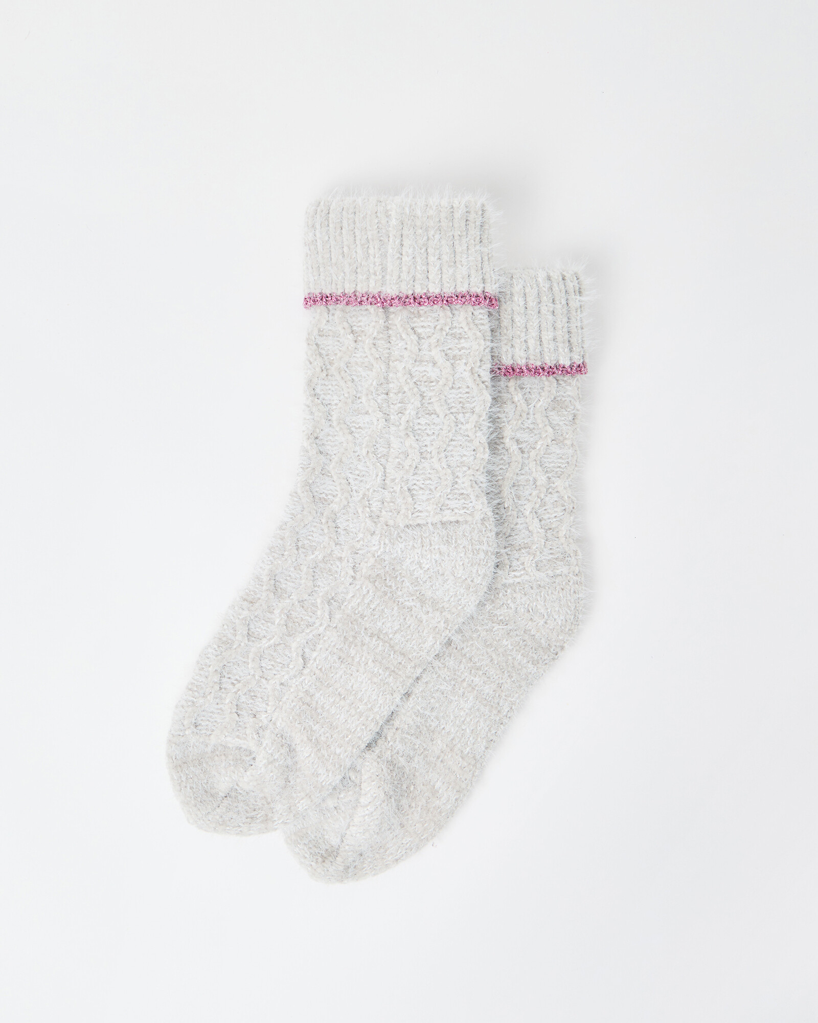 Cosy chenille socks knitted with grey eyelash yarn in a cable pattern and a pink metallic trim.