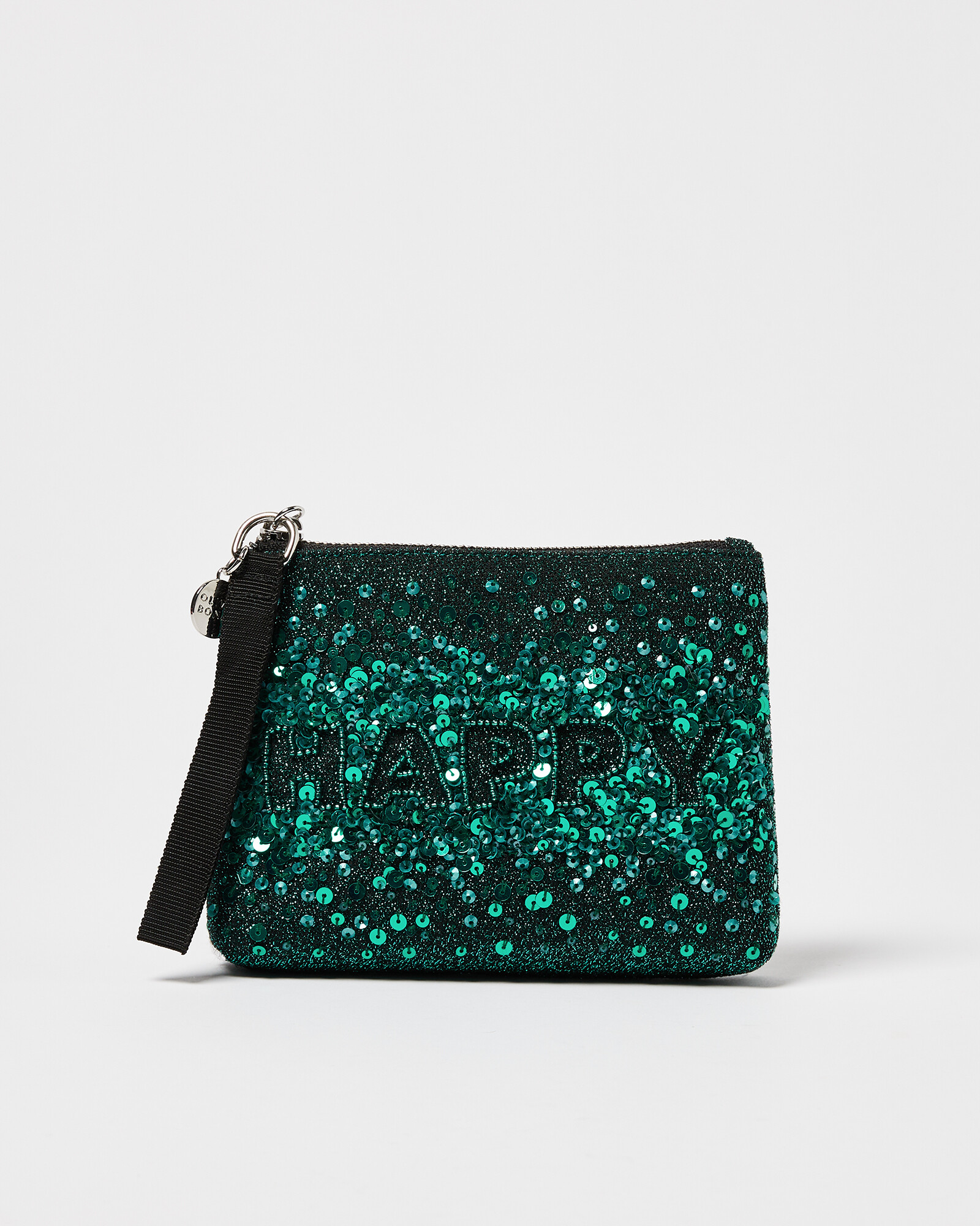 Mood-boosting pouch with green beads and sequins, logo cham and black strap.