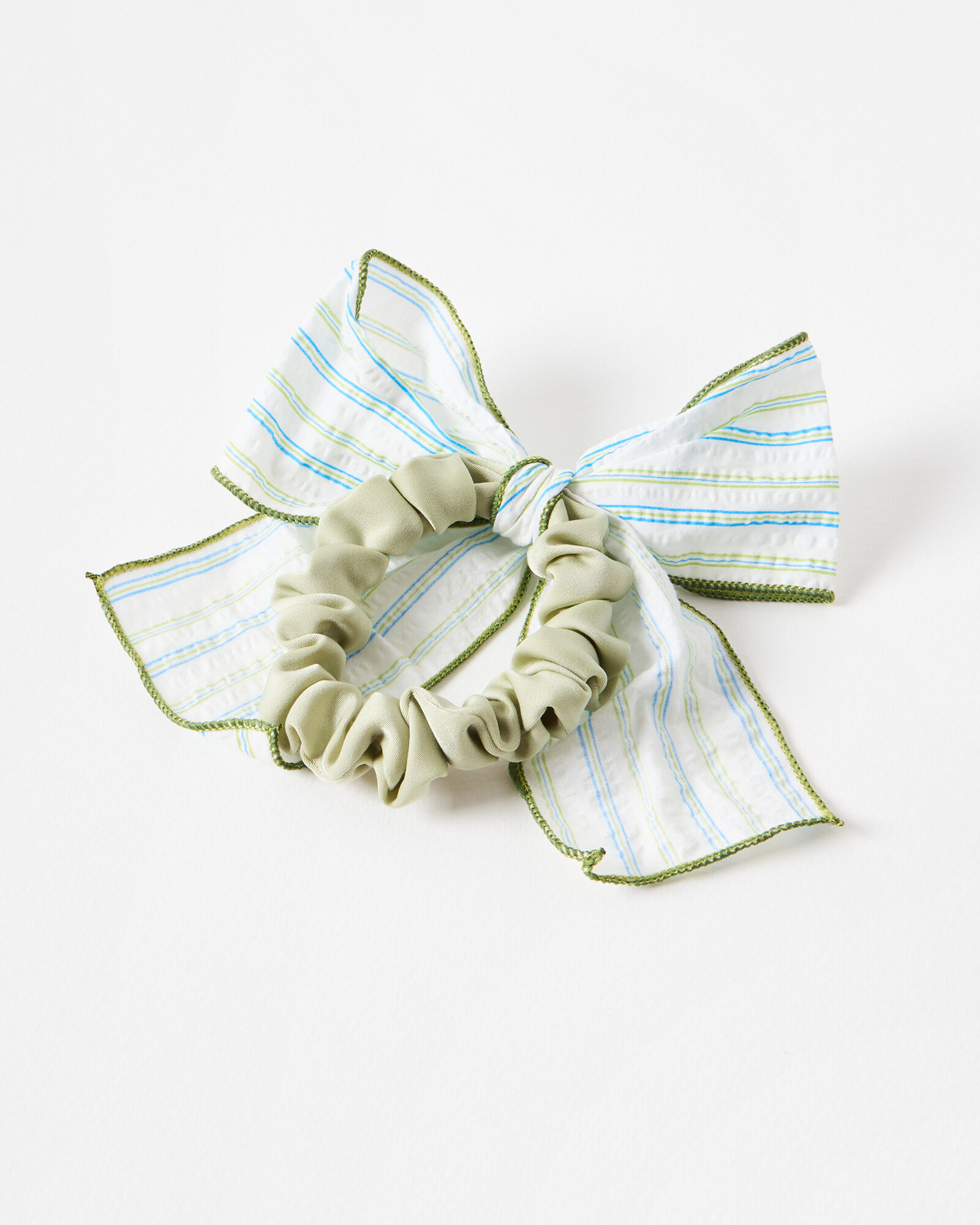 Sage green hair scrunchie with a white bow detail, in a blue and green striped pattern with an embroidered green trim.