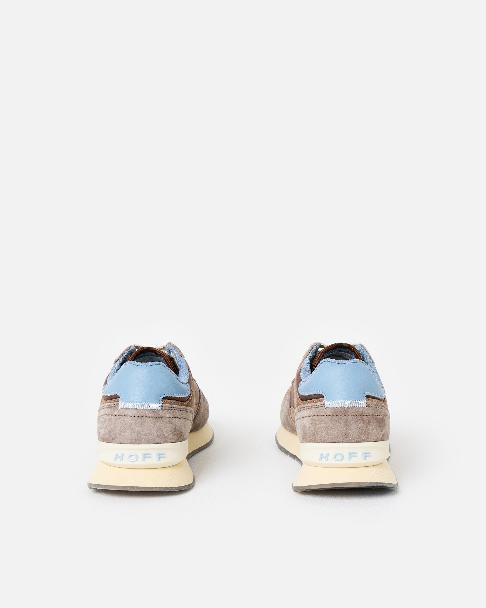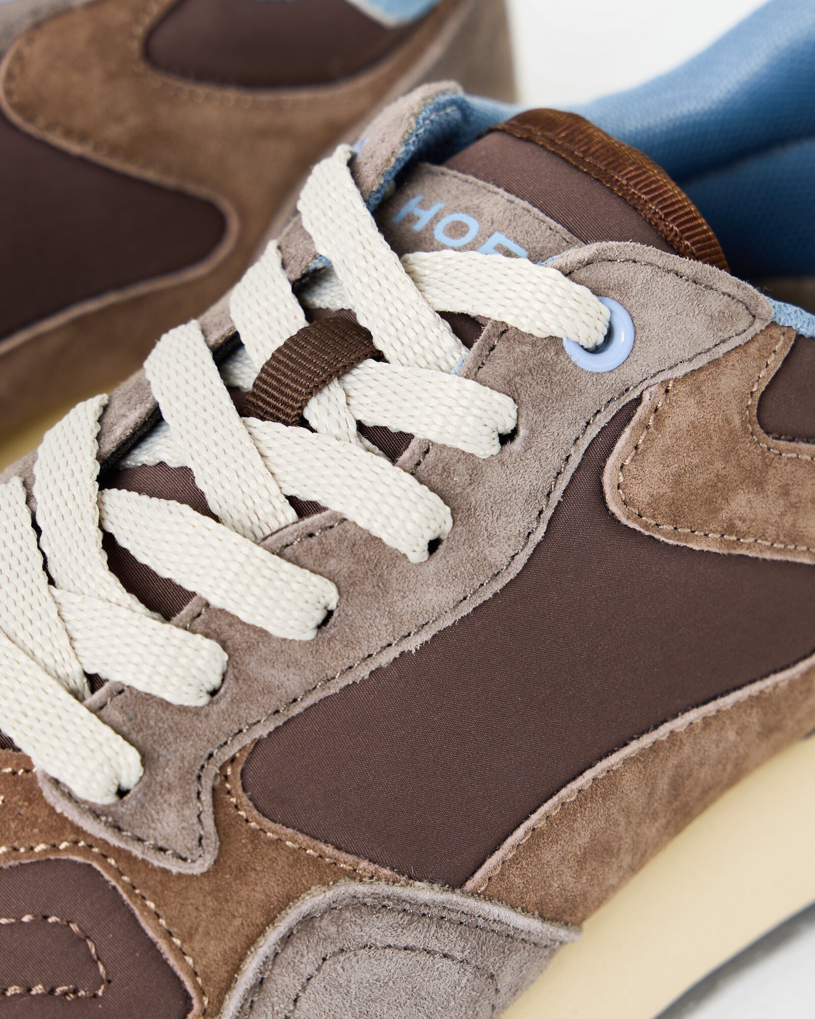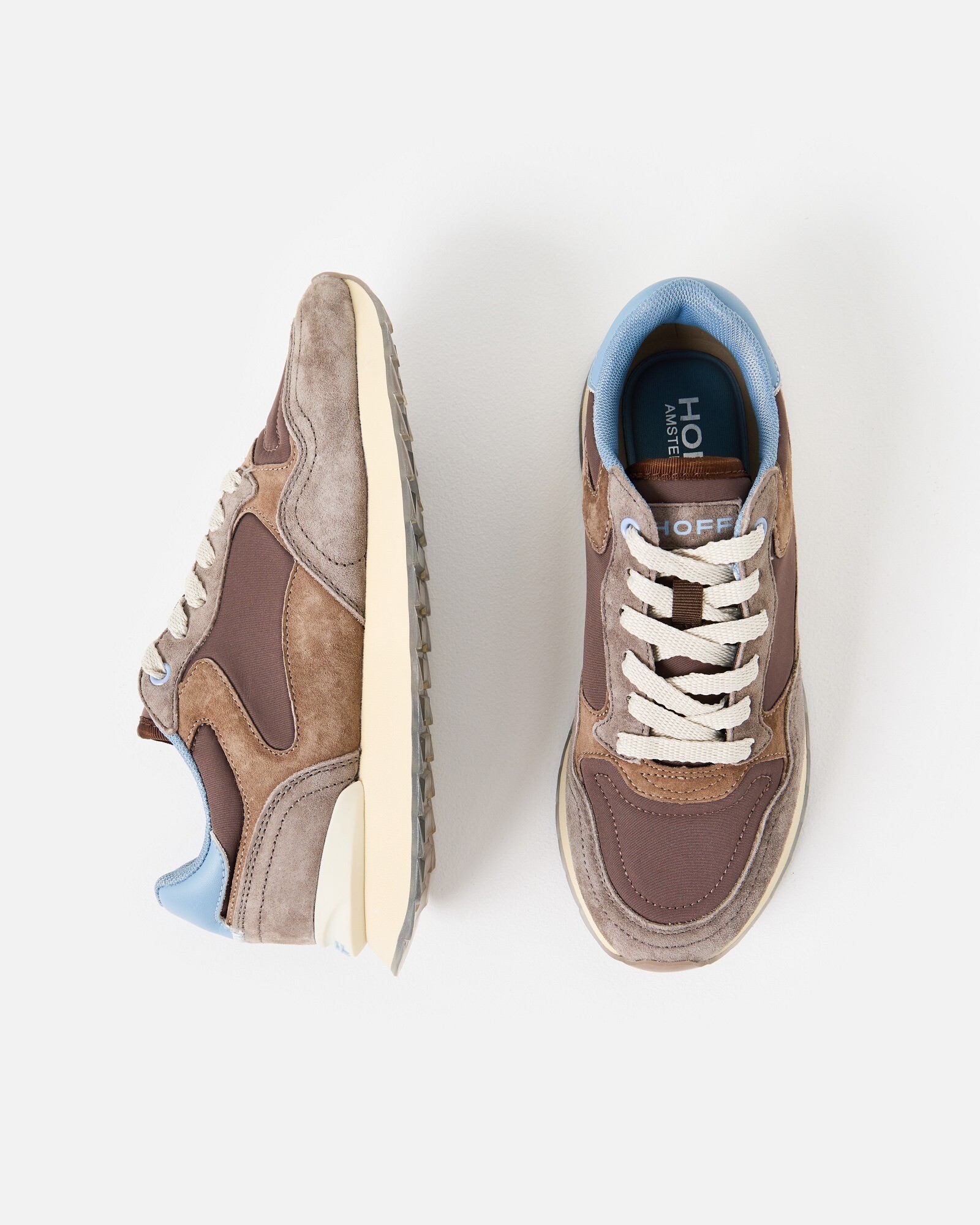 These retro-style Hoff trainers pair chocolate brown suede with nylon panels and a pop of light blue on the heel. With blue logo detailing on the back and tongue, it's complete with cream laces, a memory foam insole for comfortable all-day wear and an Amsterdam sketch on the outsole.