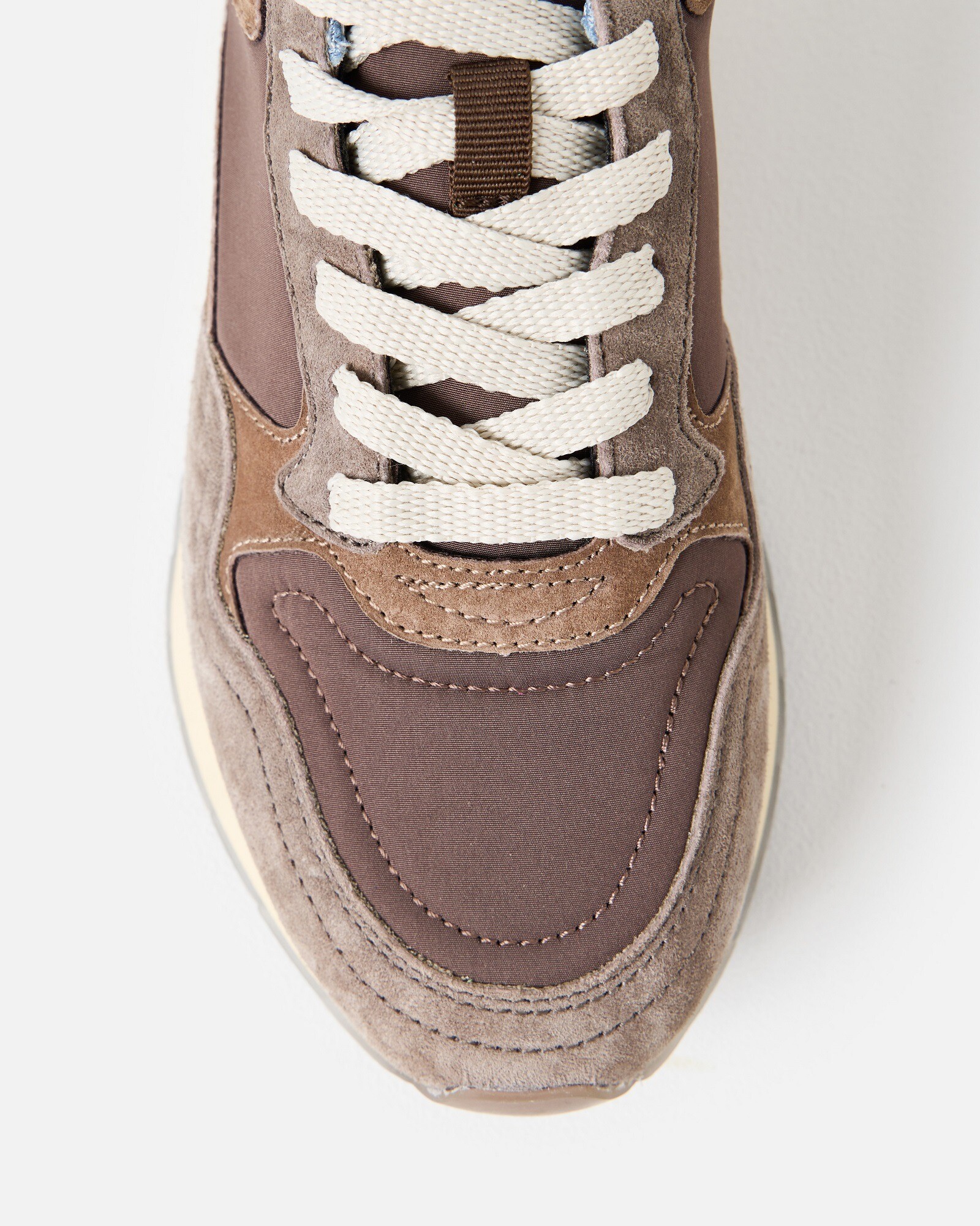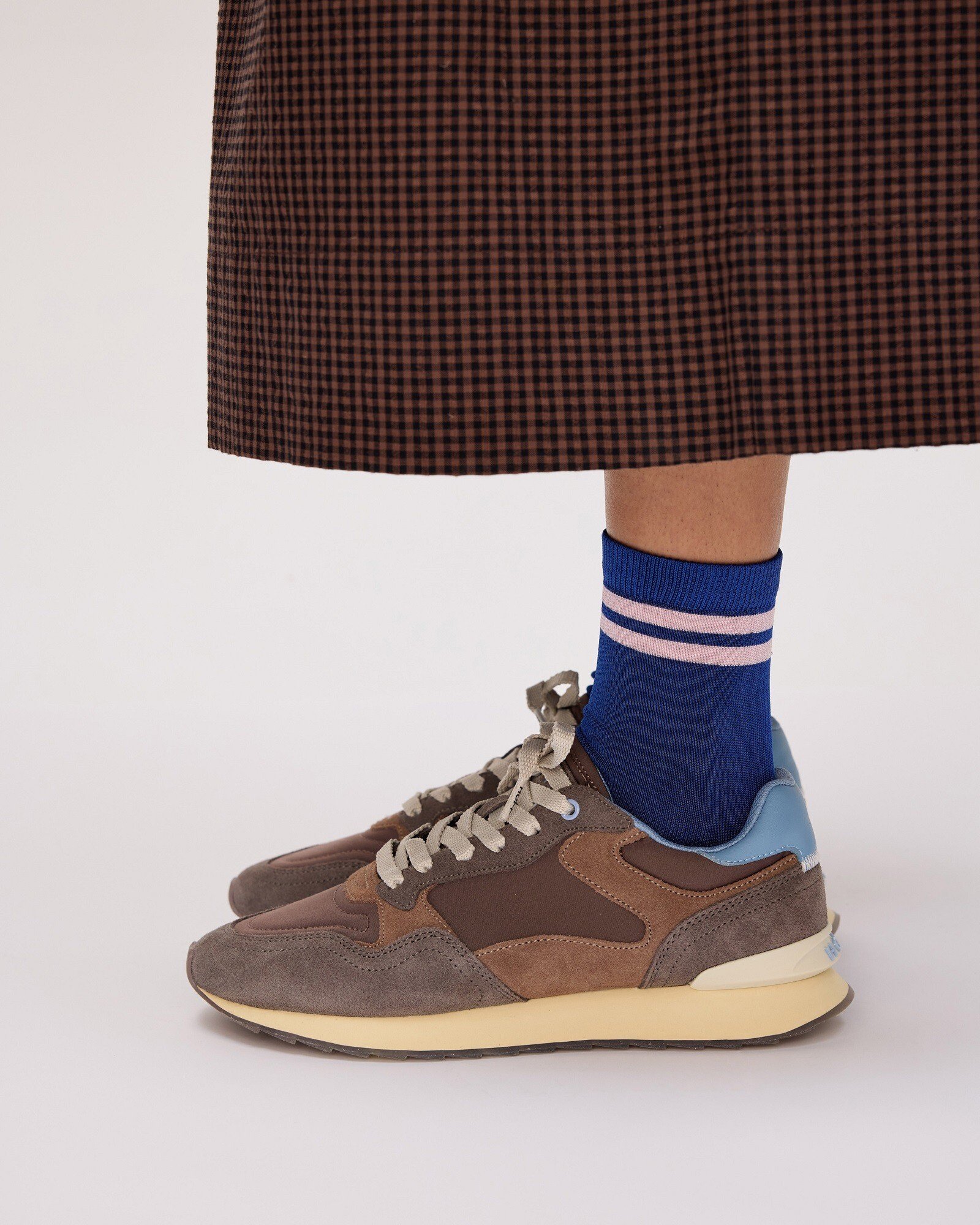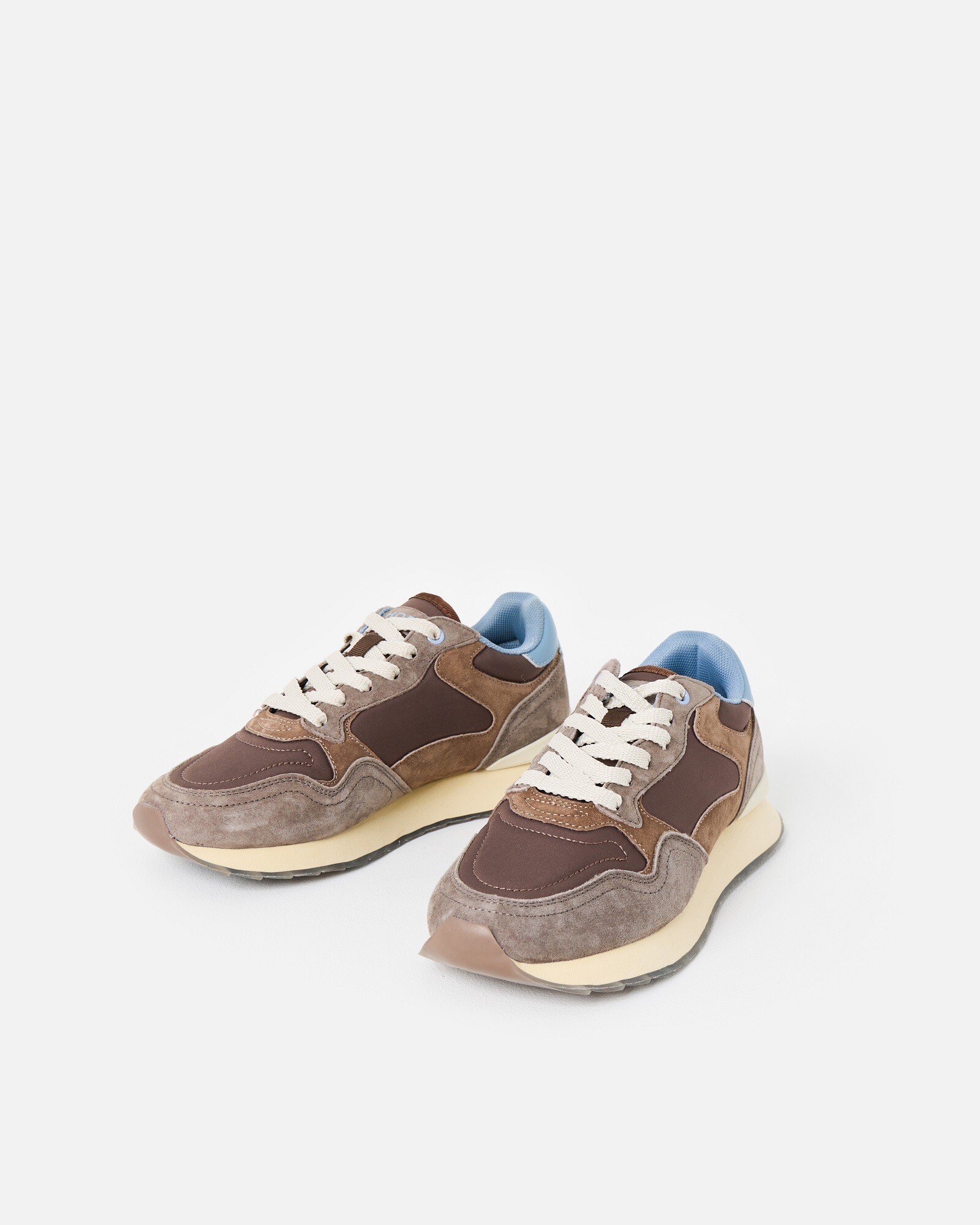 These retro-style Hoff trainers pair chocolate brown suede with nylon panels and a pop of light blue on the heel. With blue logo detailing on the back and tongue, it's complete with cream laces, a memory foam insole for comfortable all-day wear and an Amsterdam sketch on the outsole.