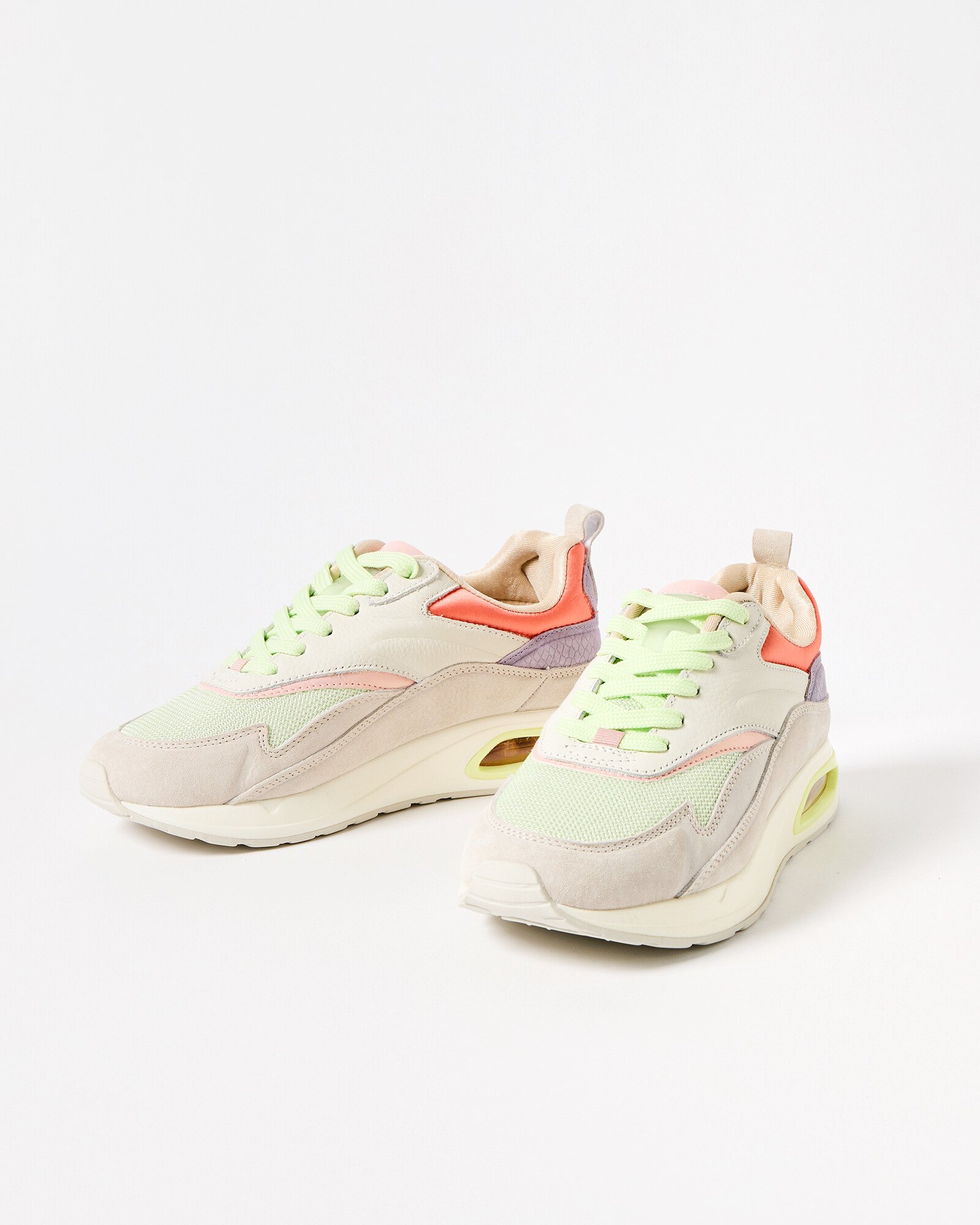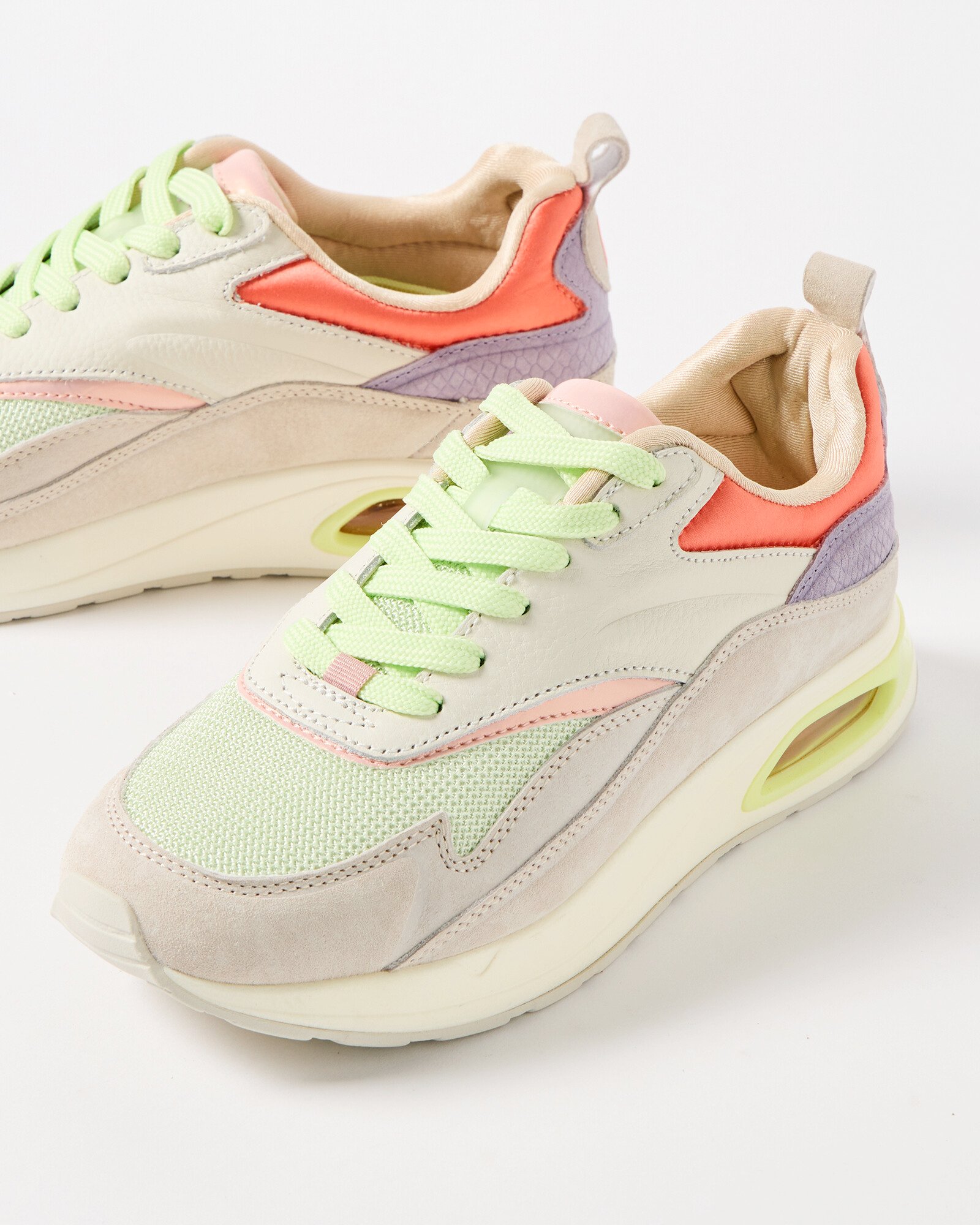 HOFF running trainers made from soft pastel colours, with a utility feel and contrasting mesh, leather and suede panels. Logo detailing sits on the tongue, heel and footbed, with orange satin highlights, memory foam footbed and a 90s-inspired air chamber sole.
